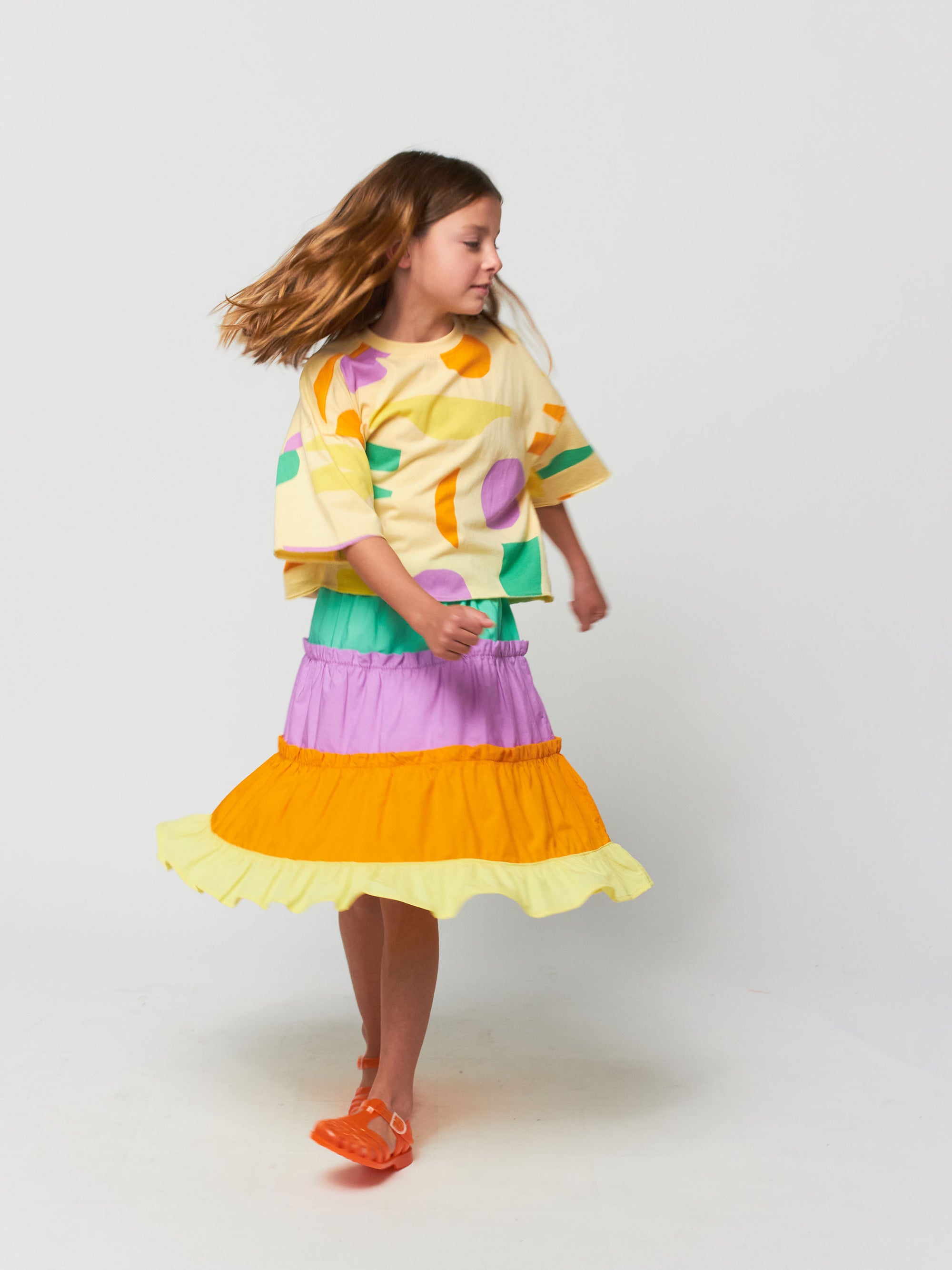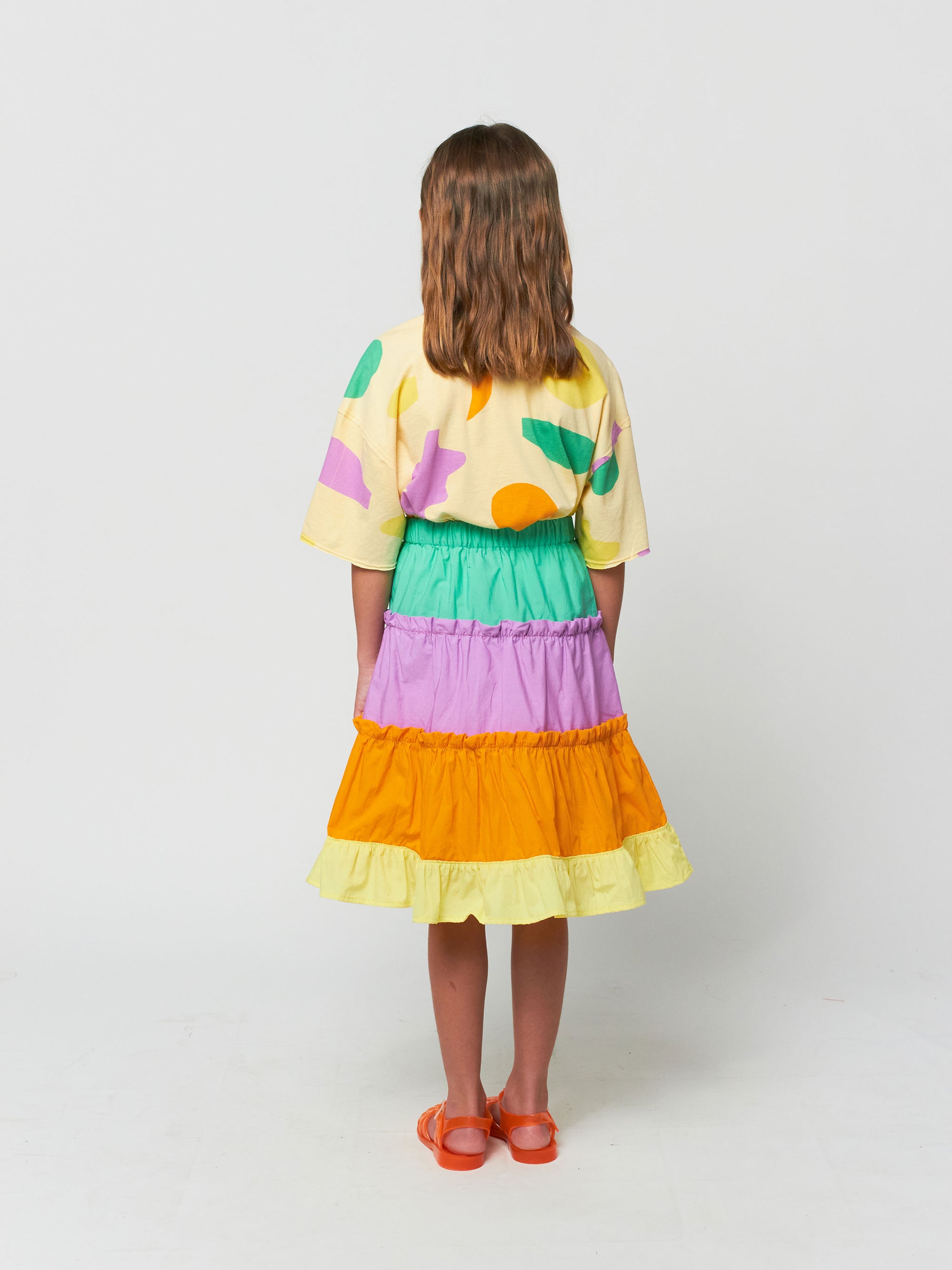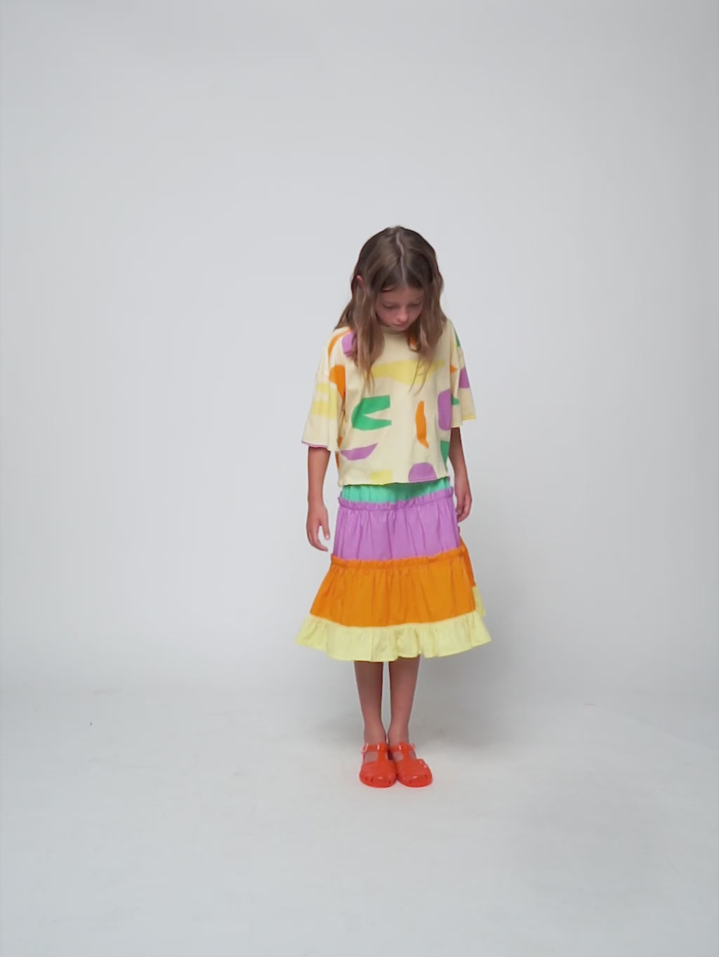 100% cotton multicolor skirt. Designed with elasticated waistband, embroidery, evasé fit, midi length, ruffle hem and ruffled detailing. Made in Spain.