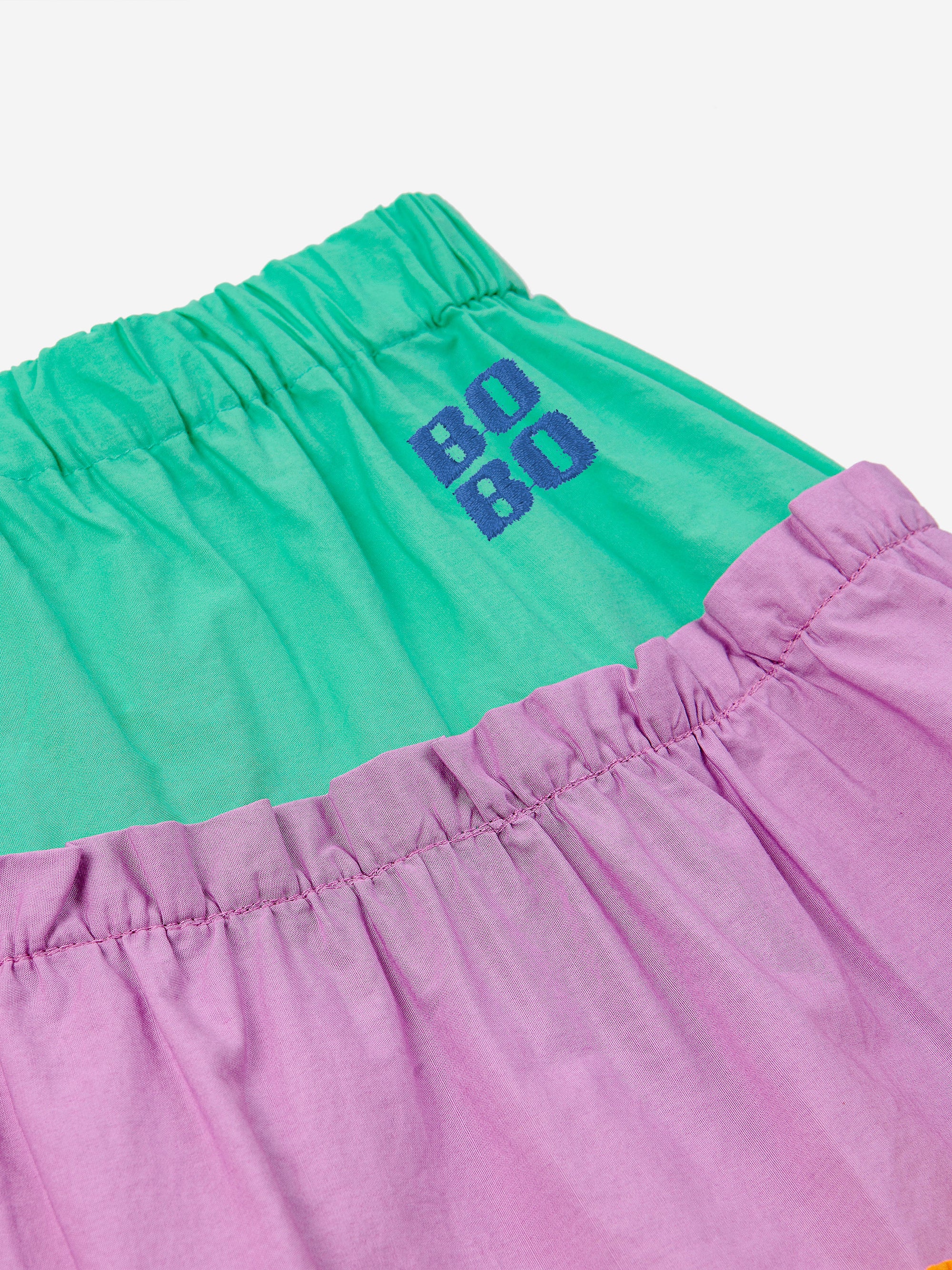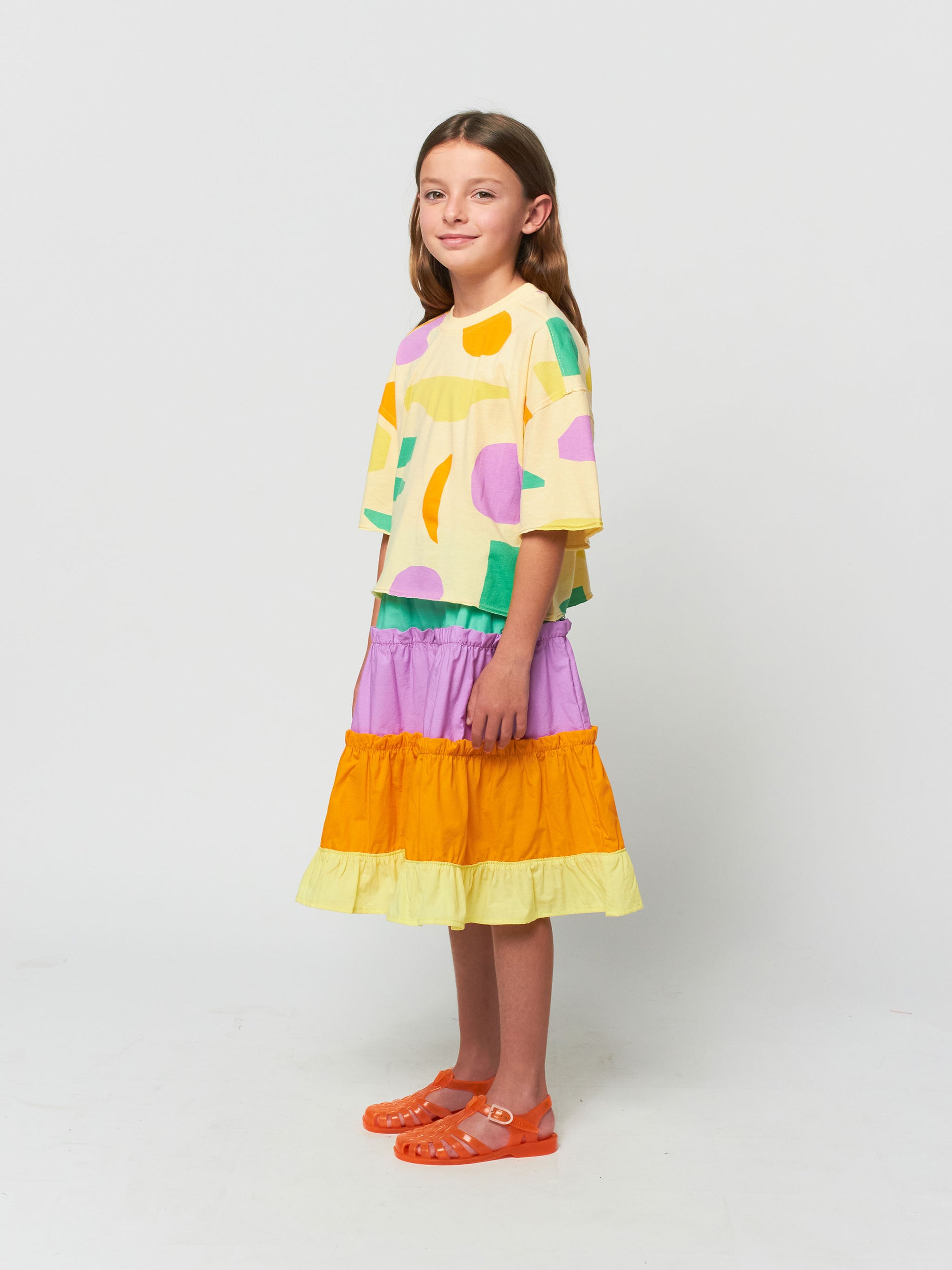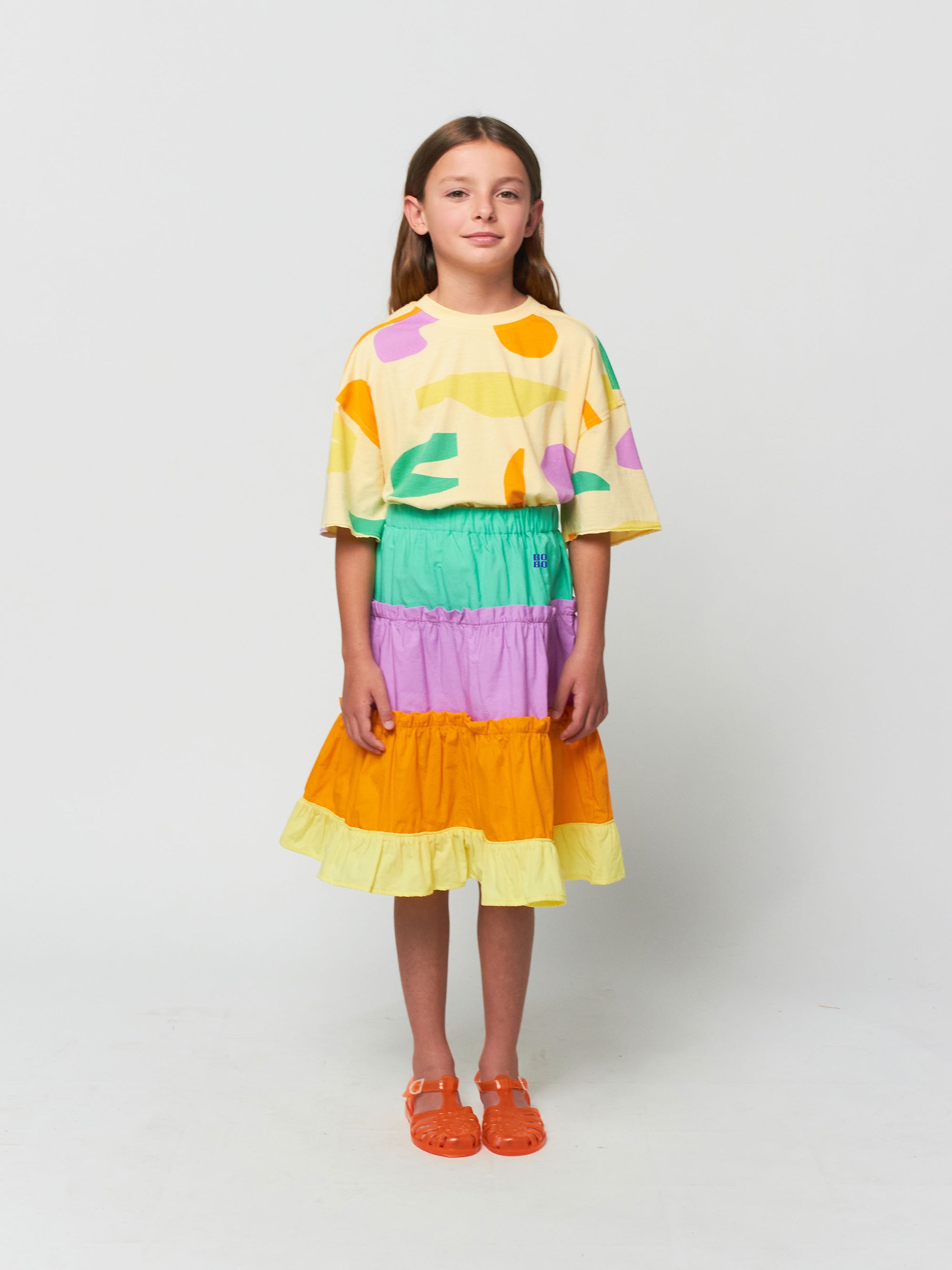 100% cotton multicolor skirt. Designed with elasticated waistband, embroidery, evasé fit, midi length, ruffle hem and ruffled detailing. Made in Spain.