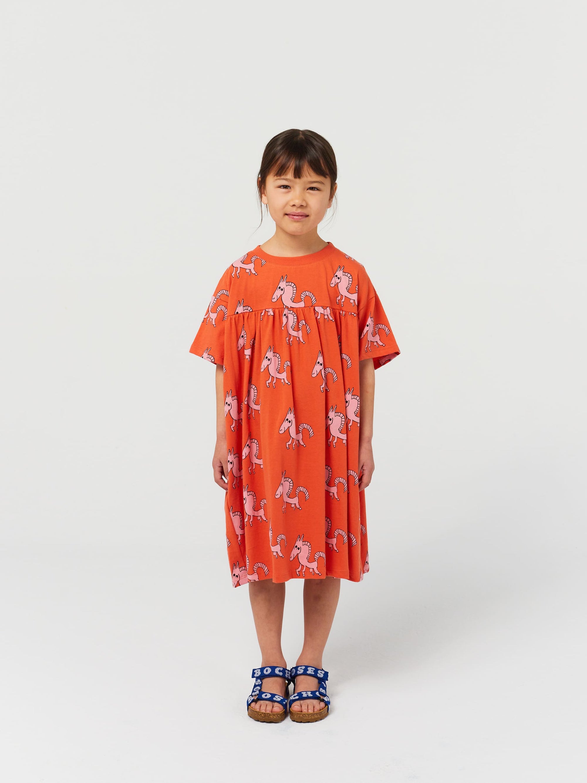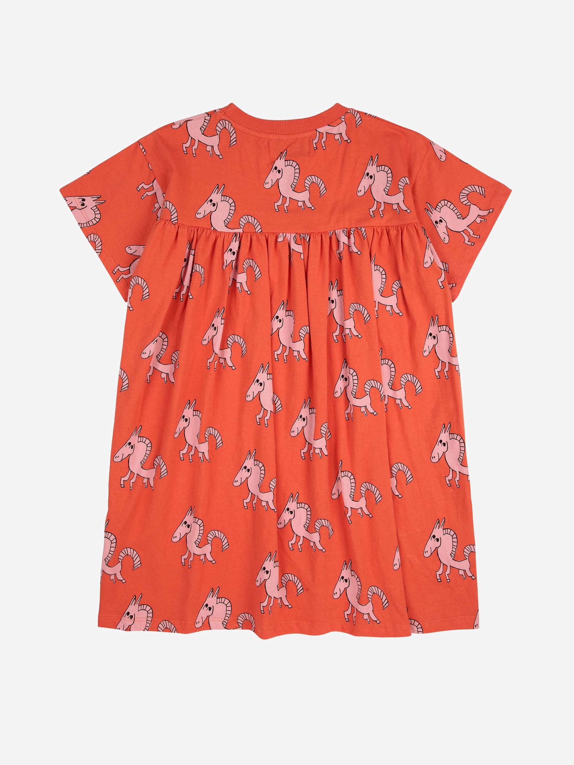 100% organic cotton red dress. Designed with short sleeves, over knee length and round neck. Made in Spain.