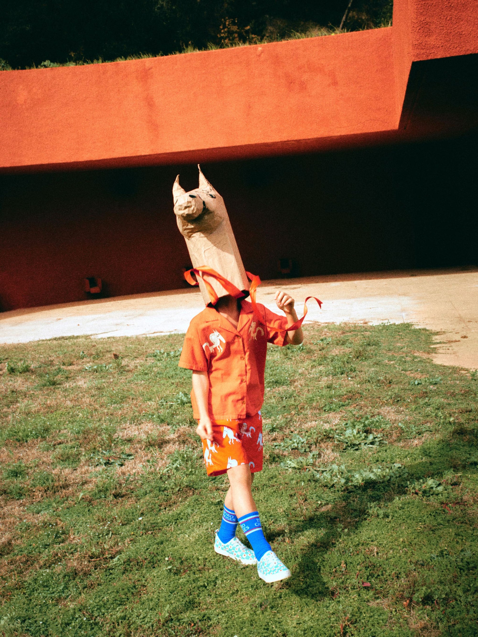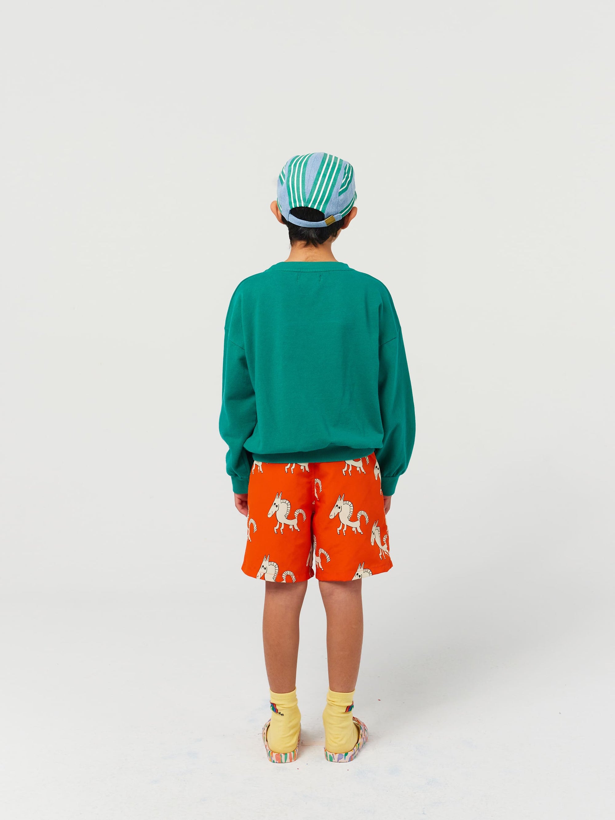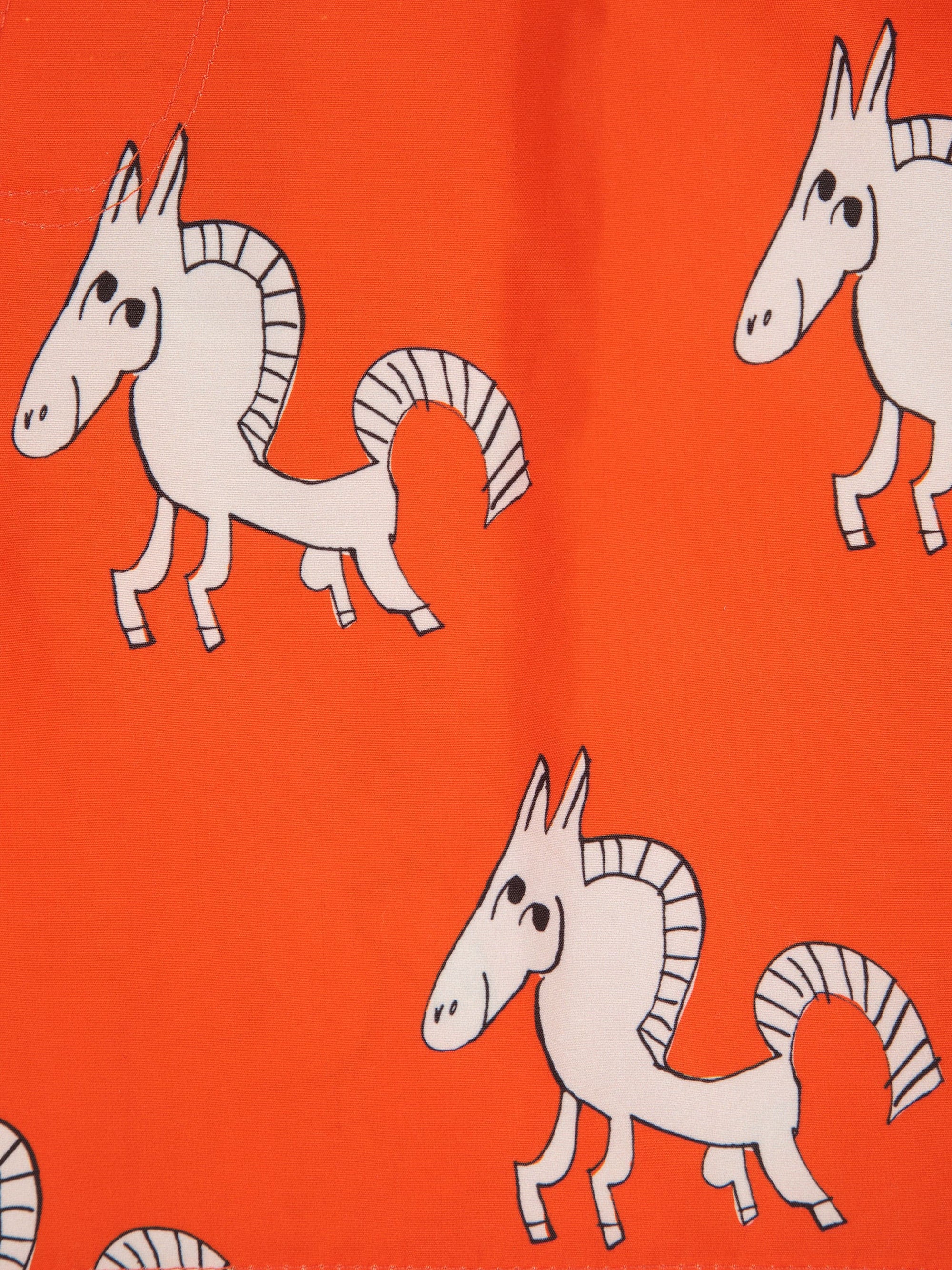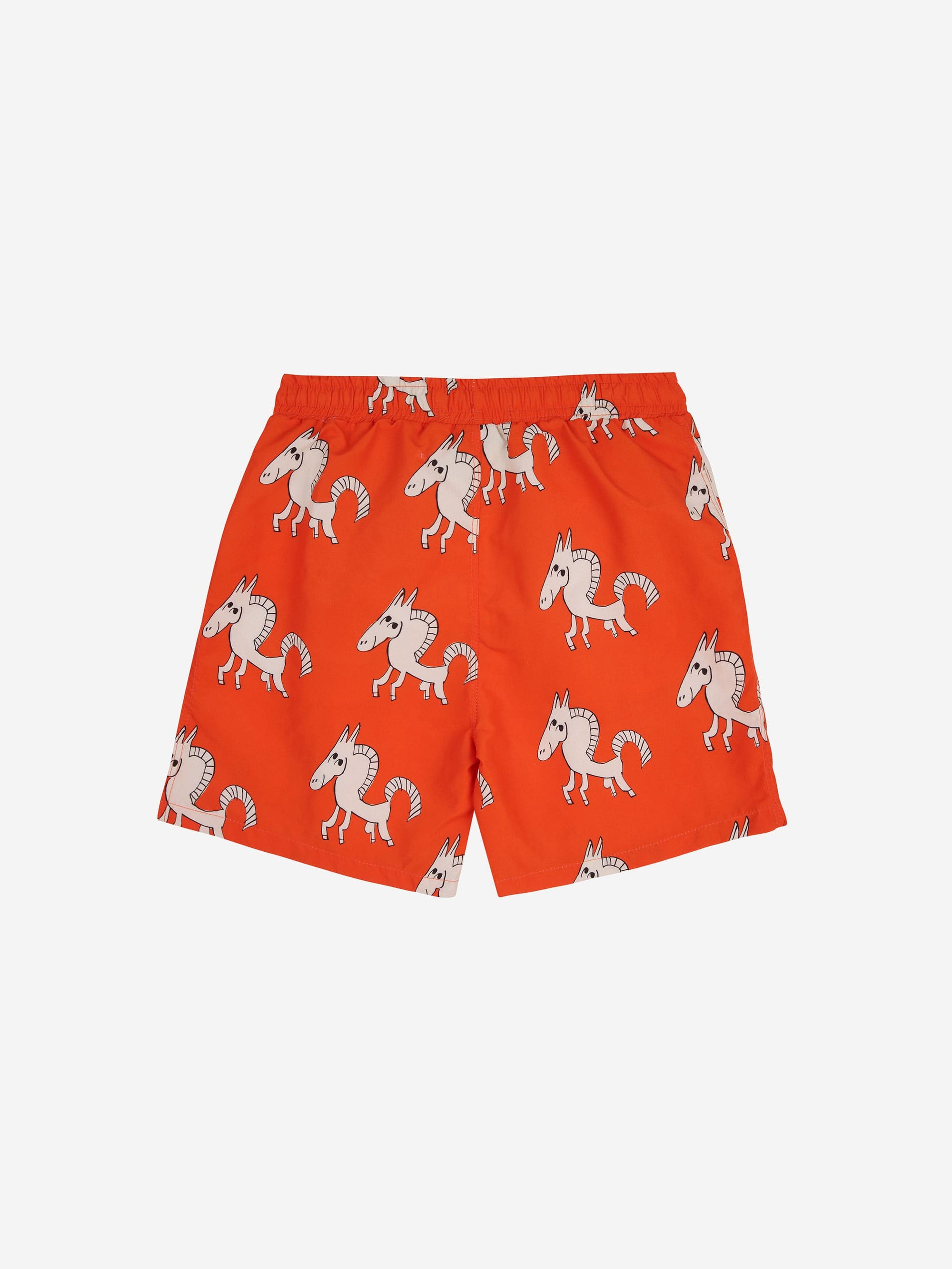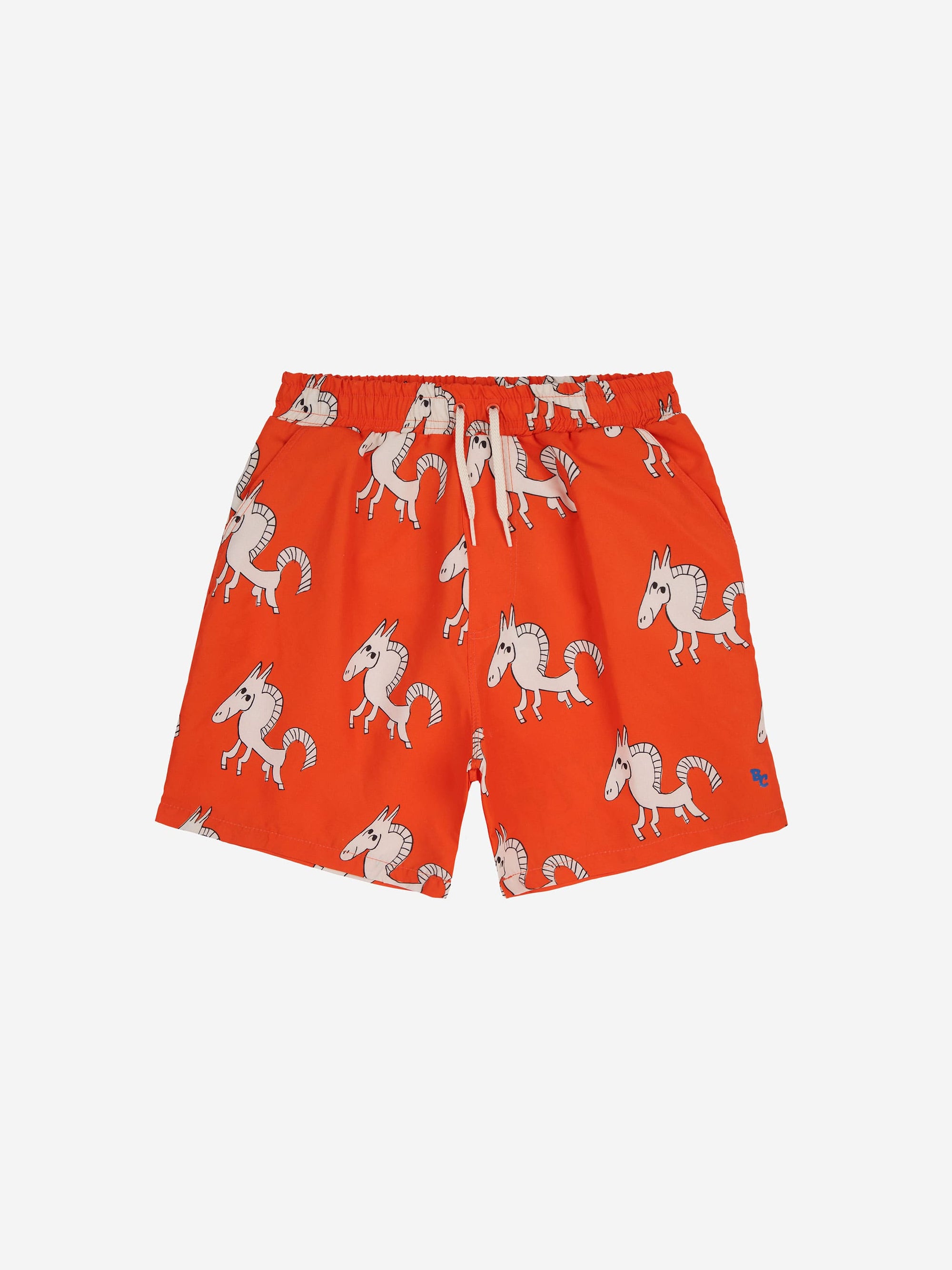 100% recycled polyester red swim bermuda. Designed with adjustable waistband, elasticated waistband and side pocket. Made in Spain.