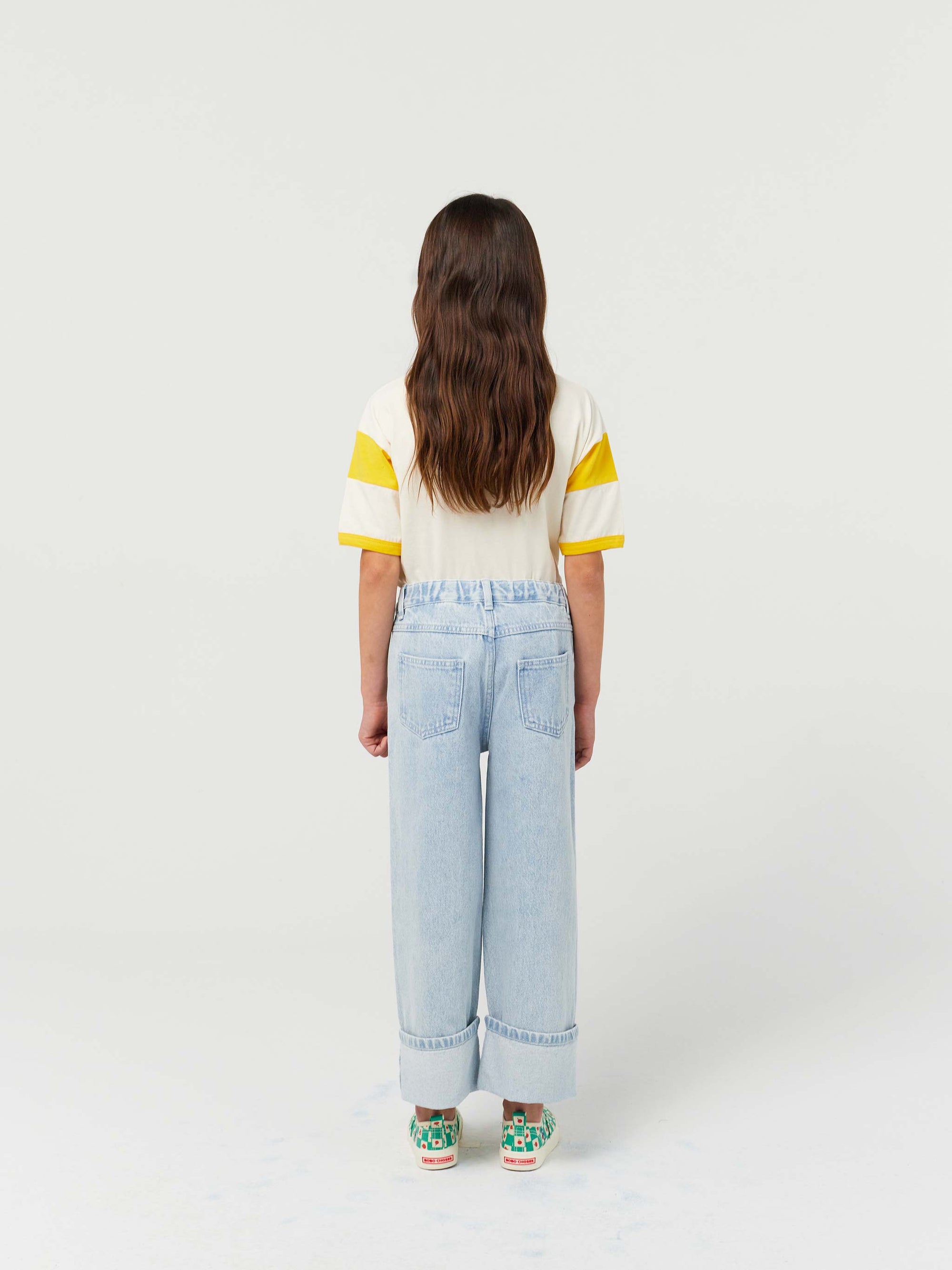 76% cotton, 24% recycled cotton light blue pants. Designed with front button fastening, front zip fastening, side pocket, embroidery, straight fit and turn up hem. Made in Portugal.