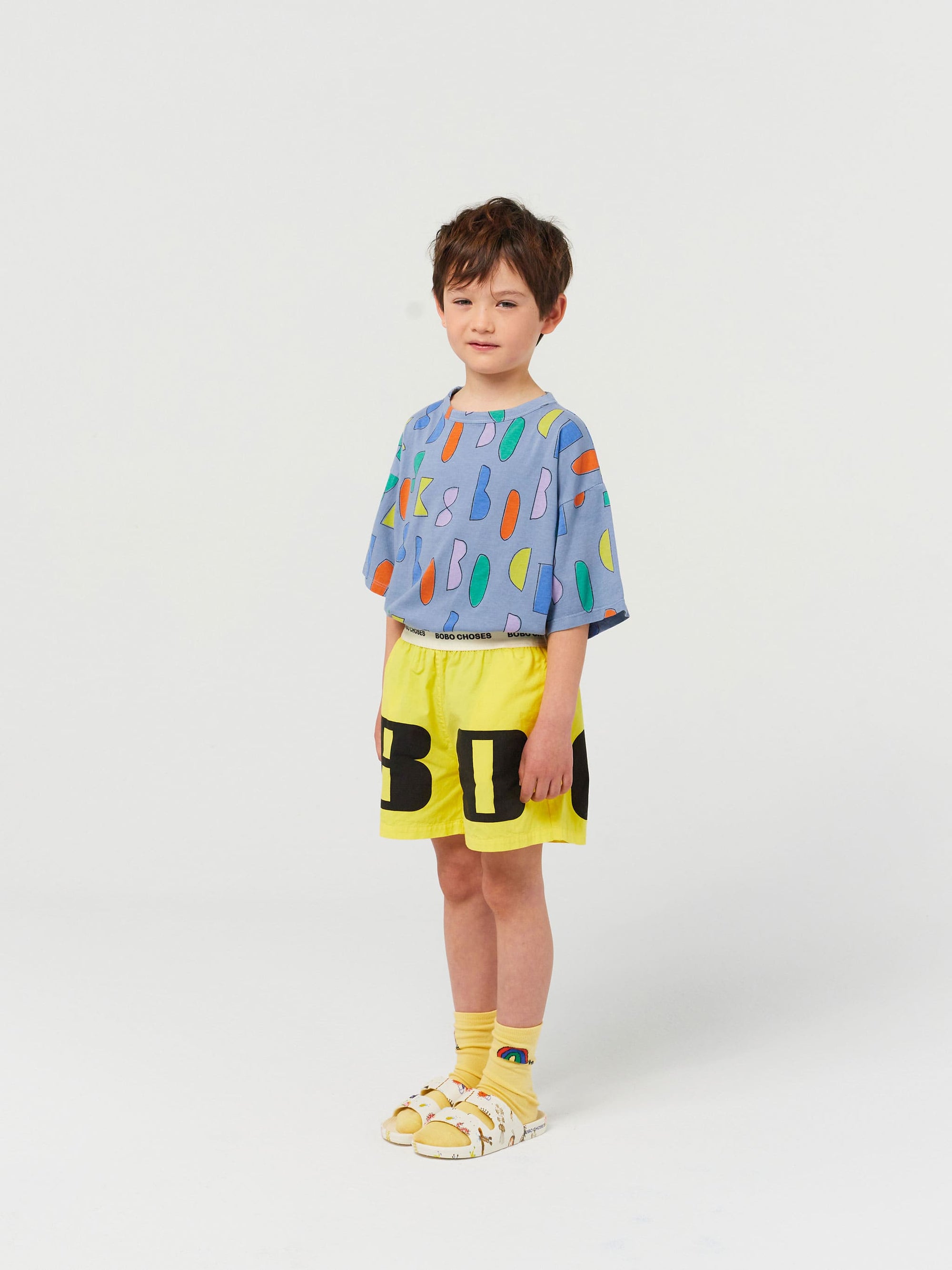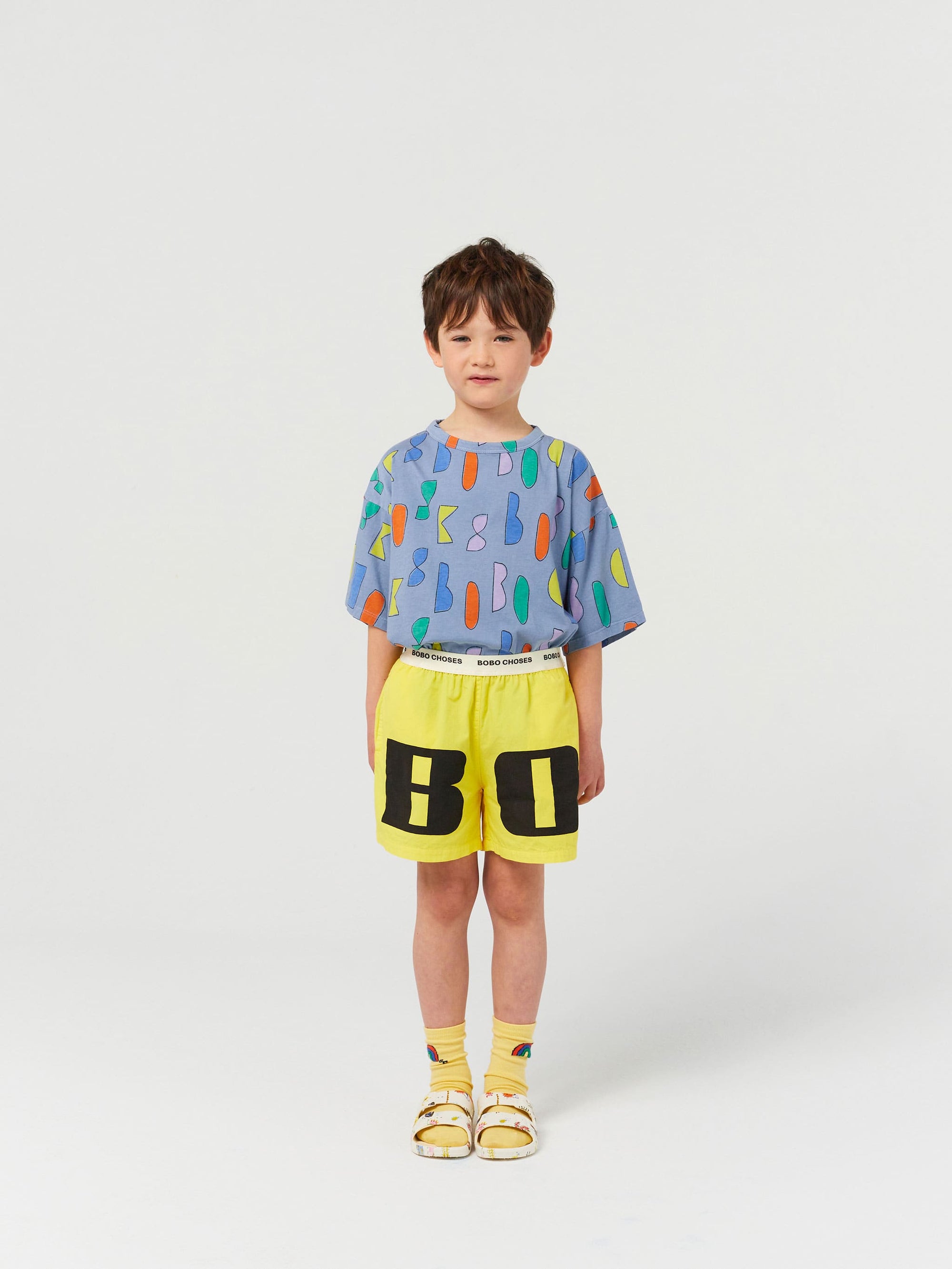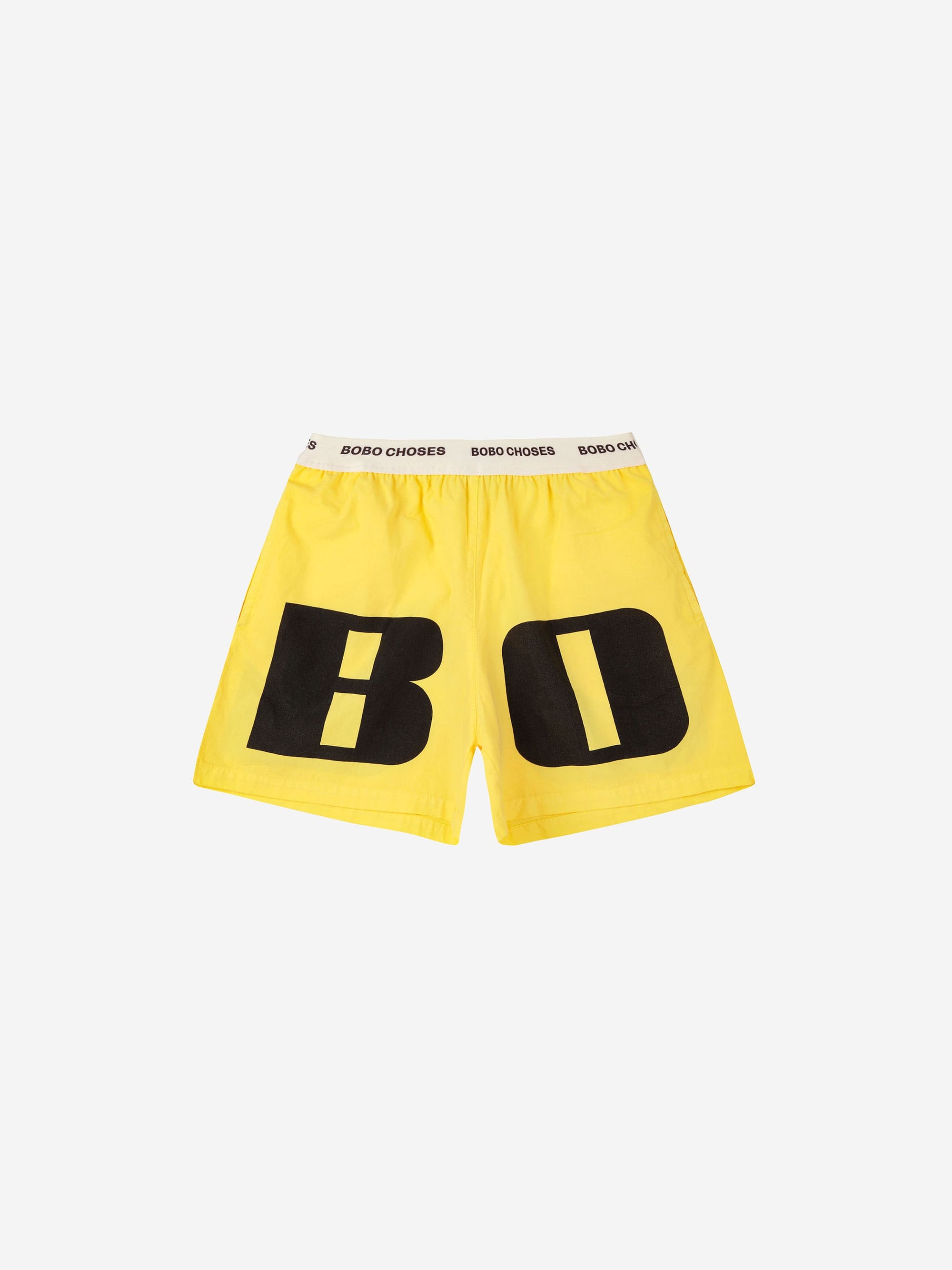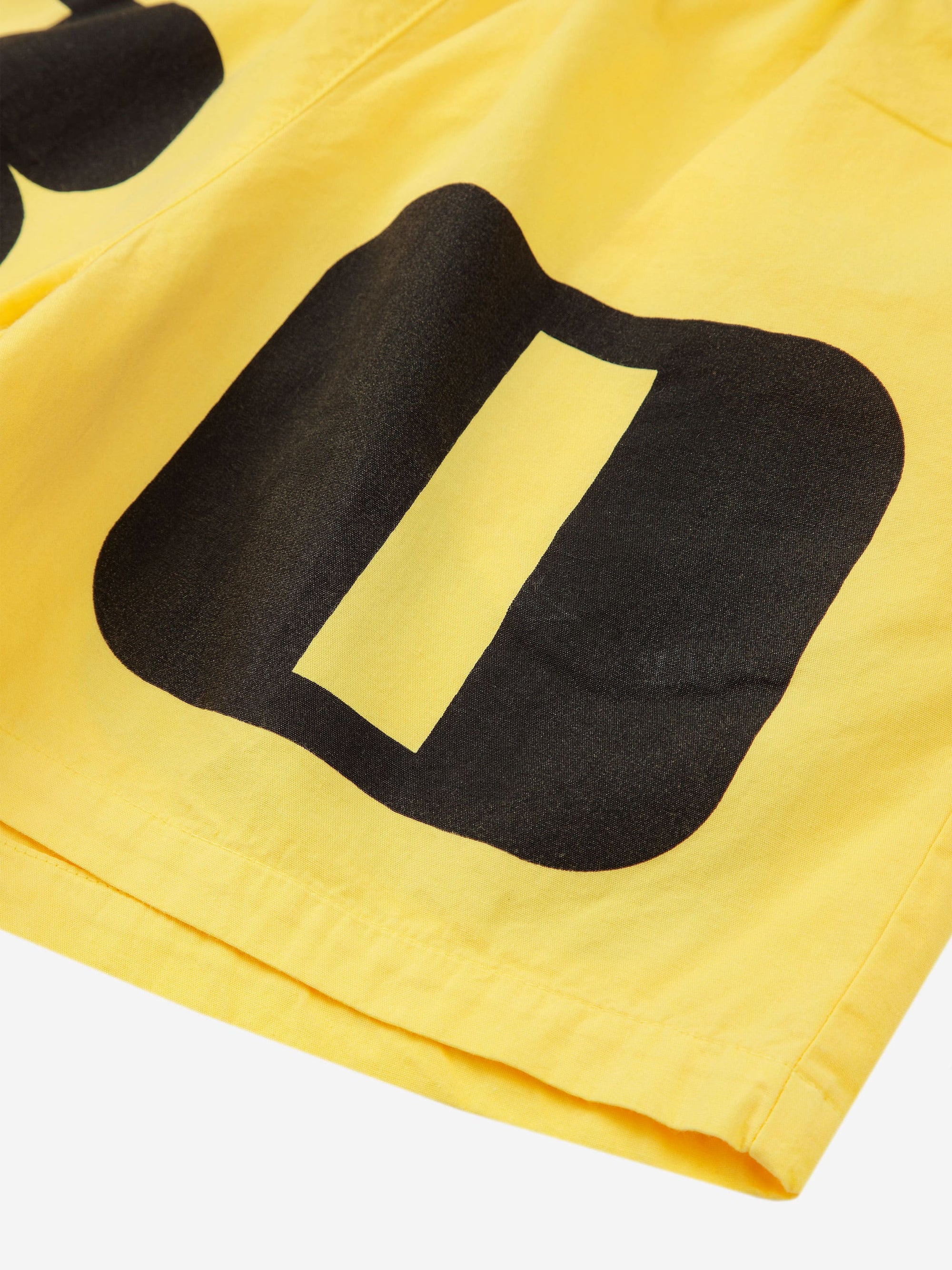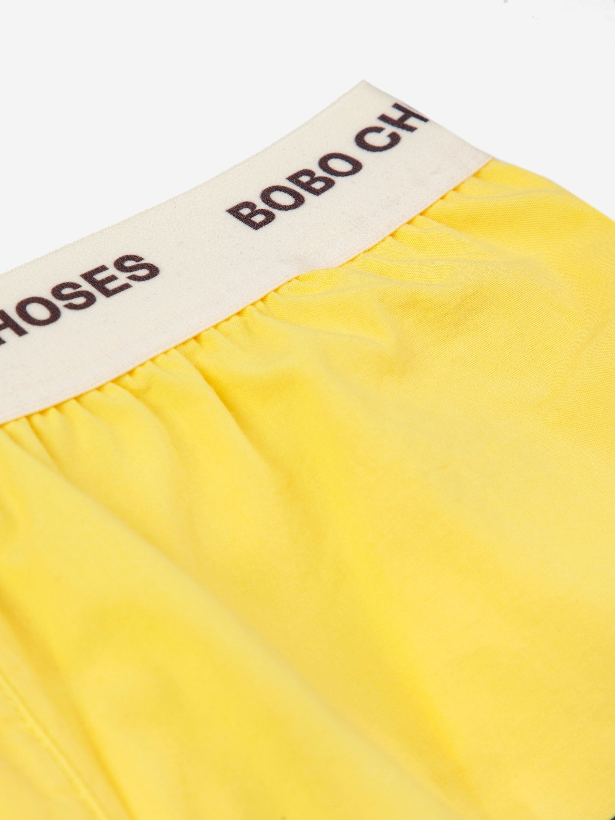100% organic cotton yellow shorts. Designed with regular crotch, elasticated waistband, side pocket and loose fit. Made in Spain.