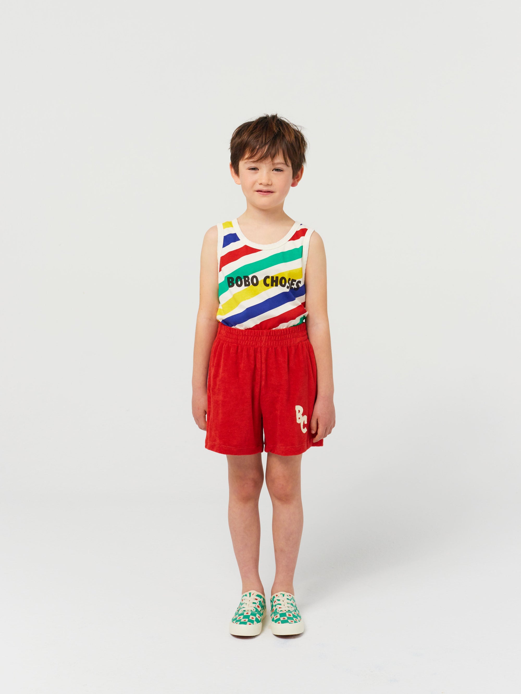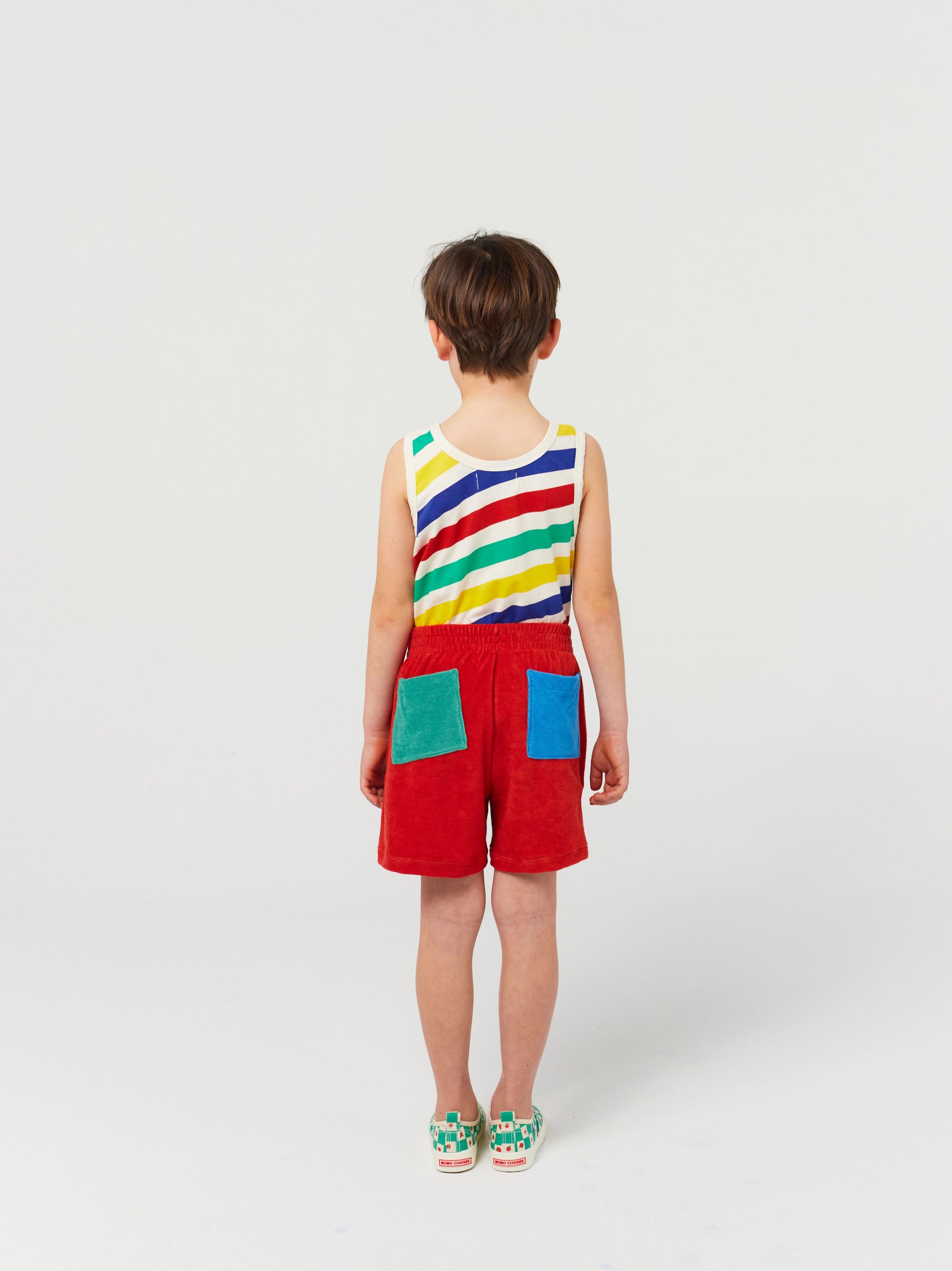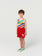 85% cotton, 15% polyester red bermuda. Designed with elasticated waistband and patch pocket. Made in Spain.