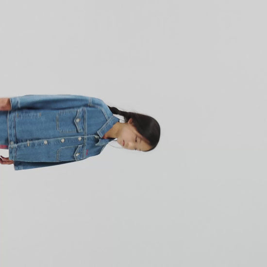 Navy blue outerwear. Designed with tailored collar, long sleeves, dropped shoulder, front button fastening, side pocket, embroidery, denim, flap pocket and relaxed fit. Made in Portugal.