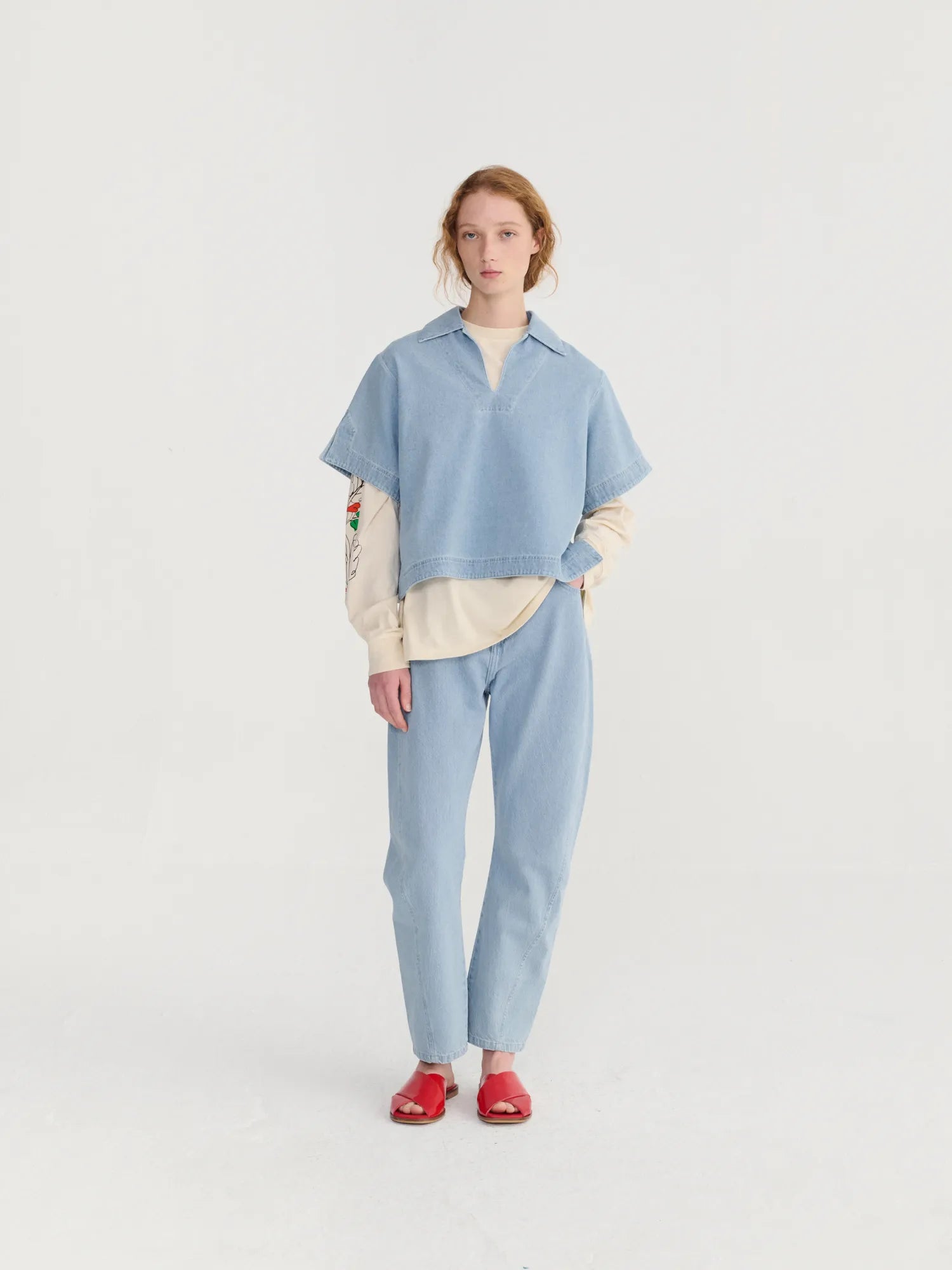 Light blue shirt. Designed with boxy fit, cropped length and non stretchy fabric. Fits true to size, take your normal size. Made in Spain.