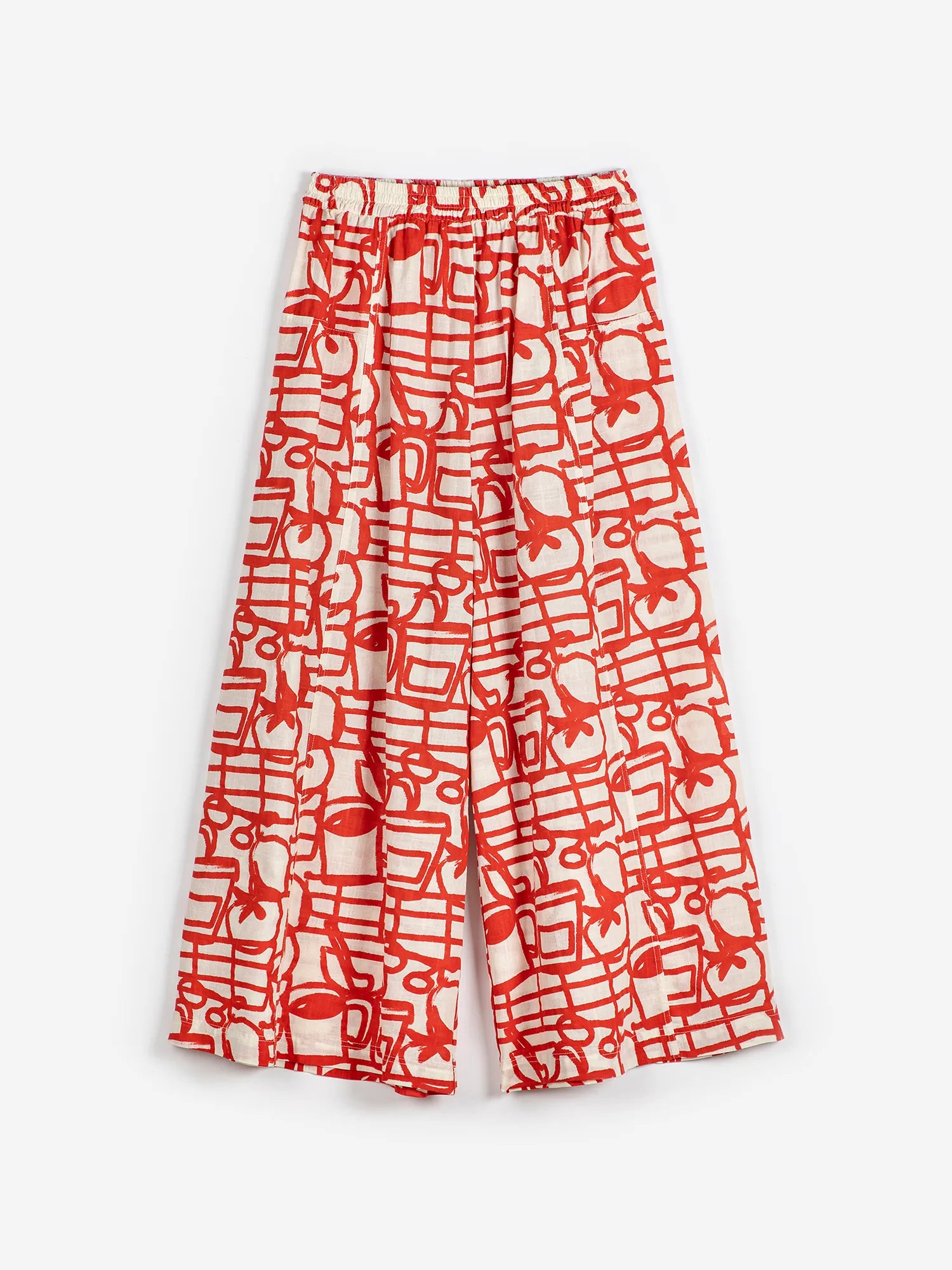 Red pants. Designed for a relaxed fit, mid-rise, elasticated at the waist for a flexible fit, cropped length, flared cut / evasé, non stretchy fabric. Fits true to size, take your normal size. Made in Spain.