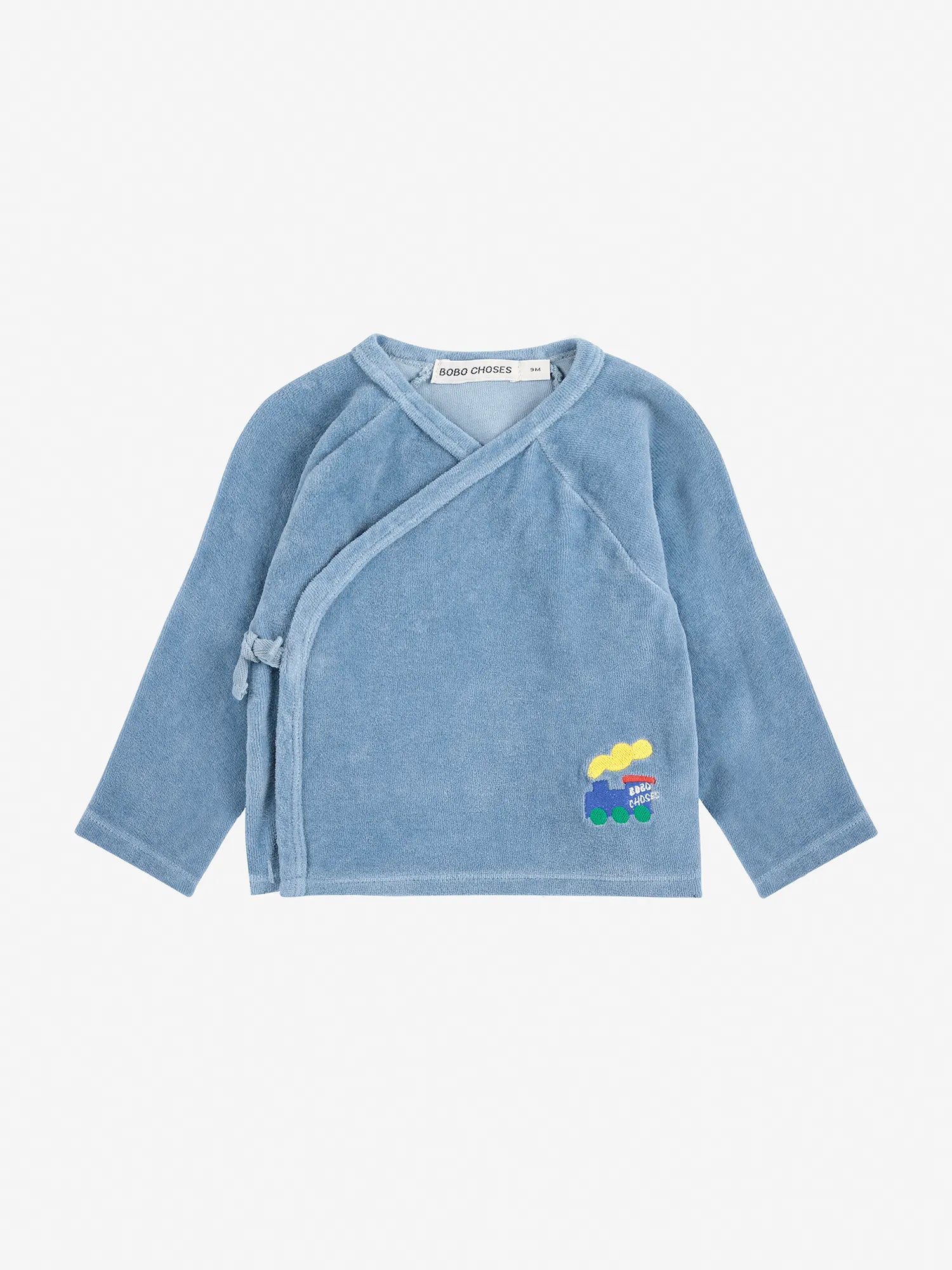 Light blue t-shirt. Designed with v-neck, long sleeves, raglan sleeves, crotch snap fastening, embroidery, slim fit, cord fastening, velvet and off-centre front button fastening. Made in Spain.