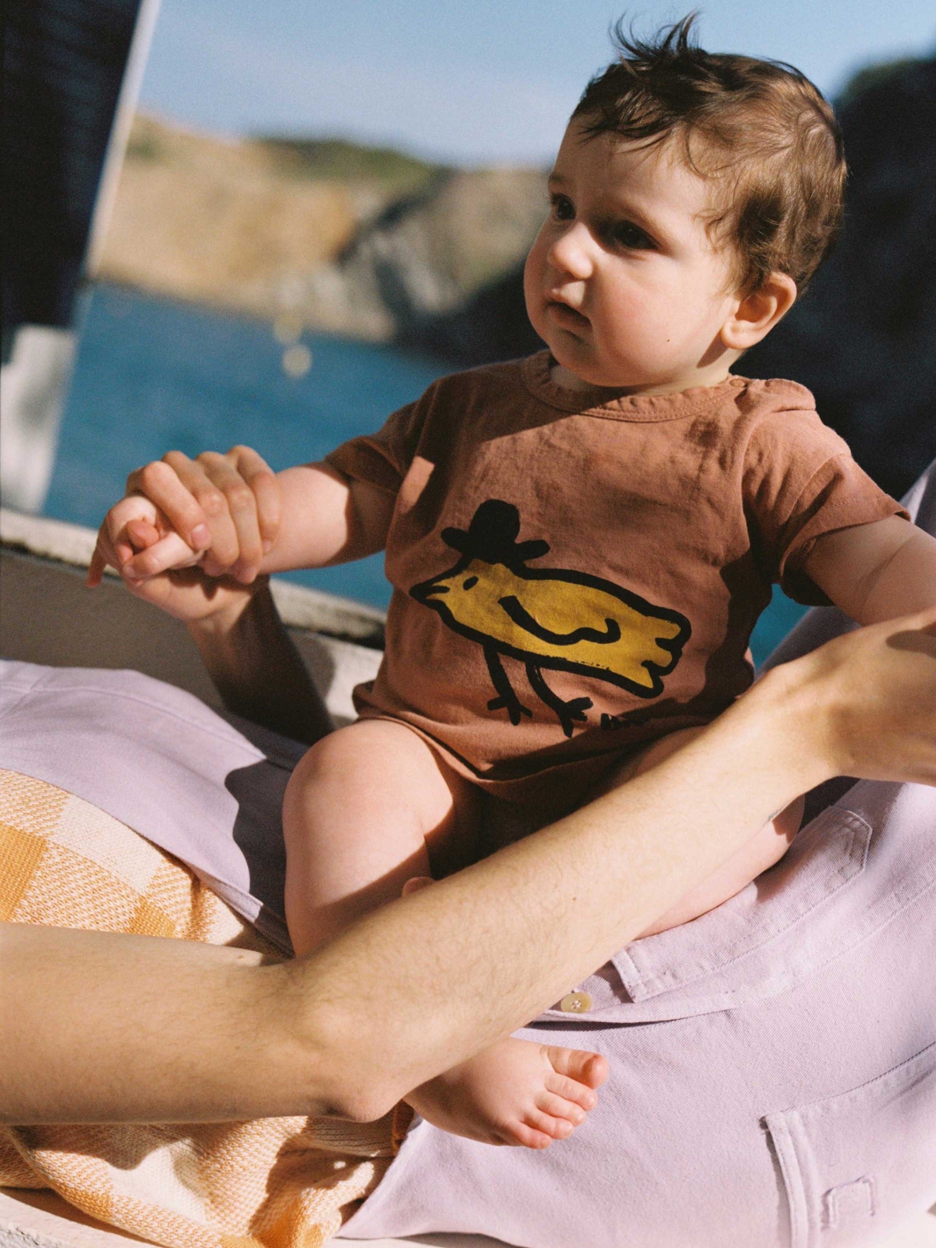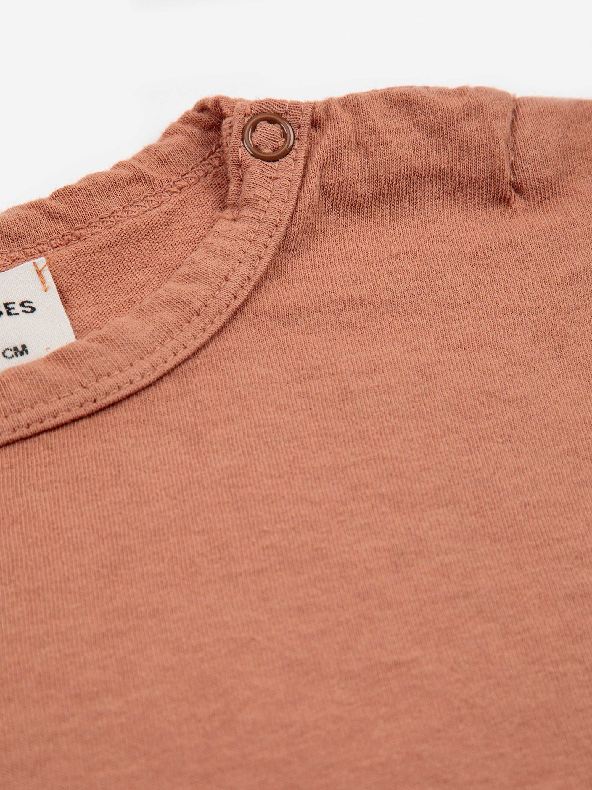 100% organic cotton brown short sleeve t-shirt. Designed with short sleeves, dropped shoulder and shoulder snap fastening. It has a loose fit. Made in Spain