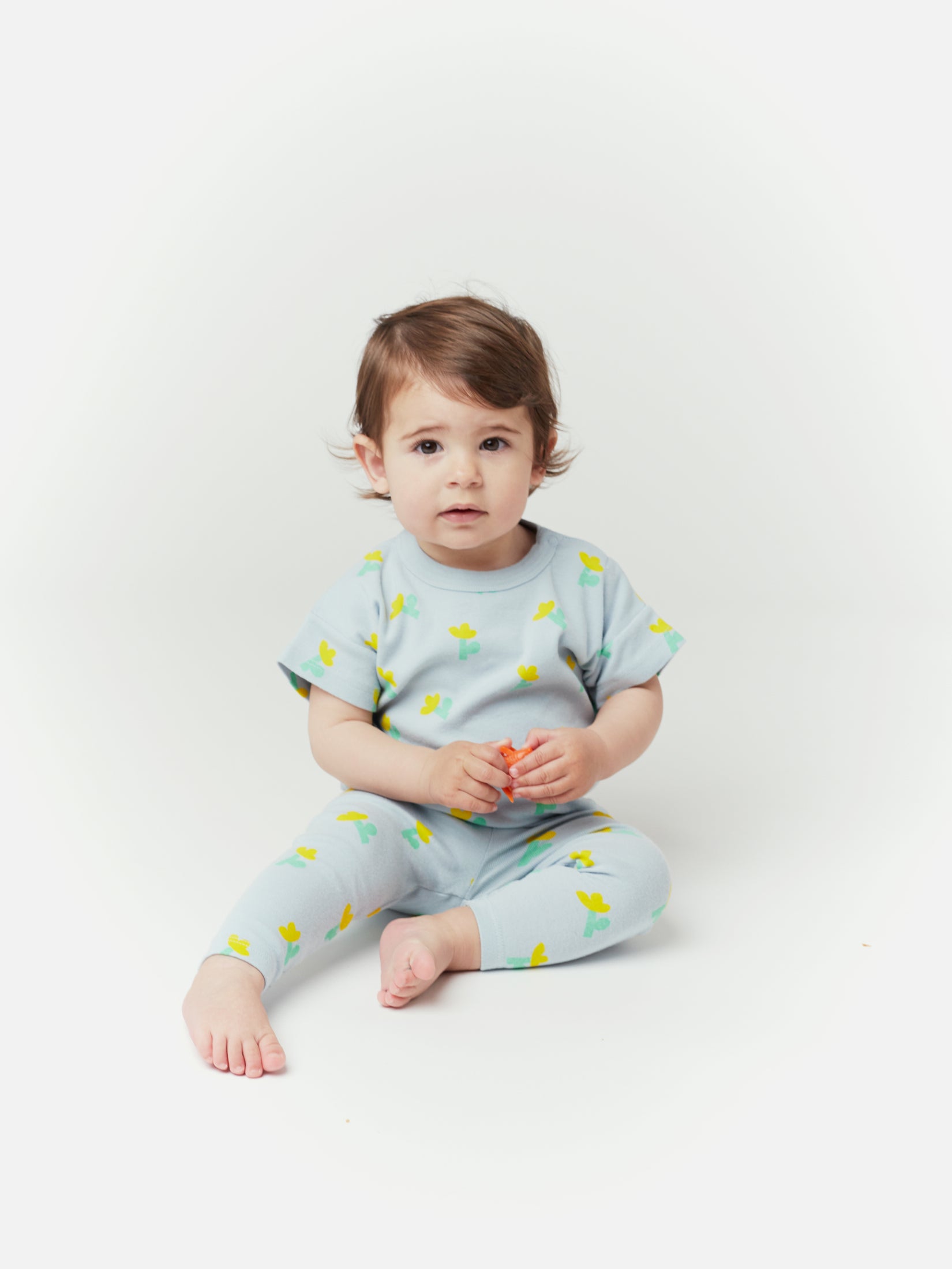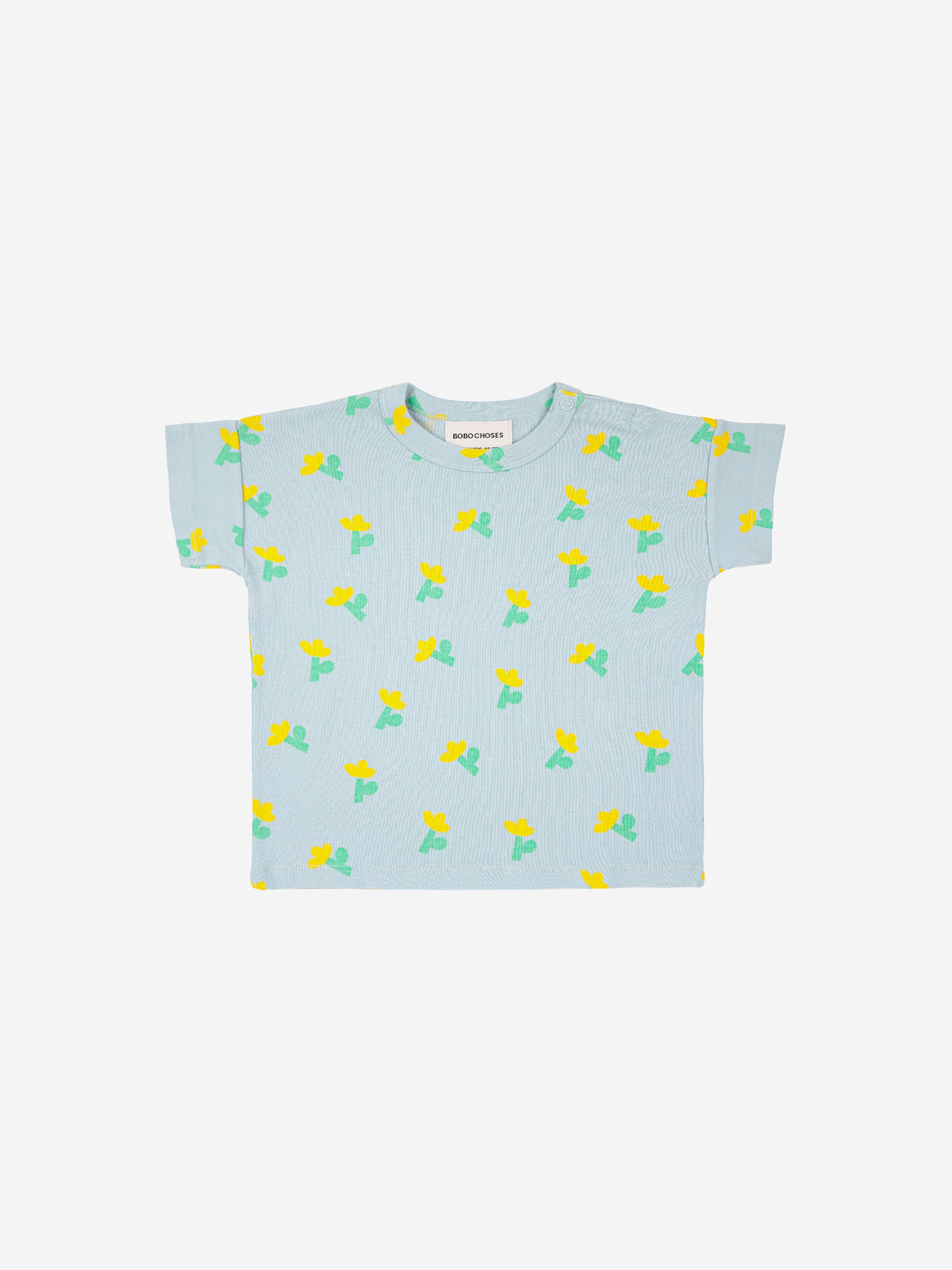 95% organic cotton 5% elastane light blue short sleeve t-shirt. Designed with short sleeves, dropped shoulder and shoulder snap fastening. It has a loose fit. Made in Spain