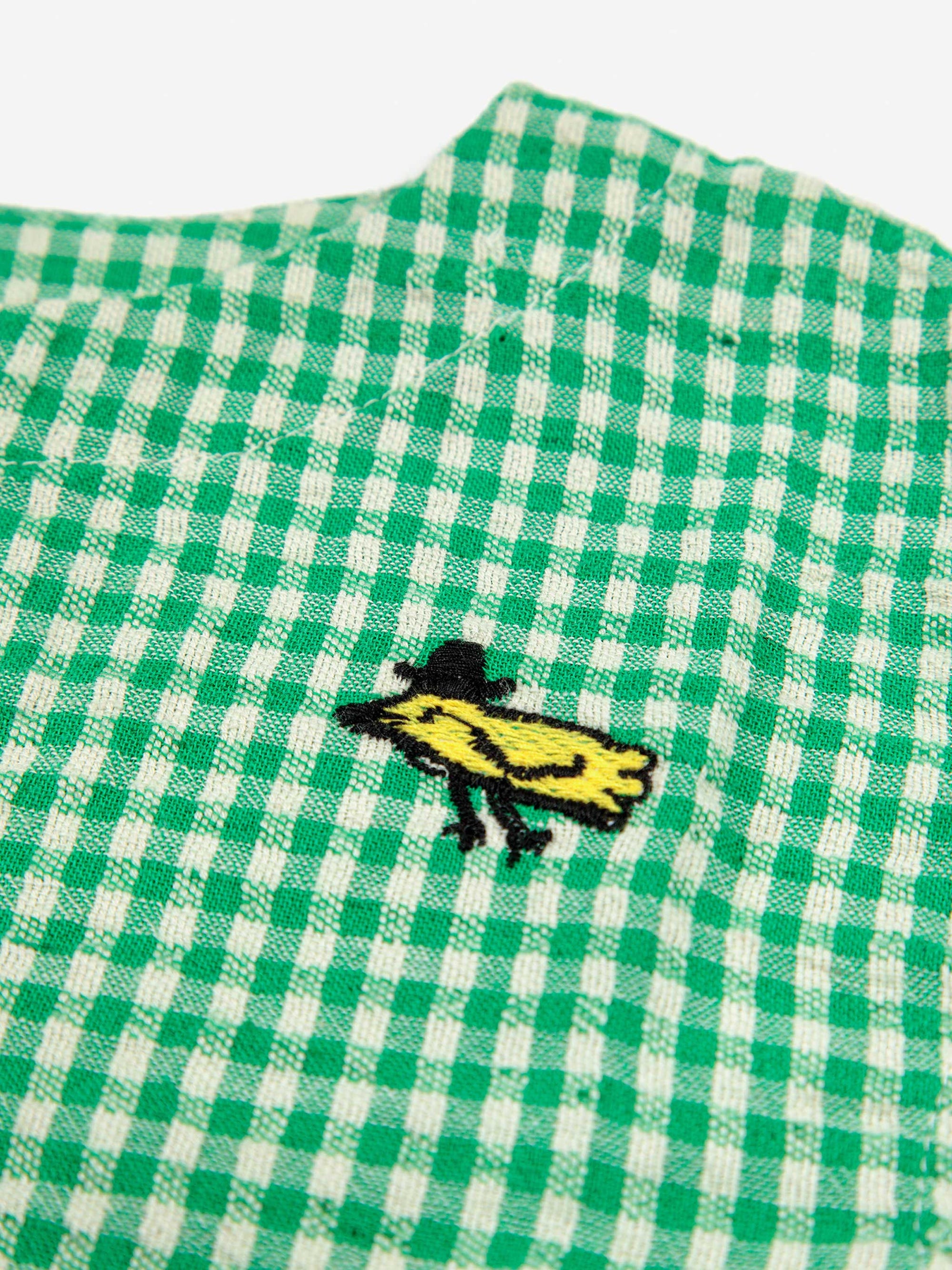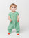 84% cotton 16% linen light green short sleeve overall. Designed with short sleeves, front button fastening, crotch snap fastening and embroidery. It has a baggy fit. Made in India