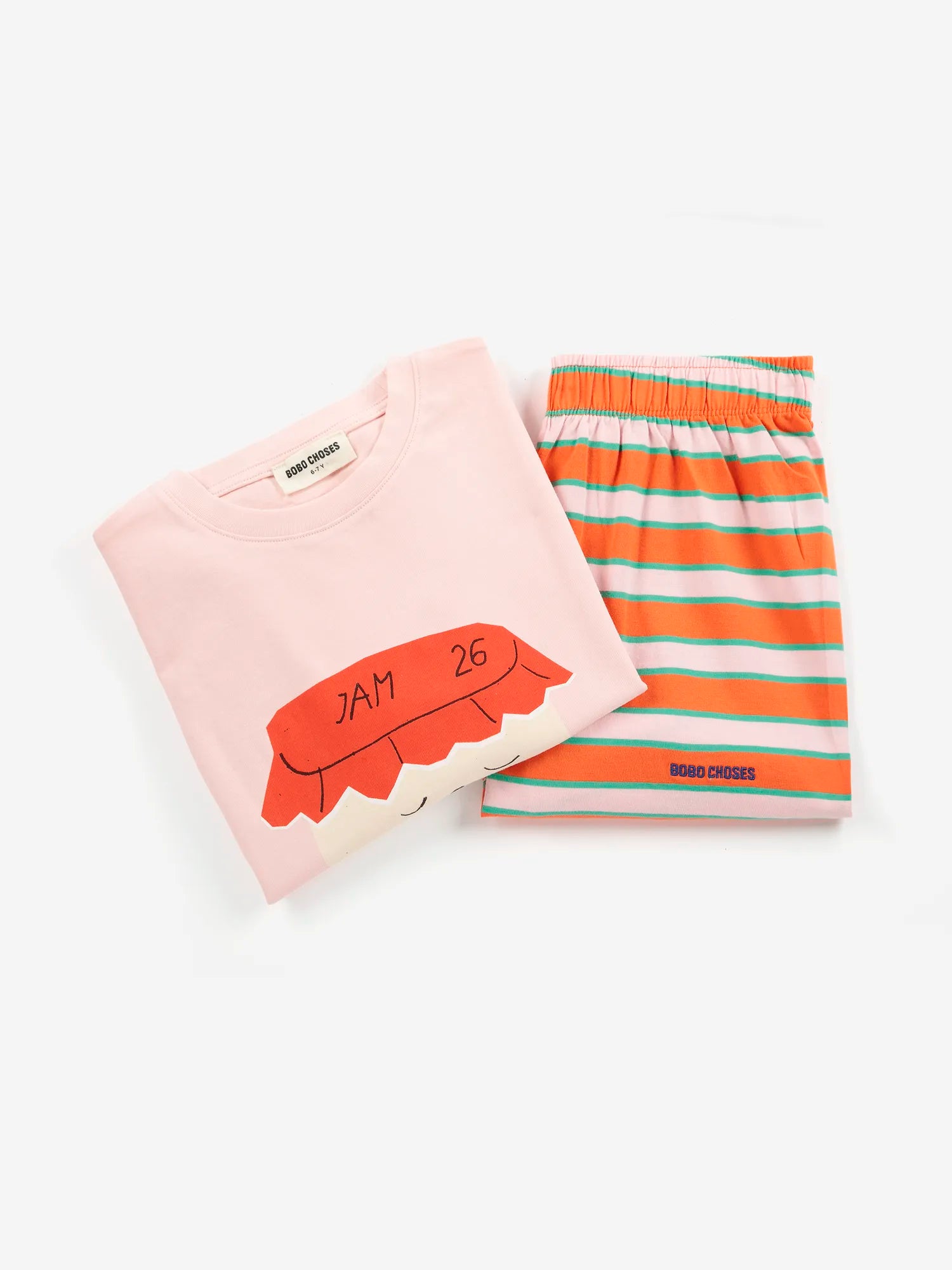 Red loungewear set. Designed with short sleeves, elasticated waistband, embroidery, loose fit, short and round neck. Made in China.