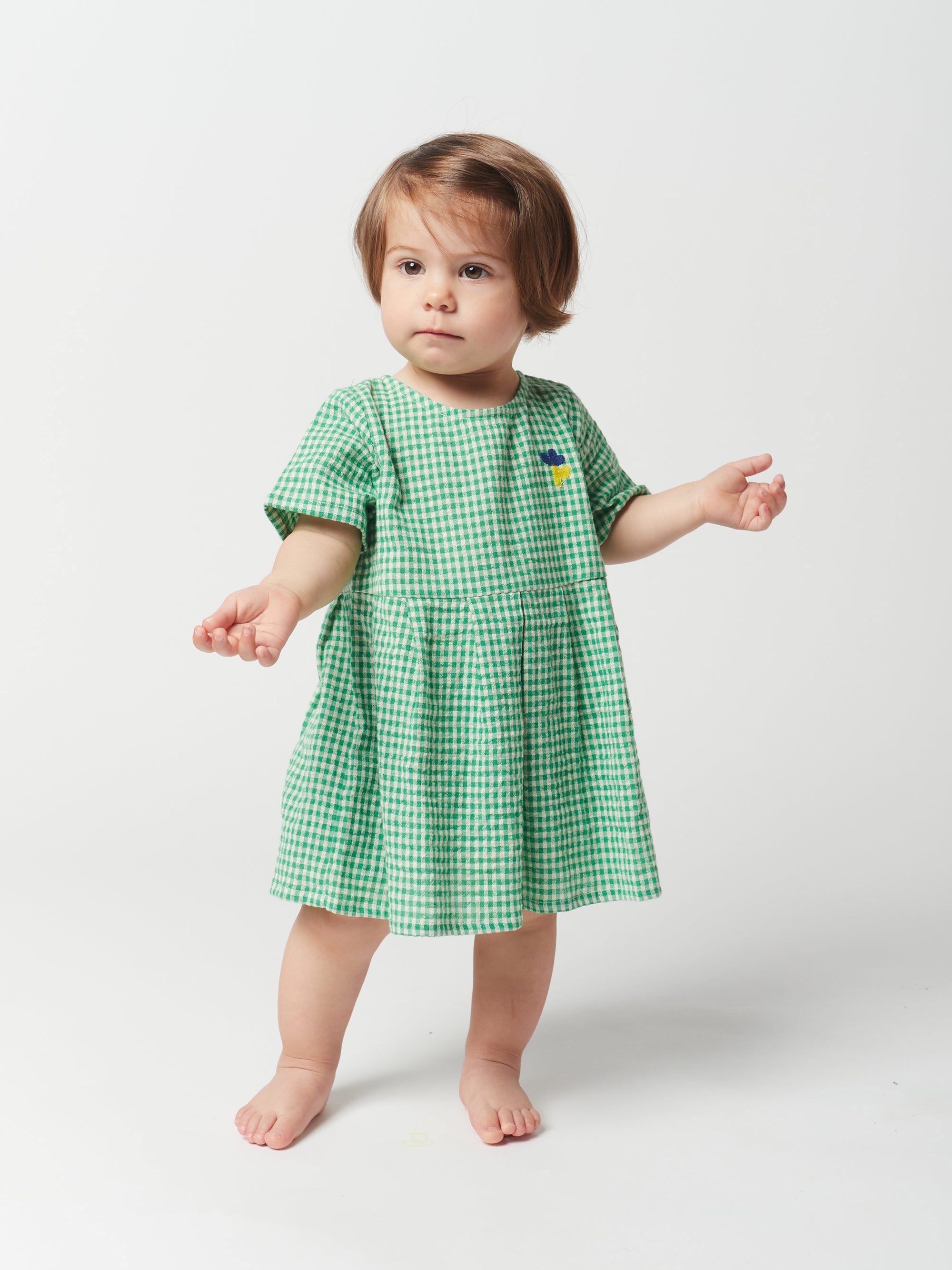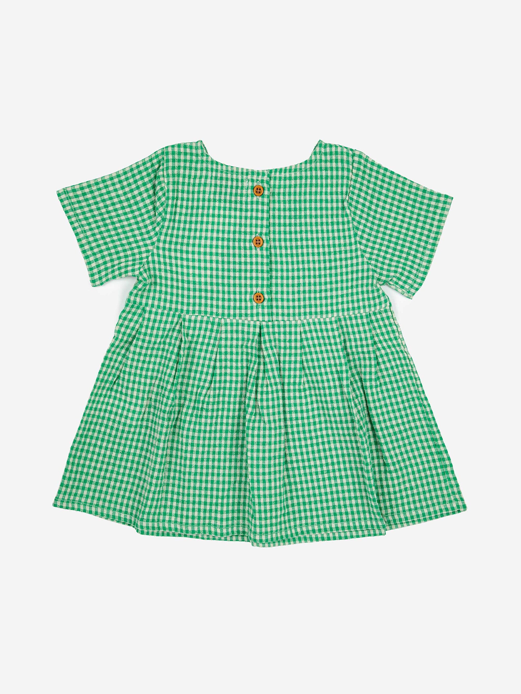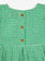 84% cotton 16% linen light green short sleeve dress. Designed with back button fastening and embroidery. It has a evasé fit. Made in India