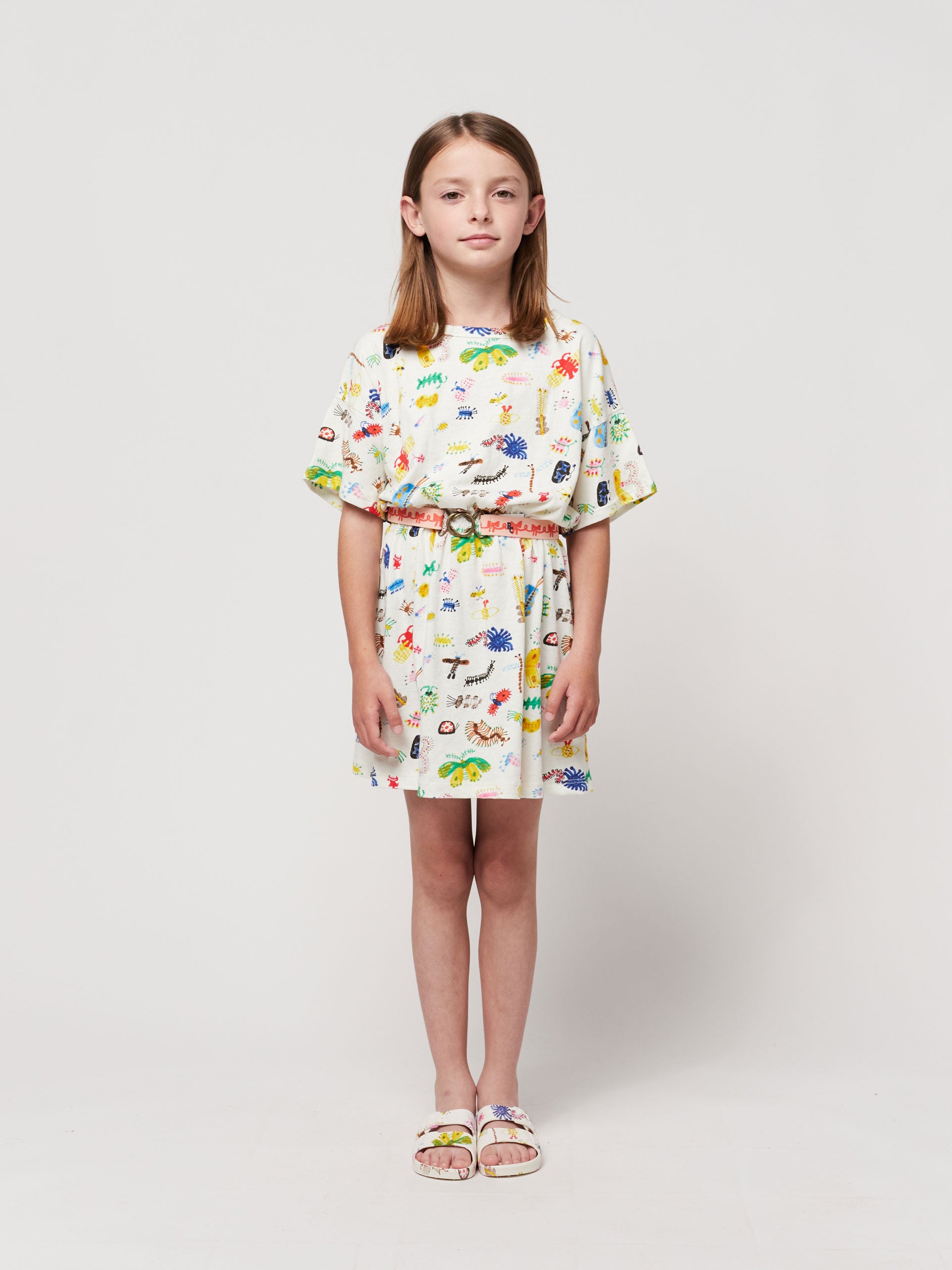 100% organic cotton offwhite dress. Designed with short sleeves, elasticated waistband, evasé fit, short and round neck. Made in Portugal.