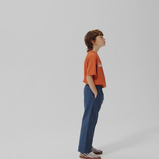 Navy blue pants. Designed with elasticated waistband, straight fit, long length, patch pocket and seam pocket. Made in Spain.