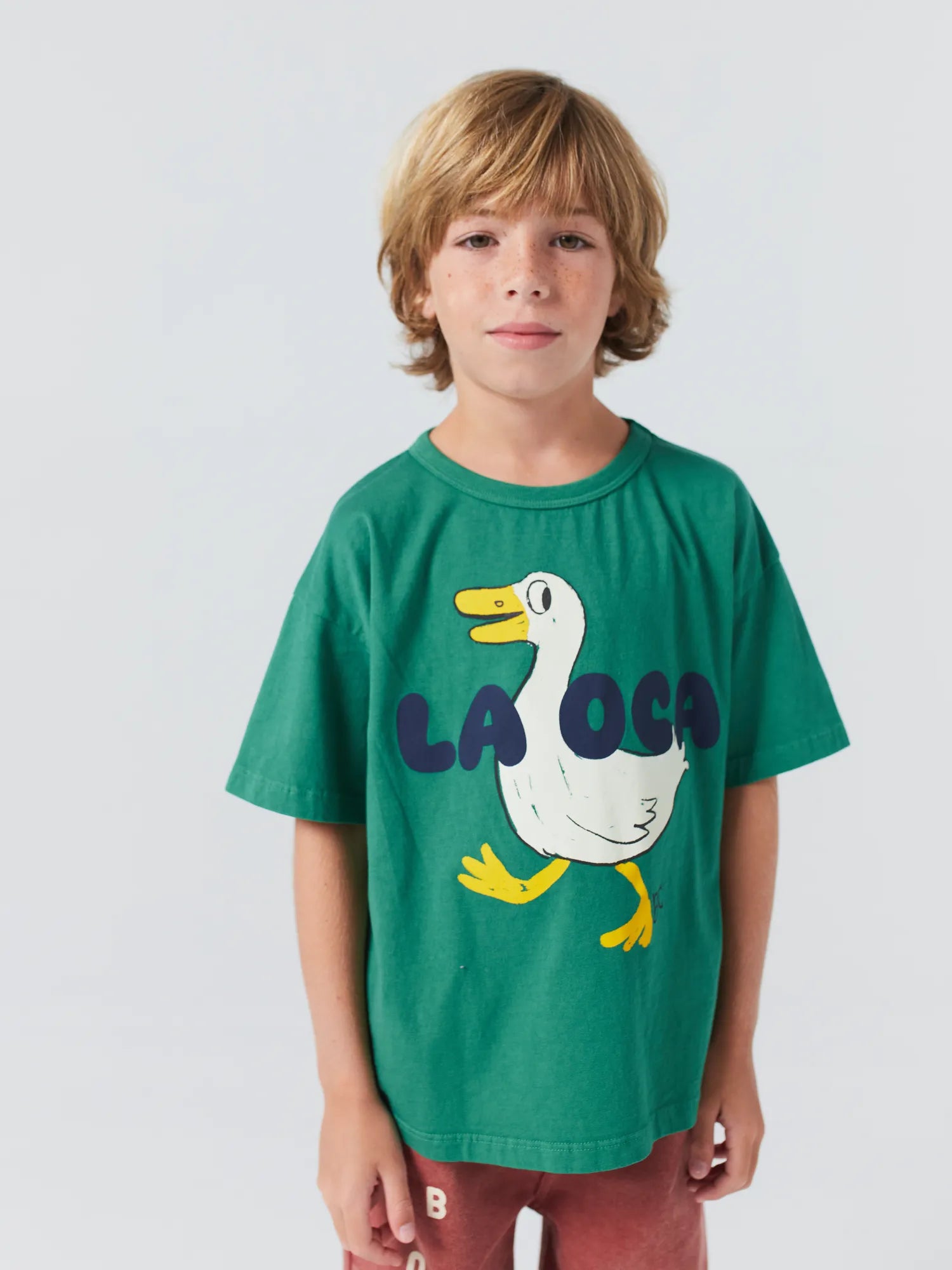 Green t-shirt. Designed with short sleeves, loose fit and round neck. Made in Spain.