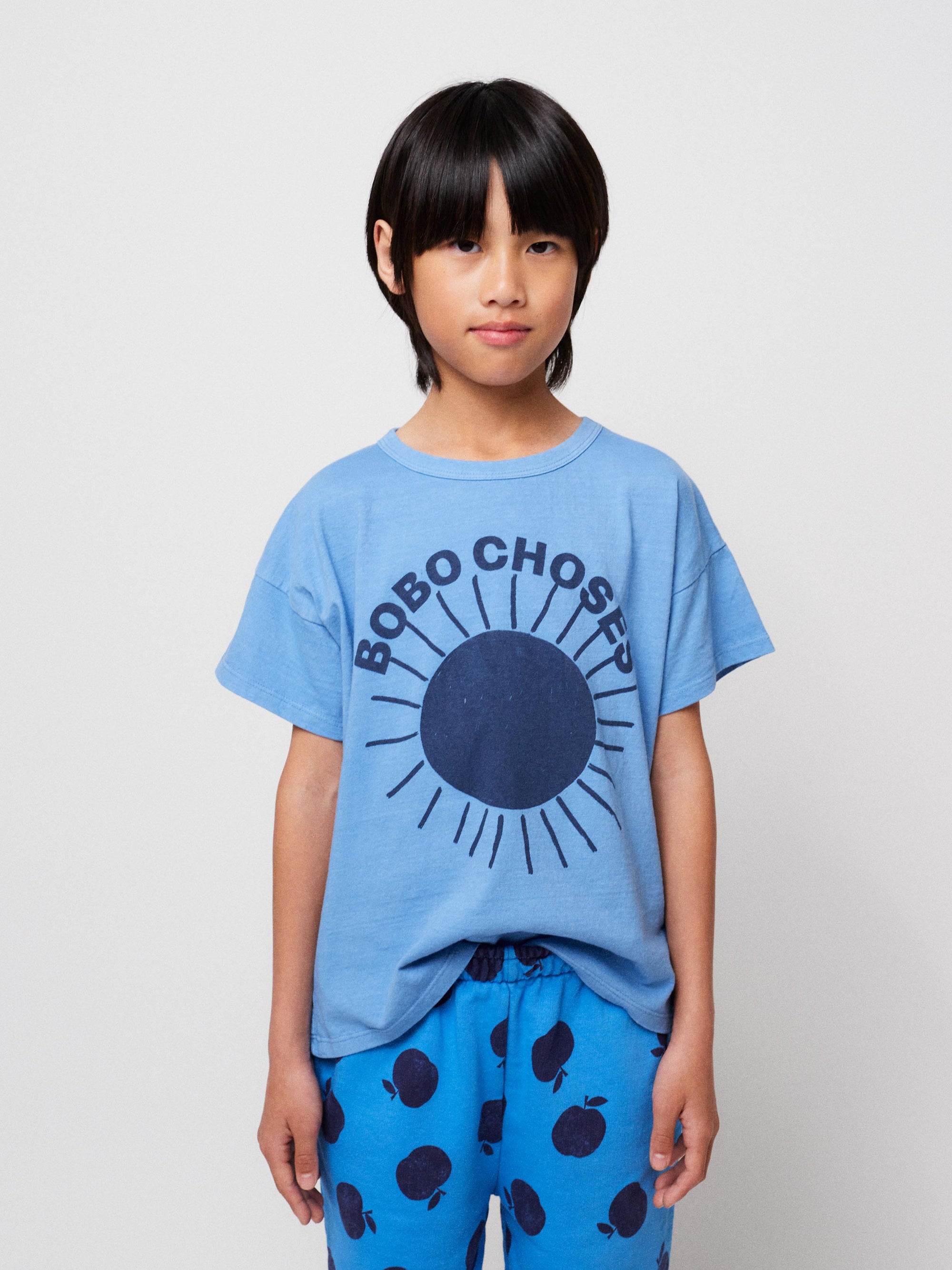 The iconic "Sun" from Bobo Choses in midnight blue stands out on the front of our light blue children's t-shirt. We've designed it to give them the freedom to live their own adventures without discomfort. Create fun and personality-filled outfits that accompany them in their moments of fun as they run and play.