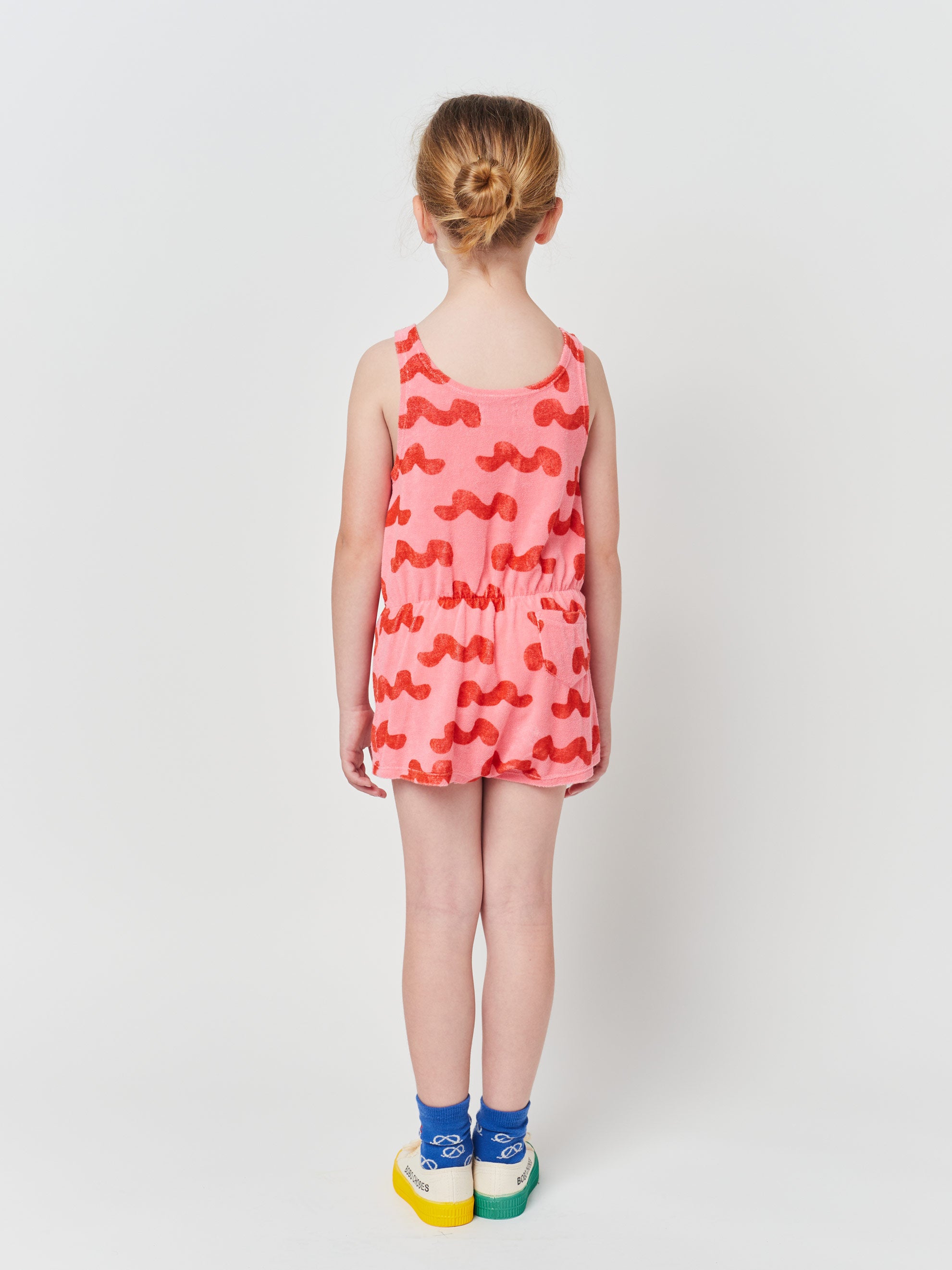 85% cotton 15% polyester pink sleeveless playsuit. Made in Spain