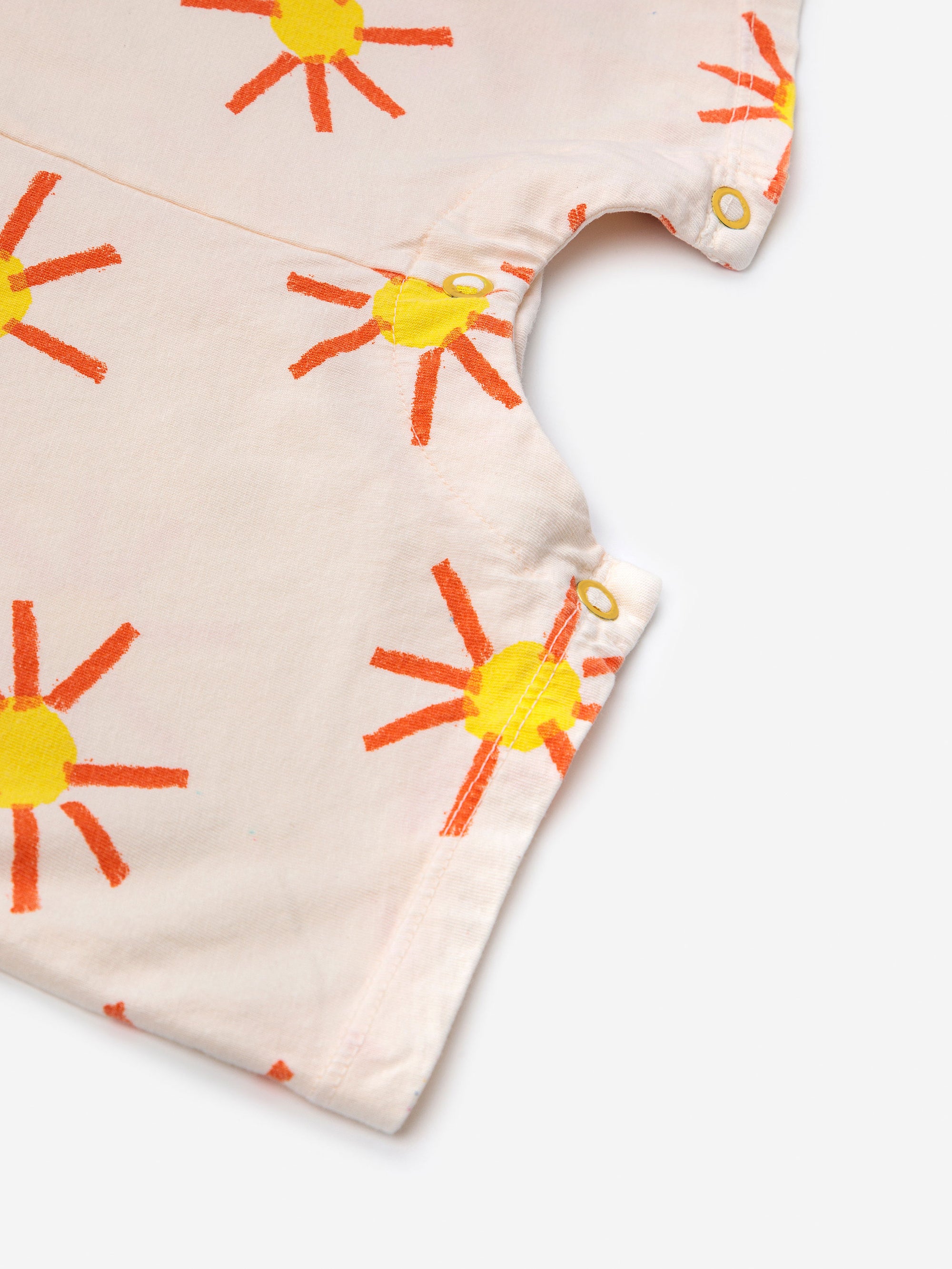 100% organic cotton offwhite playsuit. Designed with short sleeves, dropped shoulder, front snap fastening, crotch snap fastening, loose fit and round neck. Made in Portugal.