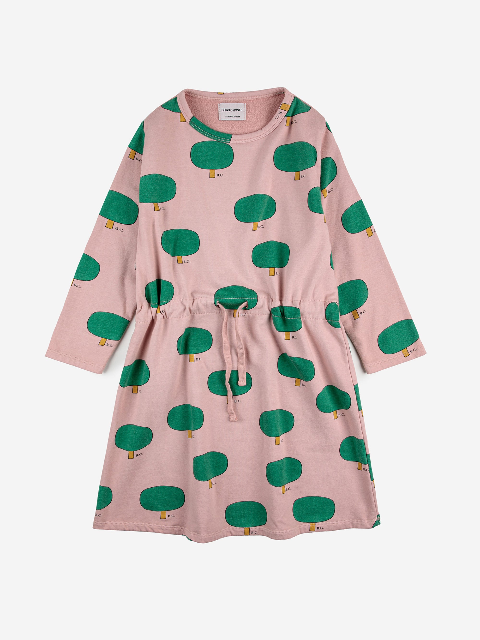 94% organic cotton 6% elastane pink knee lenght dress. Designed with long sleeves, adjustable drawstring, below knee length, round neck and inner brush fleece. It has a evasé fit. Made in Spain.