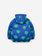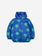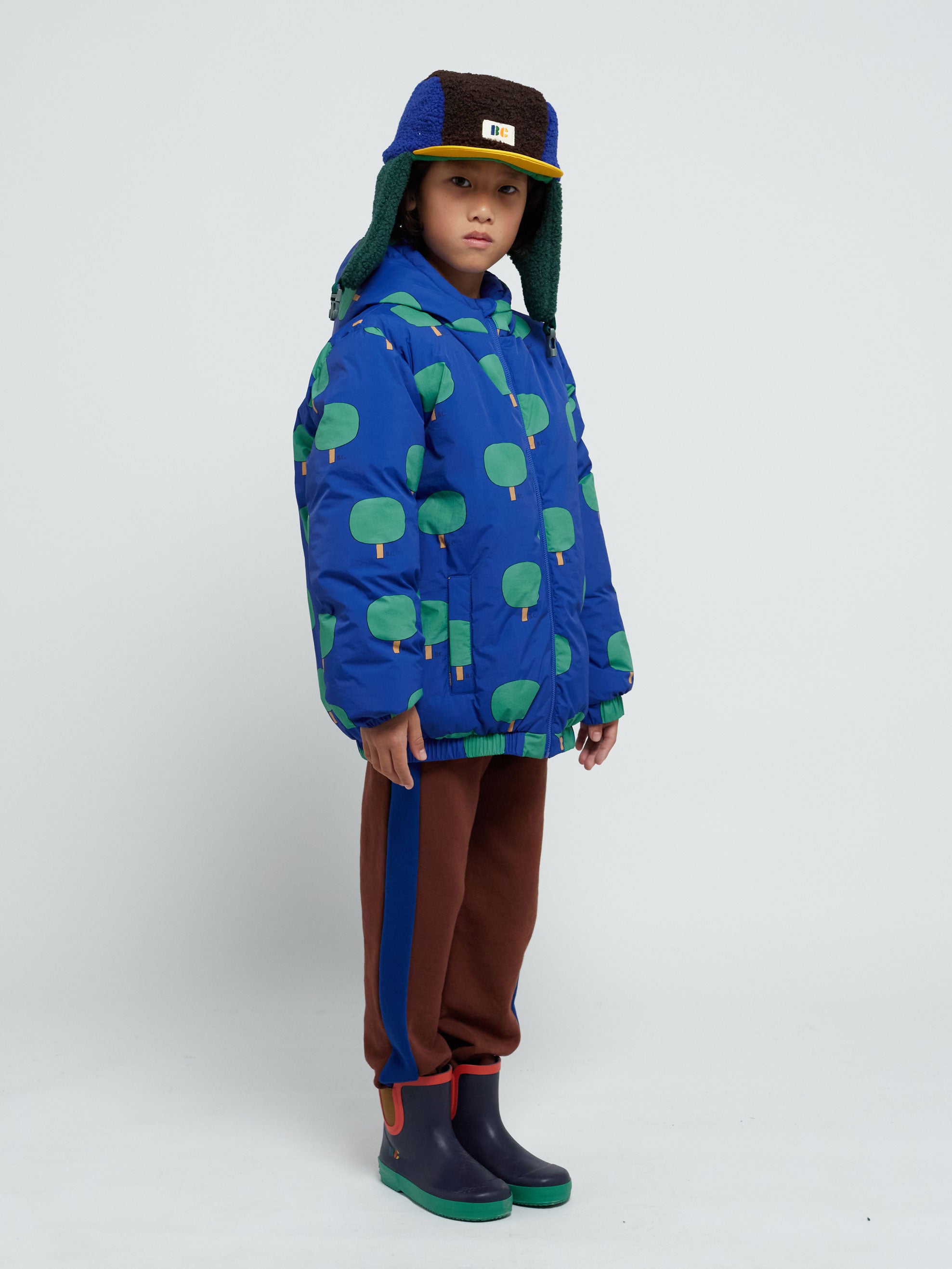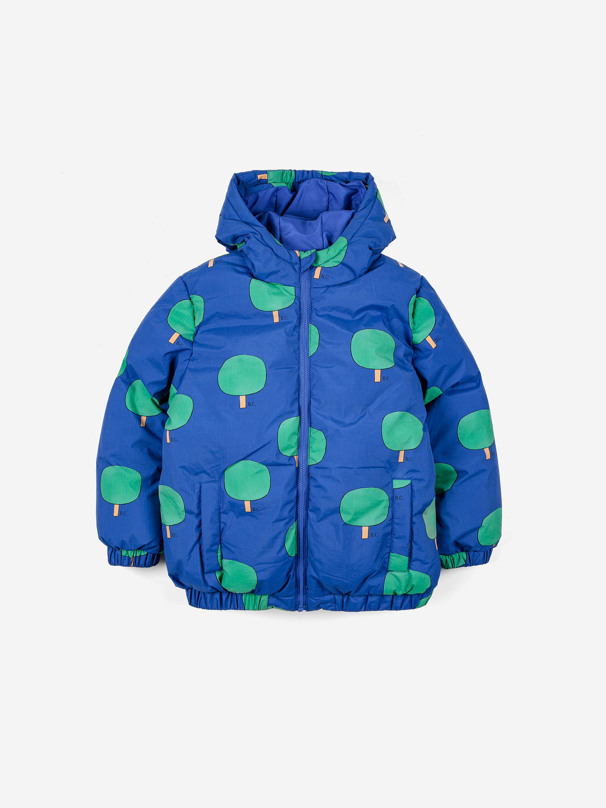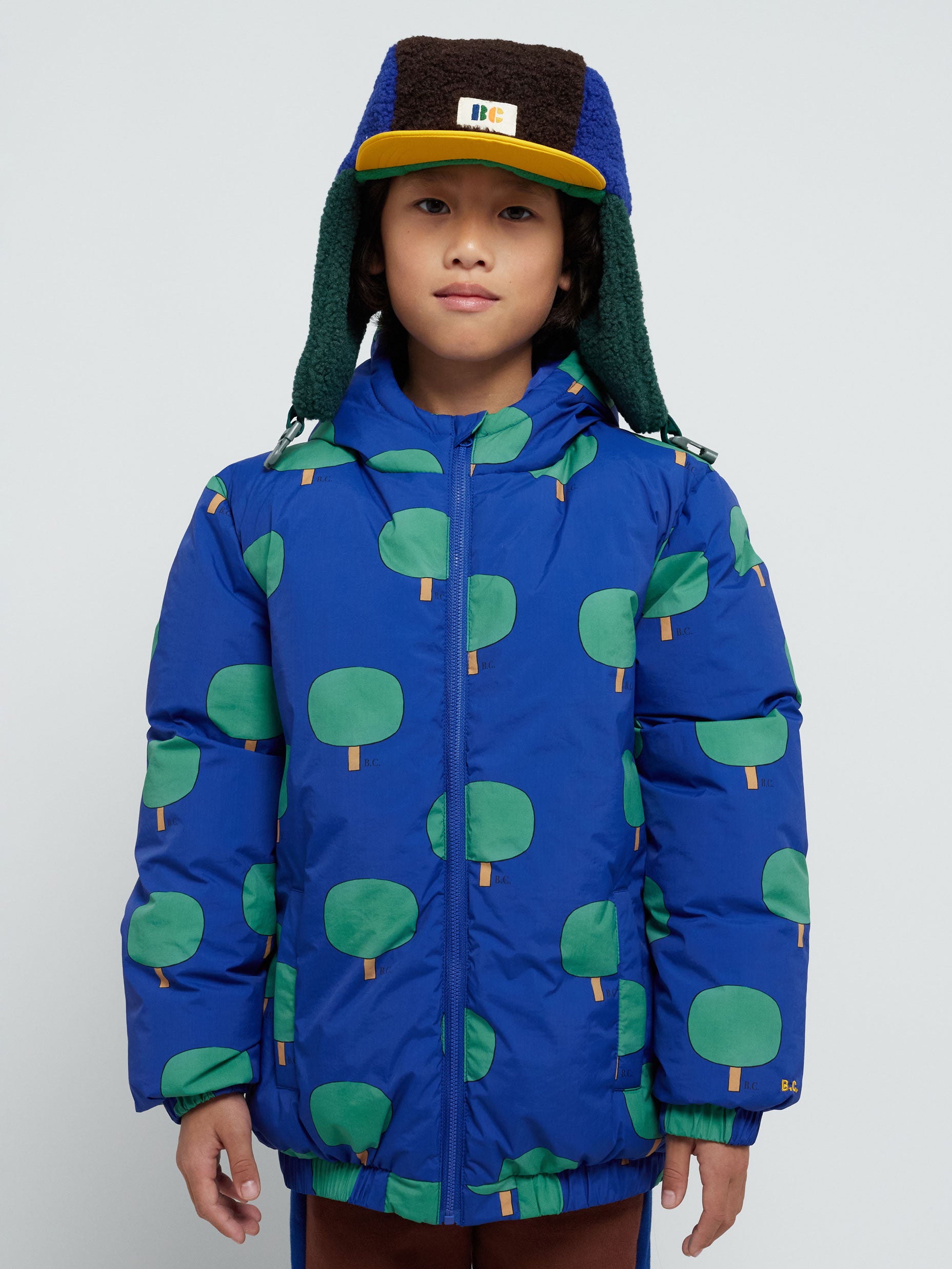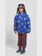 100% recycled polyamide blue outerwear. Designed with hooded, long sleeves, front button fastening, pipped pocket, embroidery and reversible. It has a loose fit. Made in China.