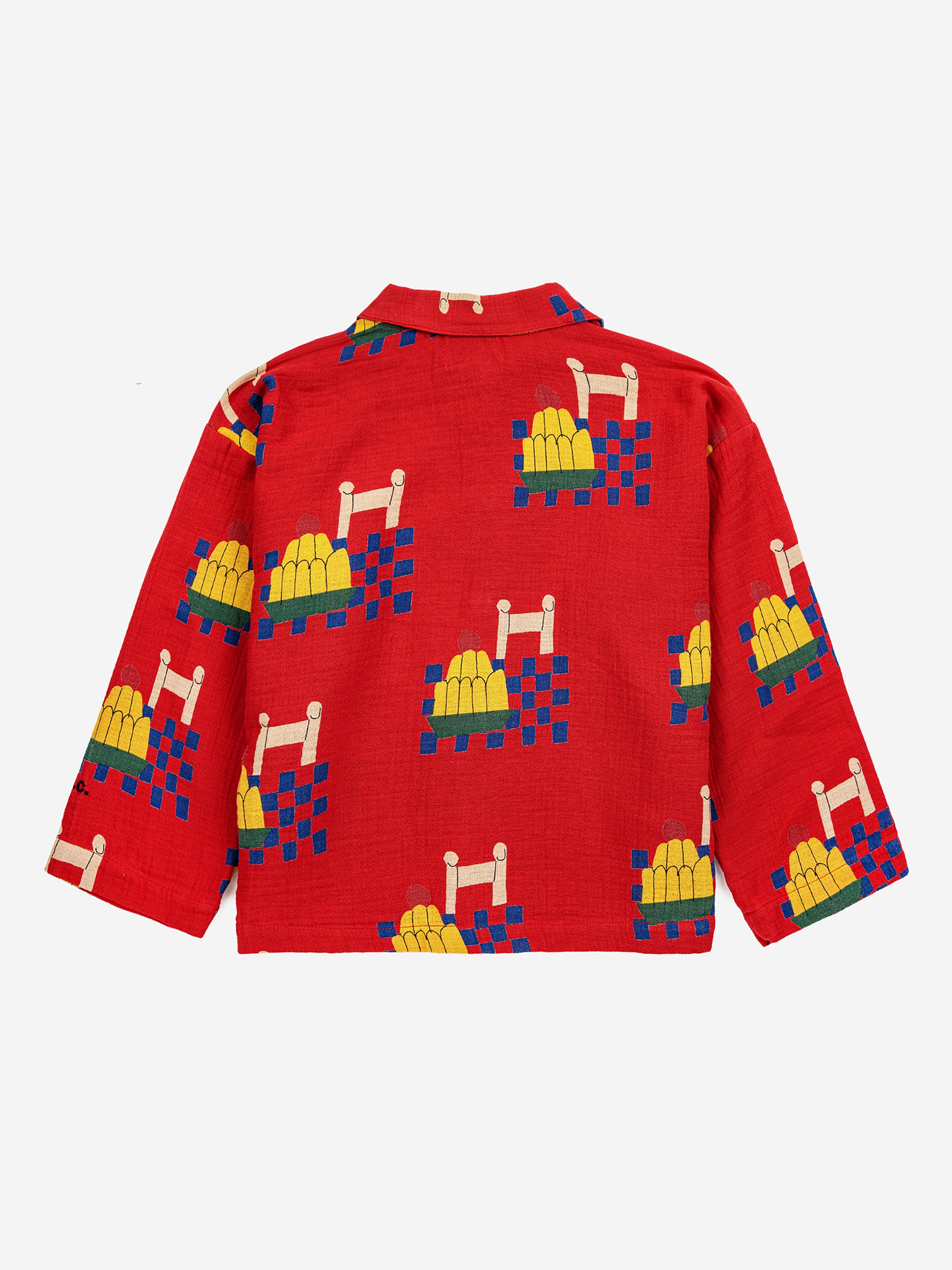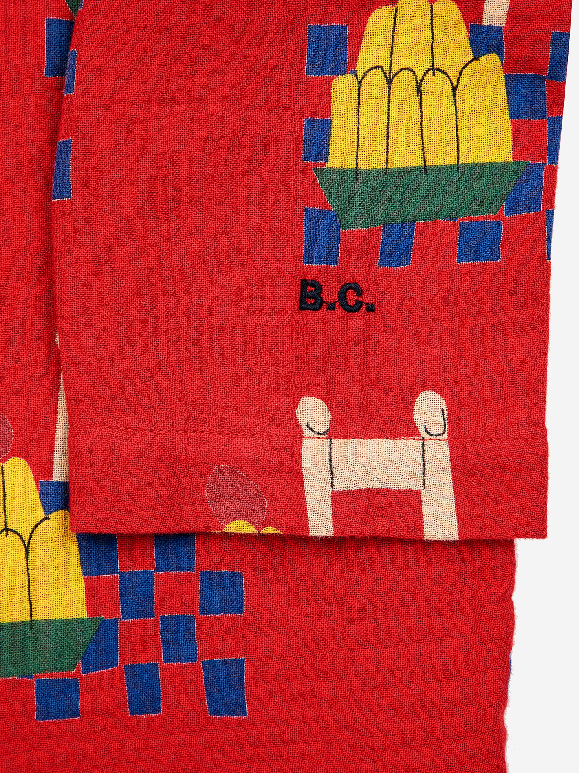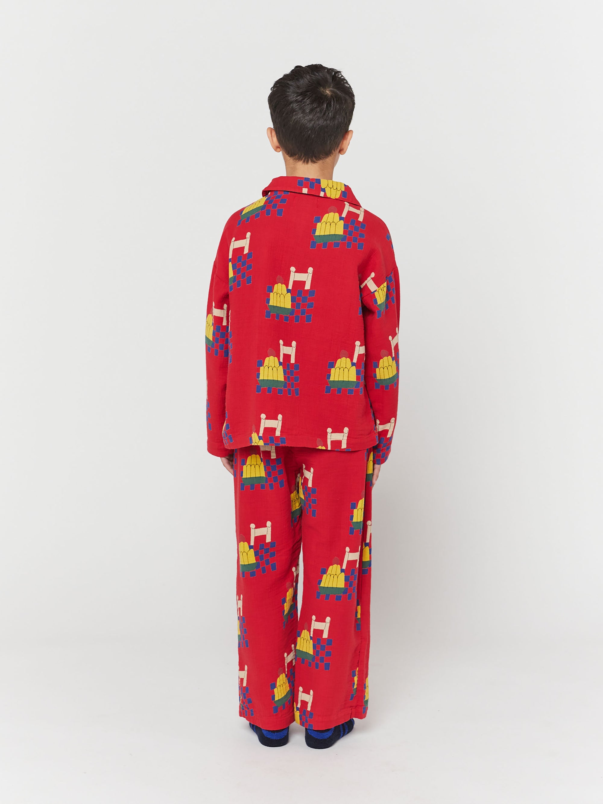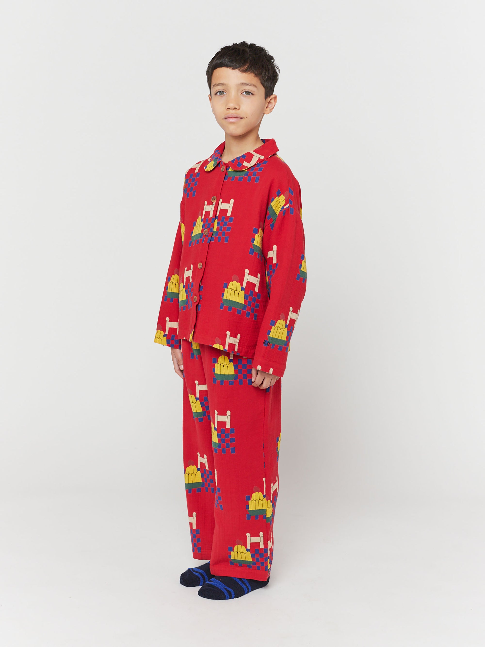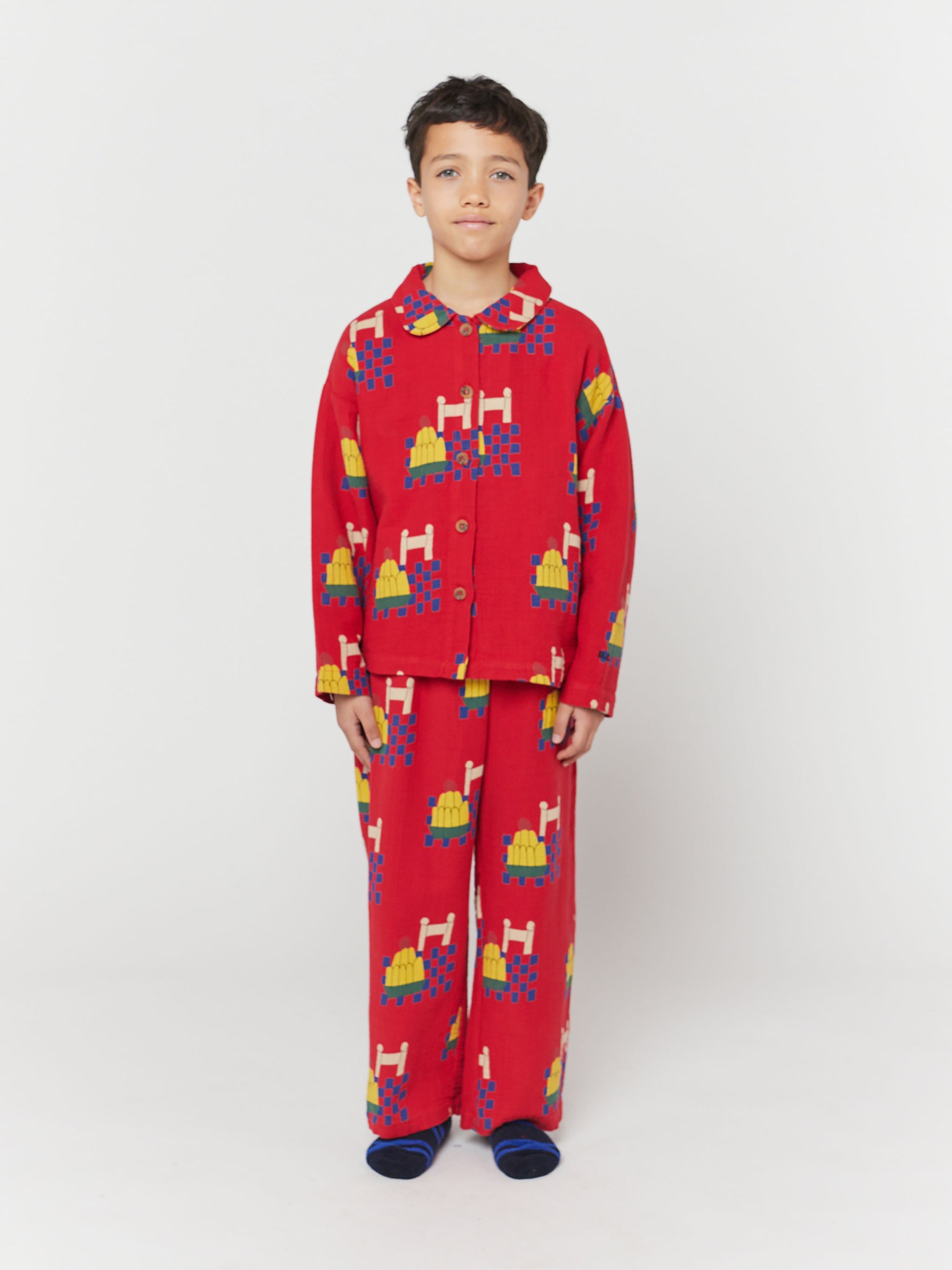 100% cotton red pijama. Designed with tailored collar, long sleeves, front button fastening, elasticated waistband, embroidery, loose fit, long length and double cotton fabric. Made in Spain.