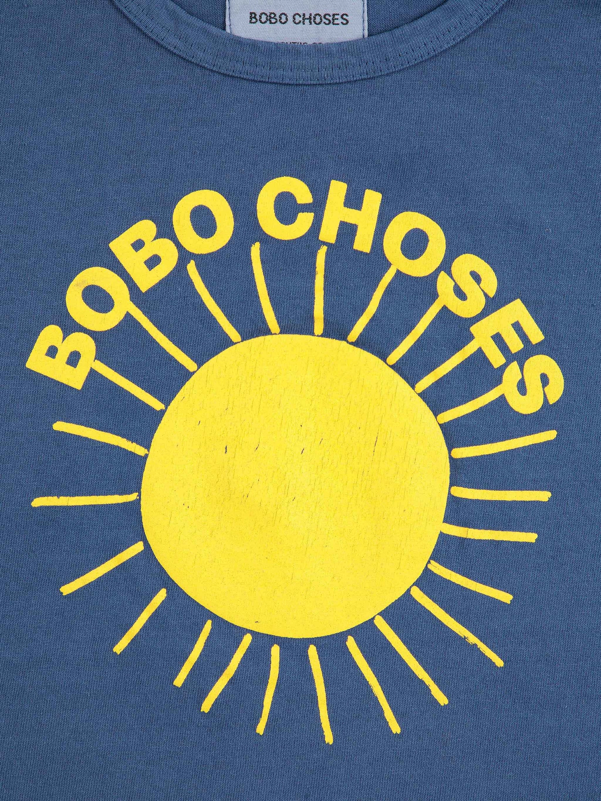 The navy blue ‘Sun’ T-shirt features a bright yellow Bobo Choses illustration on the front. Crafted from responsibly sourced recycled cotton, this T-shirt is both breathable and comfortable. Its timeless, sporty design includes long sleeves with dropped shoulders to keep babies warm. The loose fit offers easy movement.