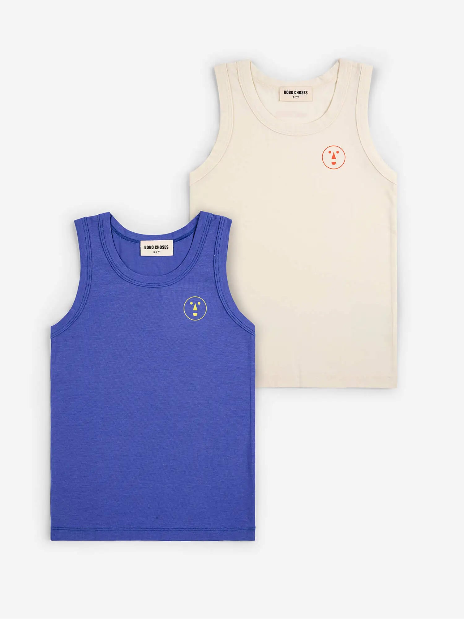 Blue and white tank top set made from 45% modal, 43% organic cotton and 12% elastane. Designed with sleeveless, slim fit and wide round neck.