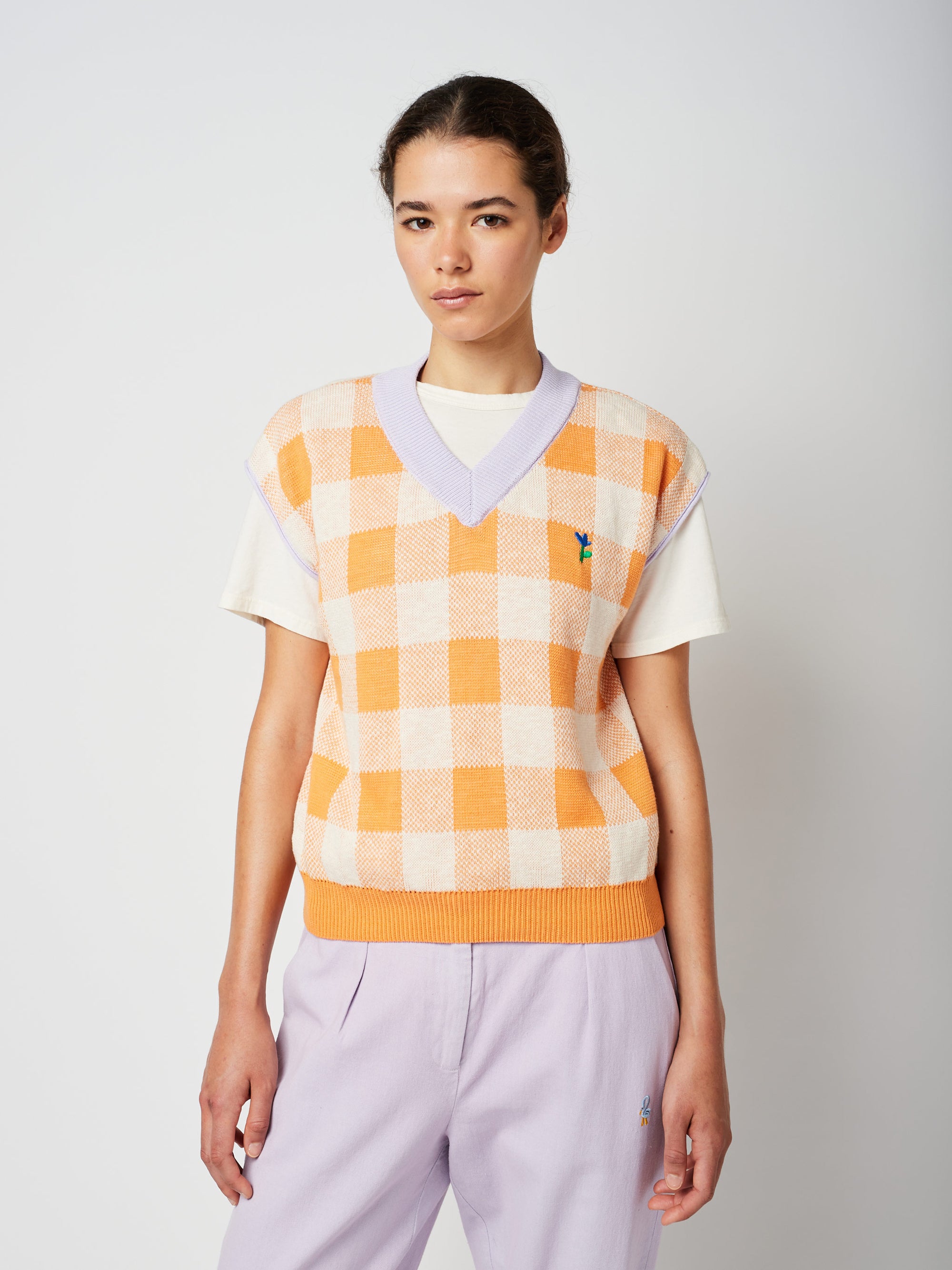 100% cotton peach sleeveless jumper. Designed with embroidery, jacquard and ribbed bottom. It has a cropped fit. Made in Spain