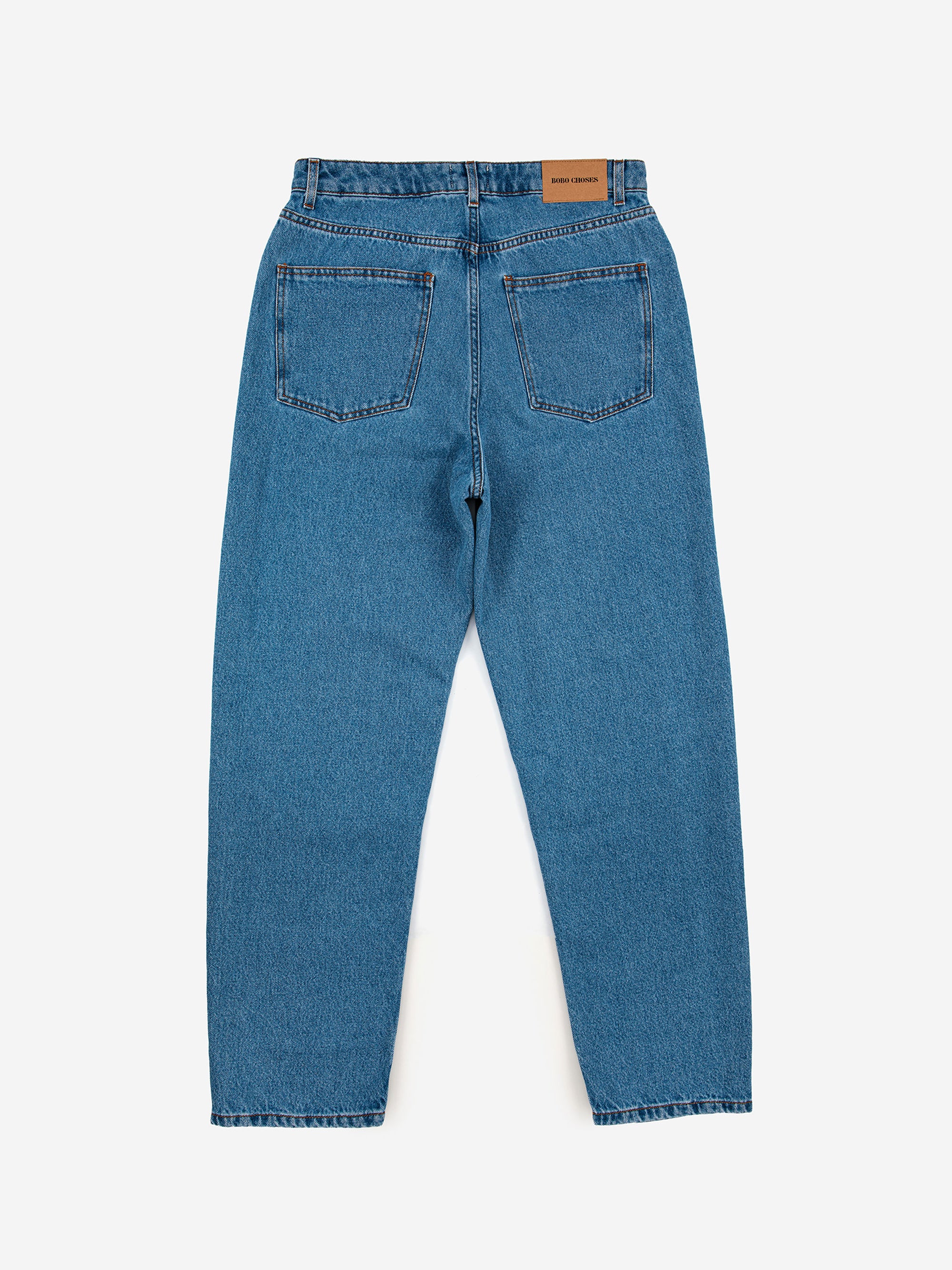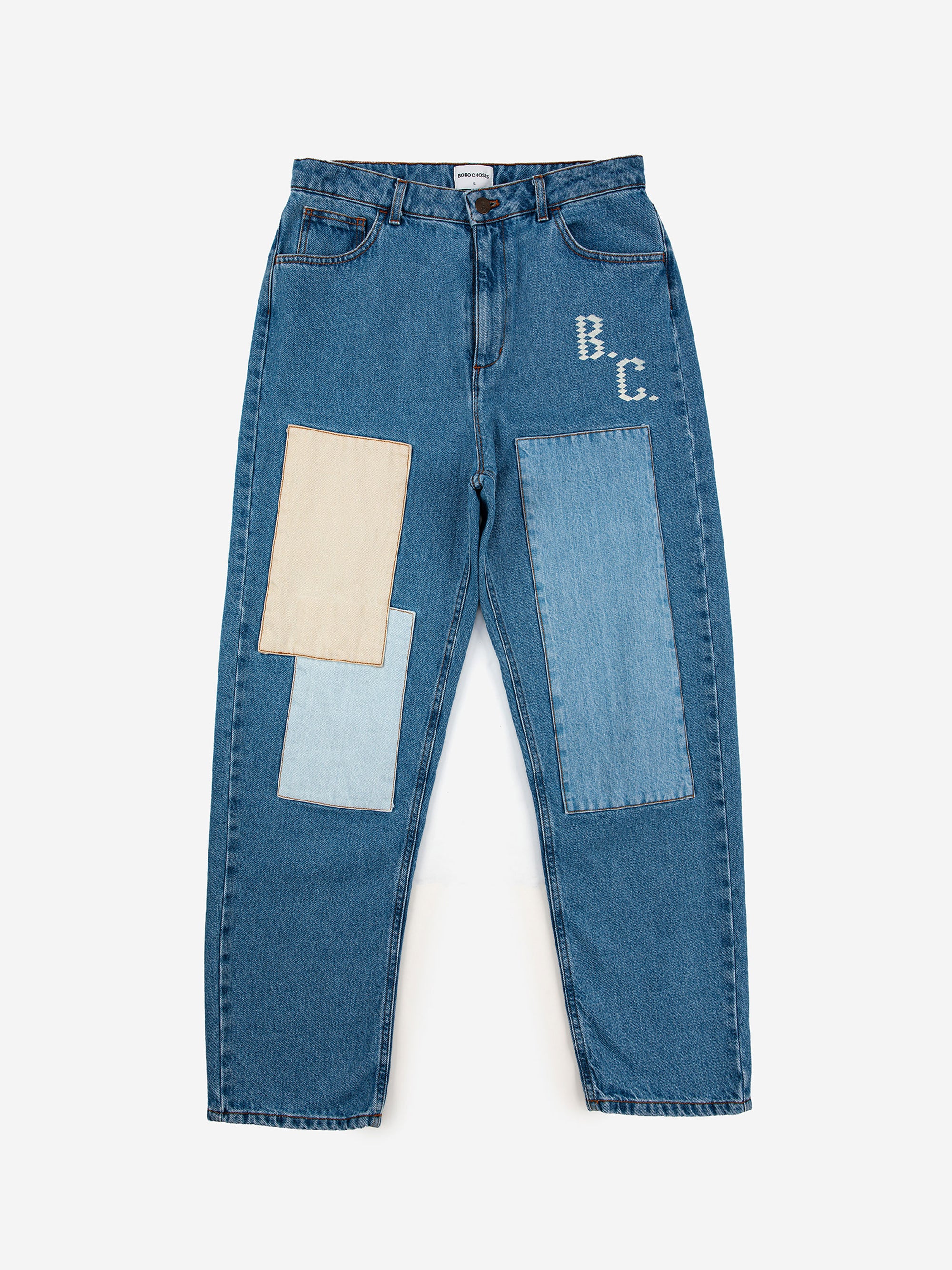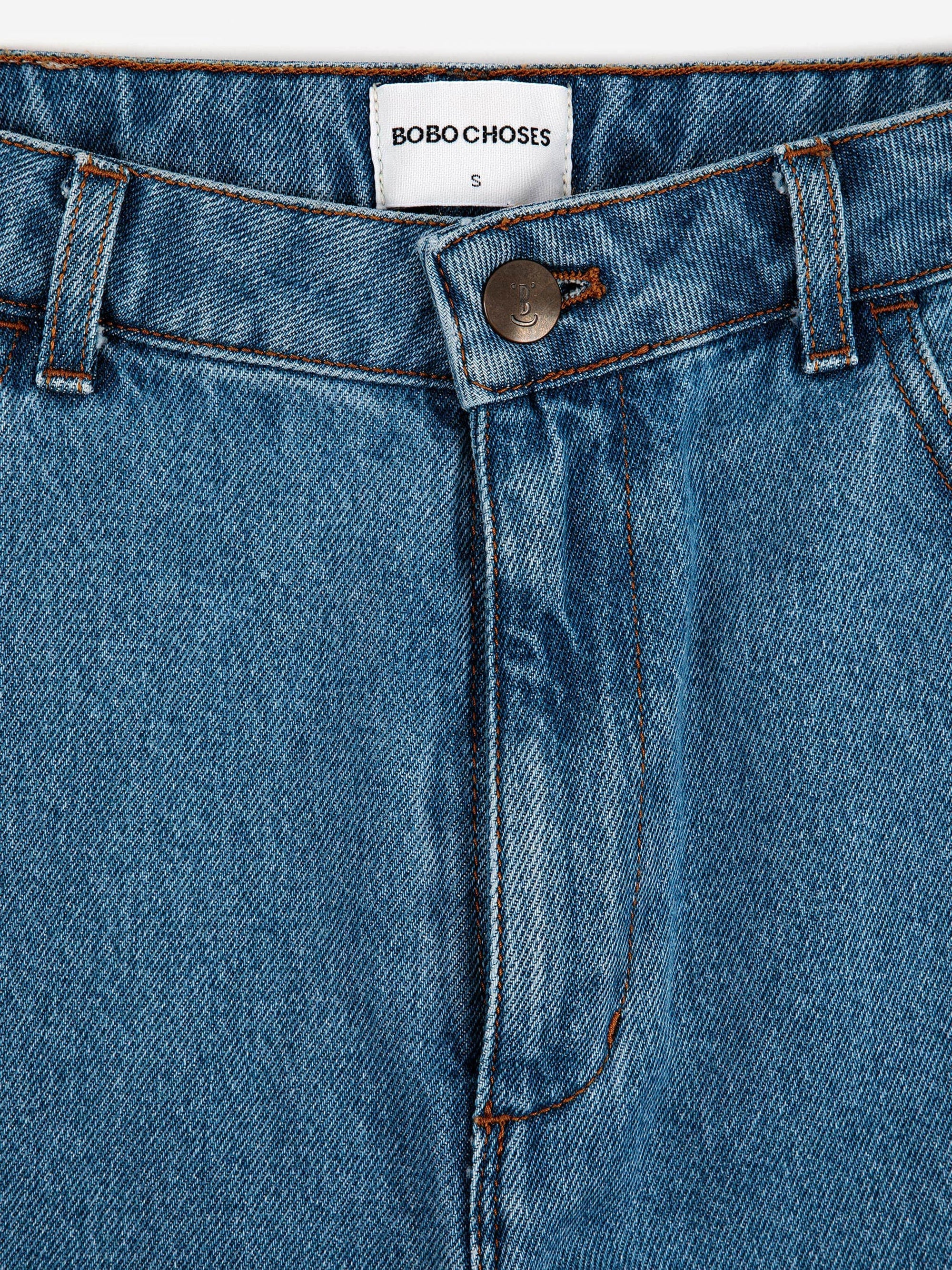 79% cotton 21% recycled cotton blue denim pants. Designed with placketed, multi-pockets, contrast fabric details, regular, beltloop and relaxed crotch. It has a baggy fit. Made in Spain