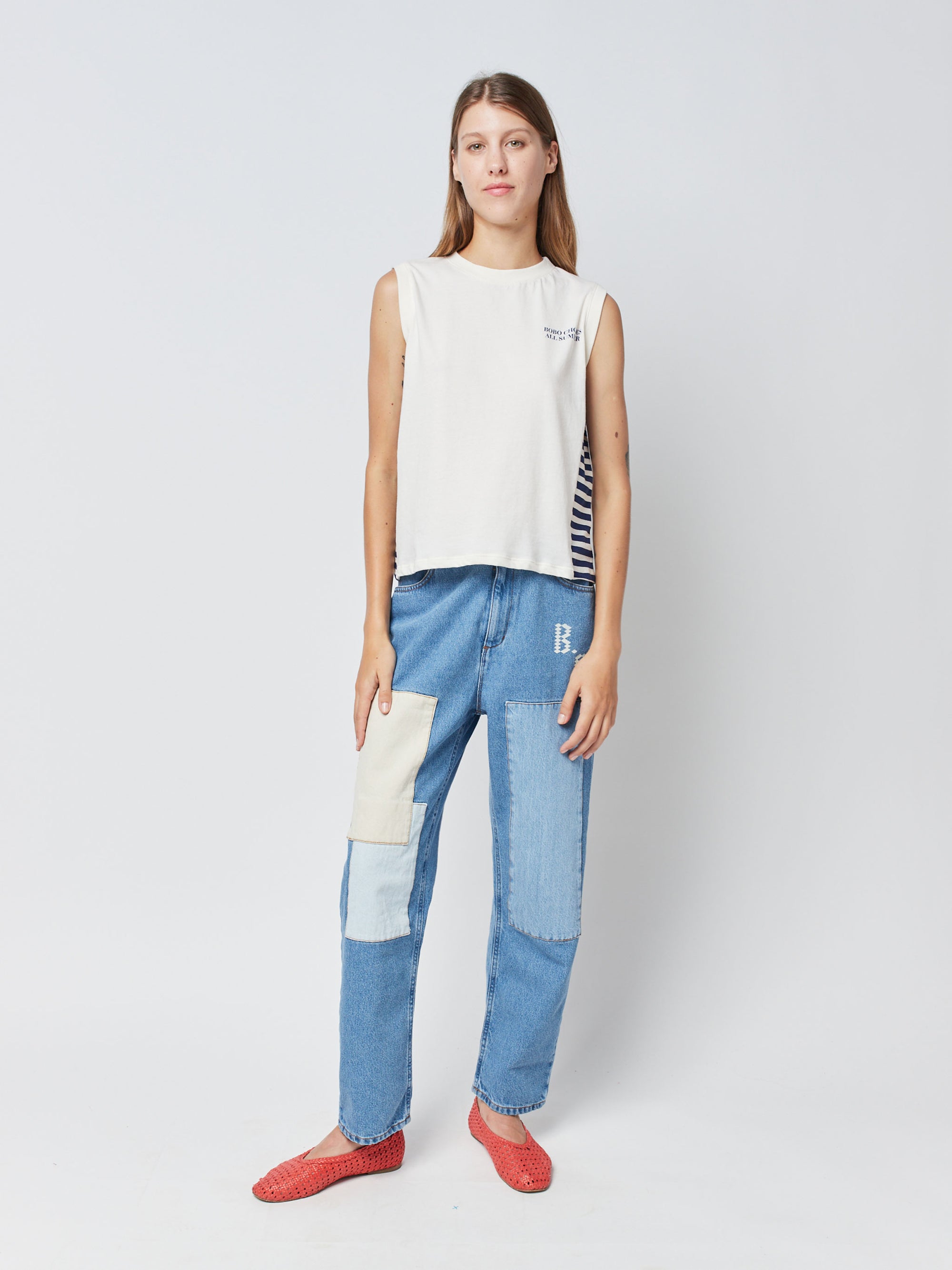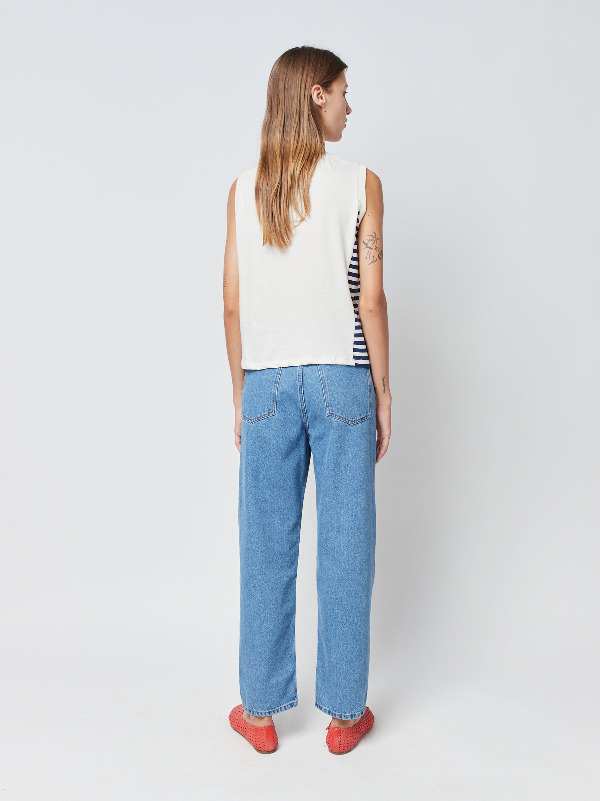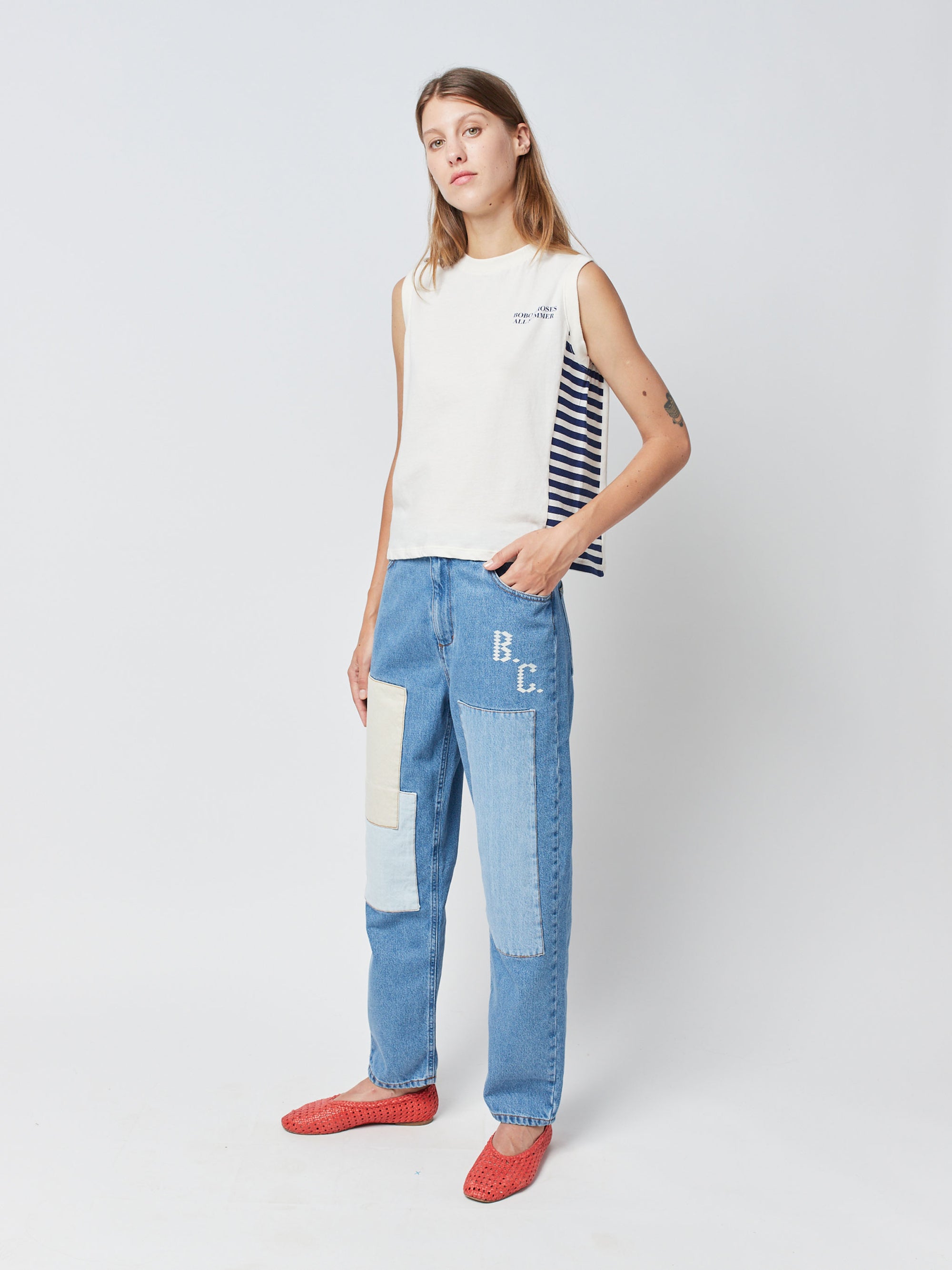 79% cotton 21% recycled cotton blue denim pants. Designed with placketed, multi-pockets, contrast fabric details, regular, beltloop and relaxed crotch. It has a baggy fit. Made in Spain