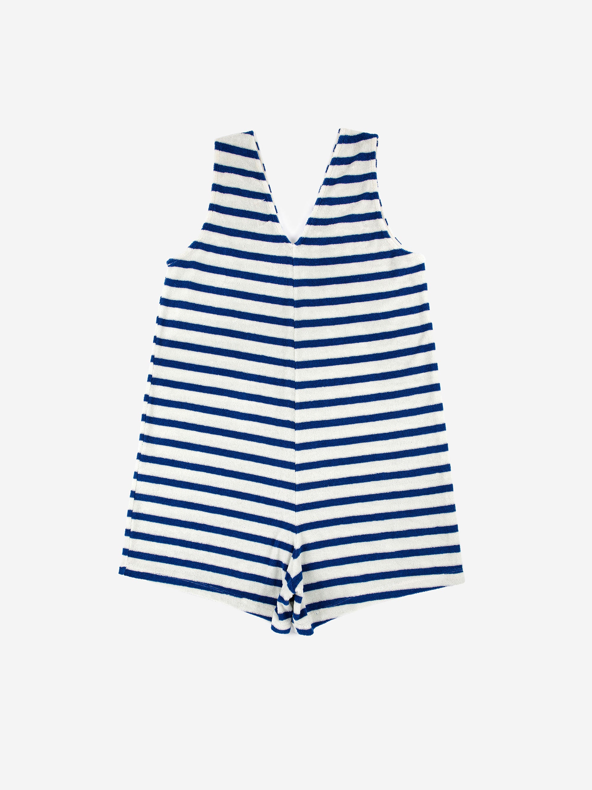 58% organic cotton 30% cotton 12% polyester light blue sleeveless playsuit. Designed with v-neck, embroidery, short and relaxed crotch. It has a relaxed fit. Made in Spain