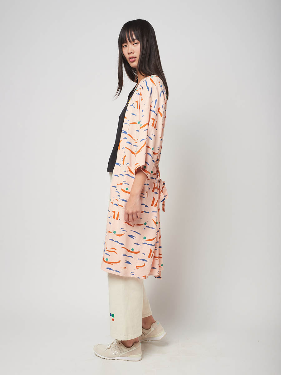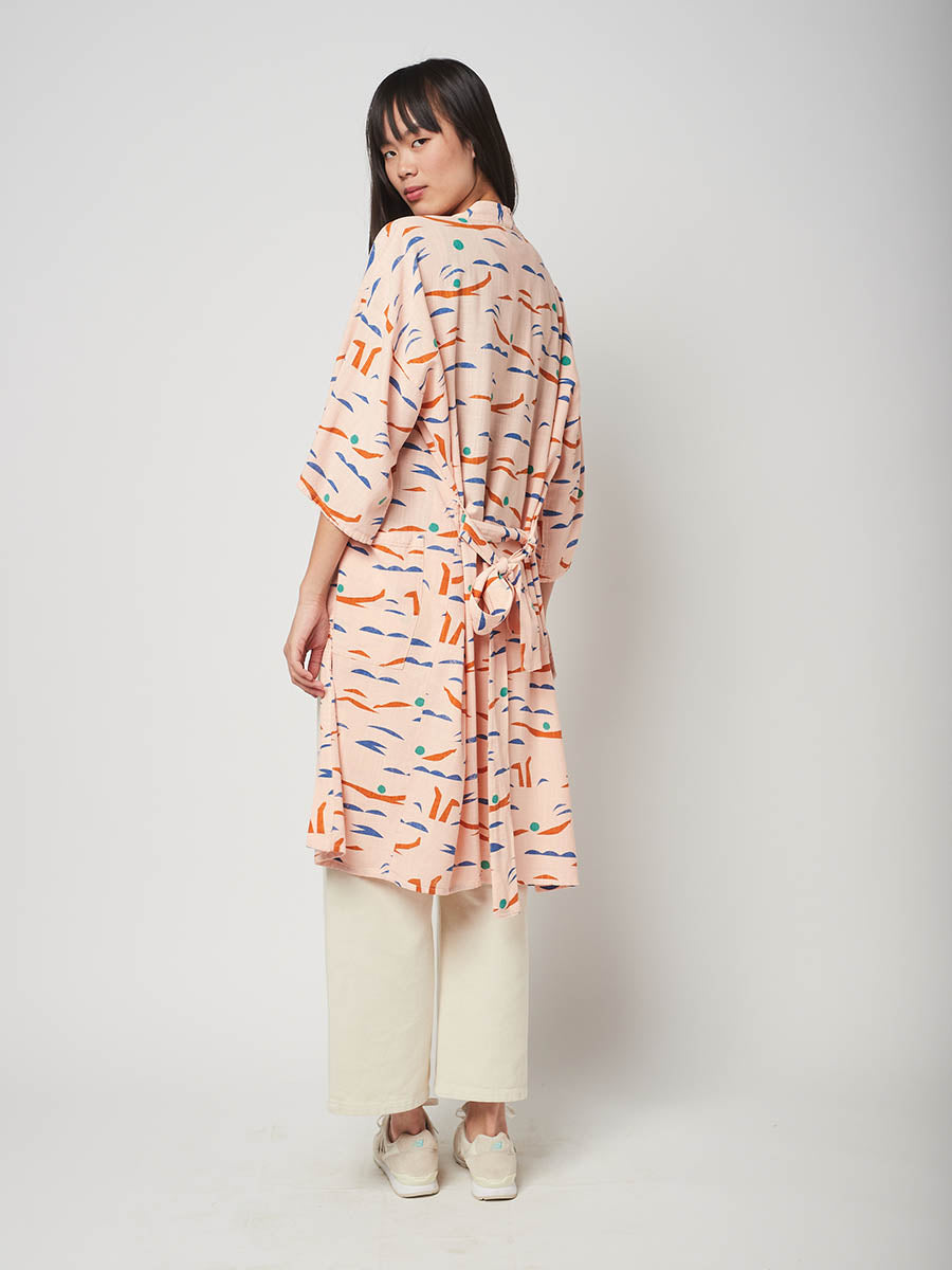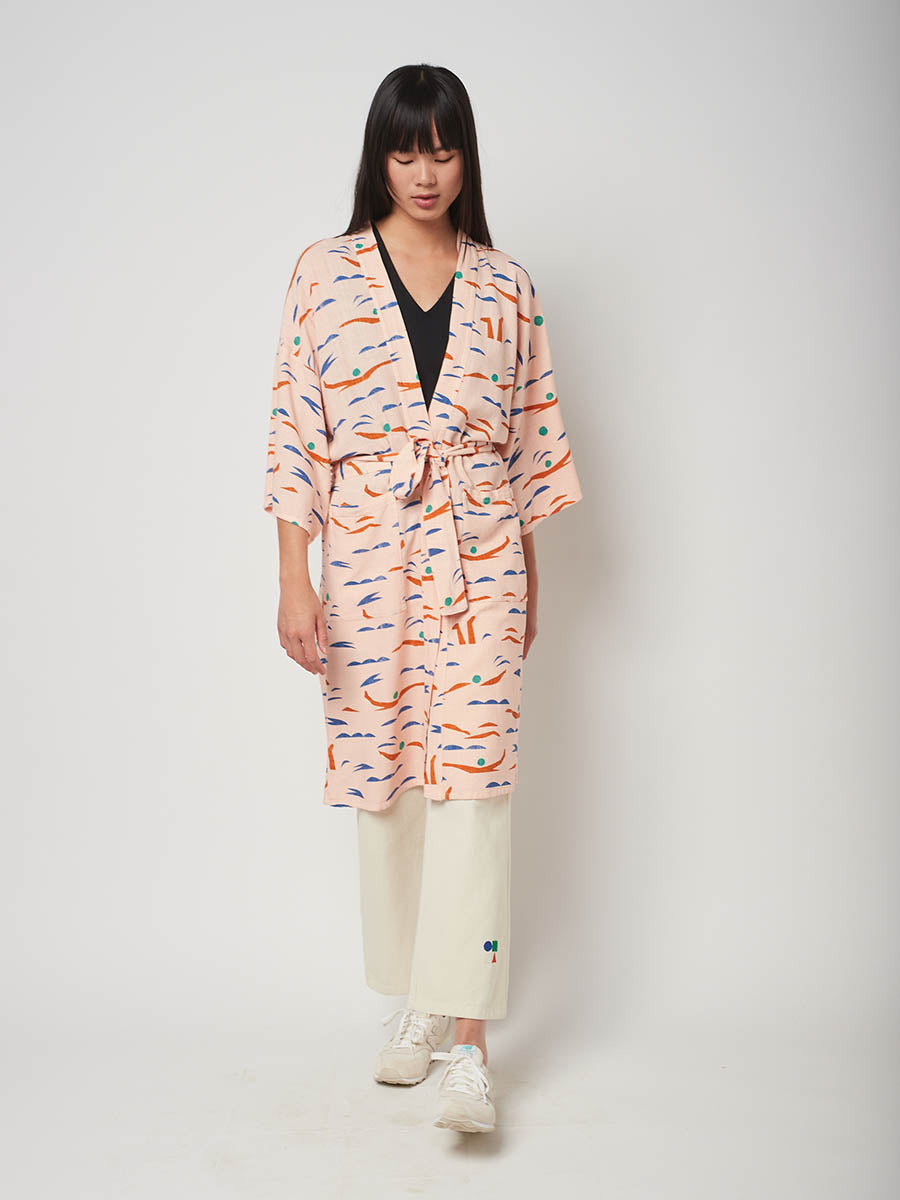 80% viscose 20% linen light pink cape. Designed with 3/4 sleeves, embroidery, beltloop, below knee length and patch pocket. It has a oversize fit. Made in Spain