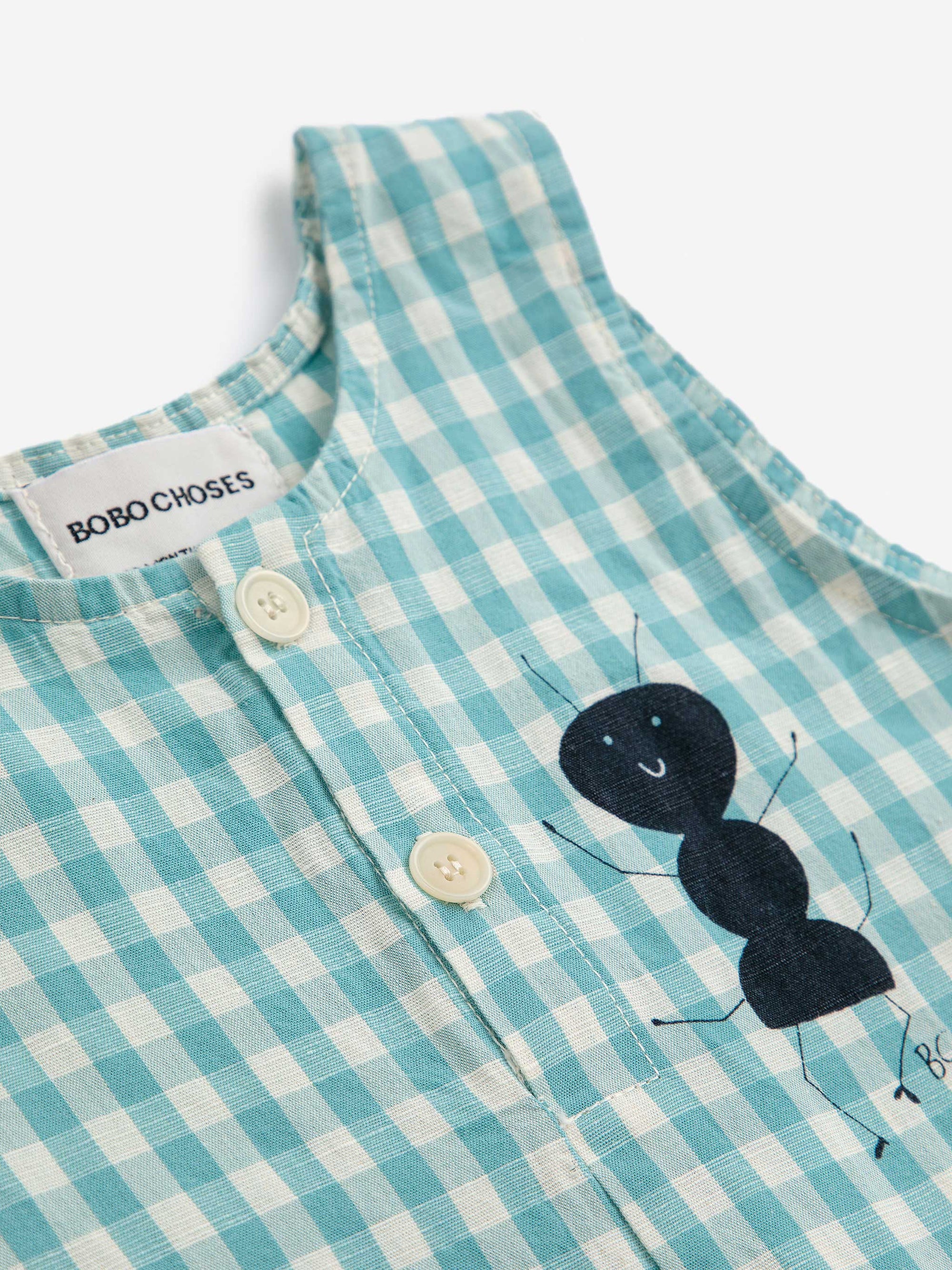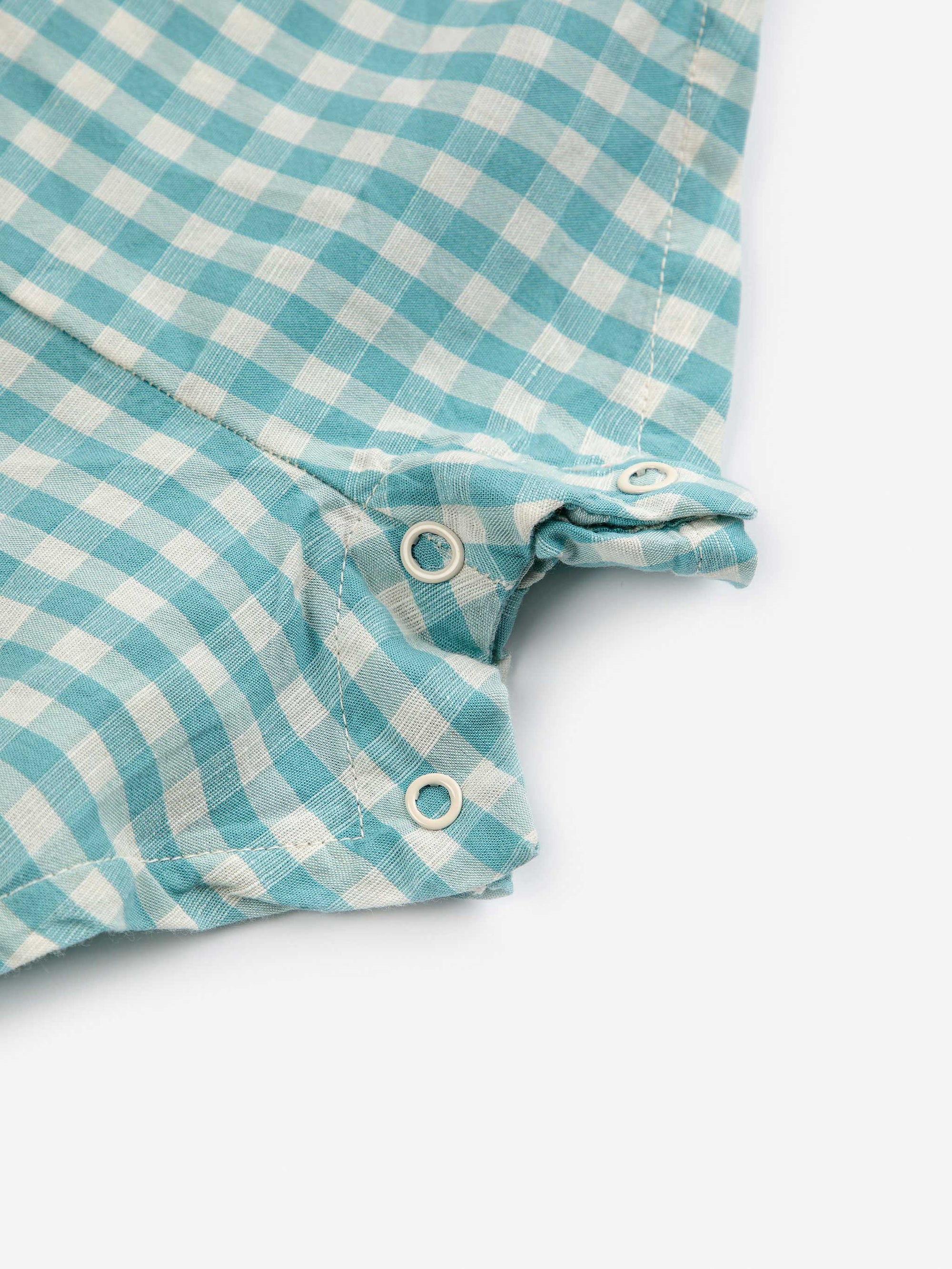 79% cotton, 21% linen turquoise playsuit. Designed with sleeveless, front button fastening, crotch snap fastening, straight fit and round neck. Made in Spain.