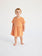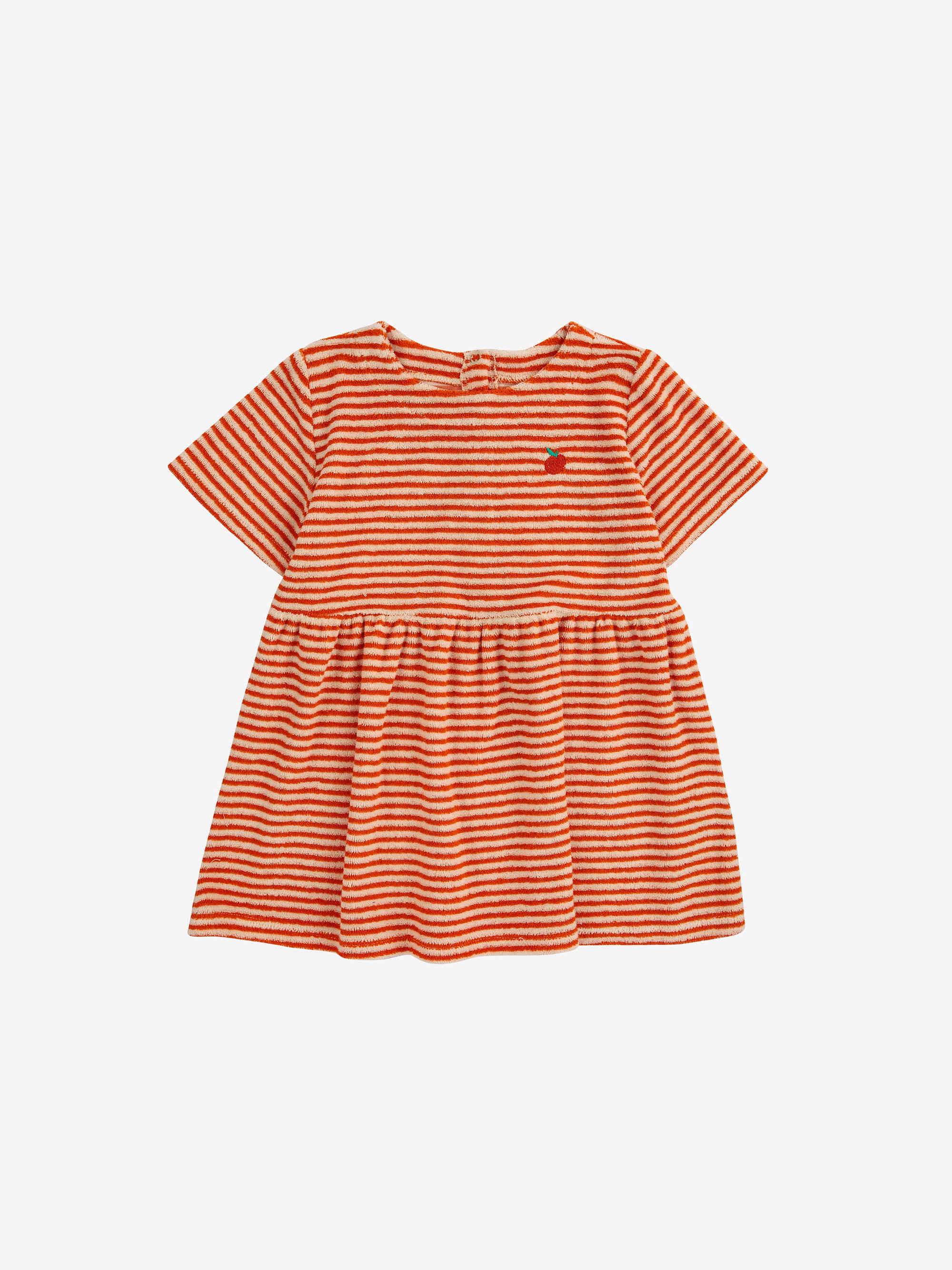 46% organic cotton, 42% cotton, 12% polyester orange dress. Designed with short sleeves, dropped shoulder, back snap fastening, embroidery, evasé fit, short and round neck. Made in Spain.