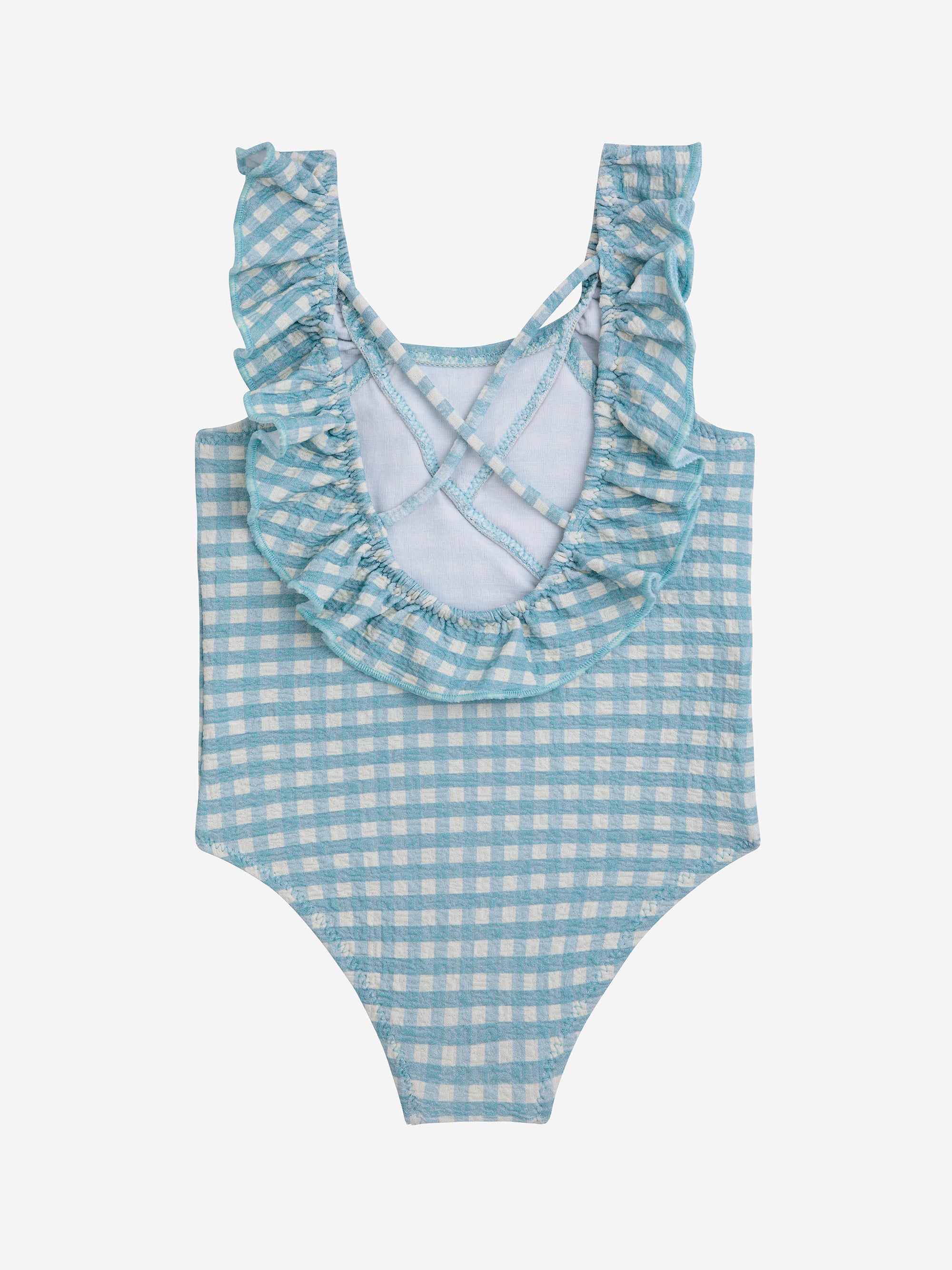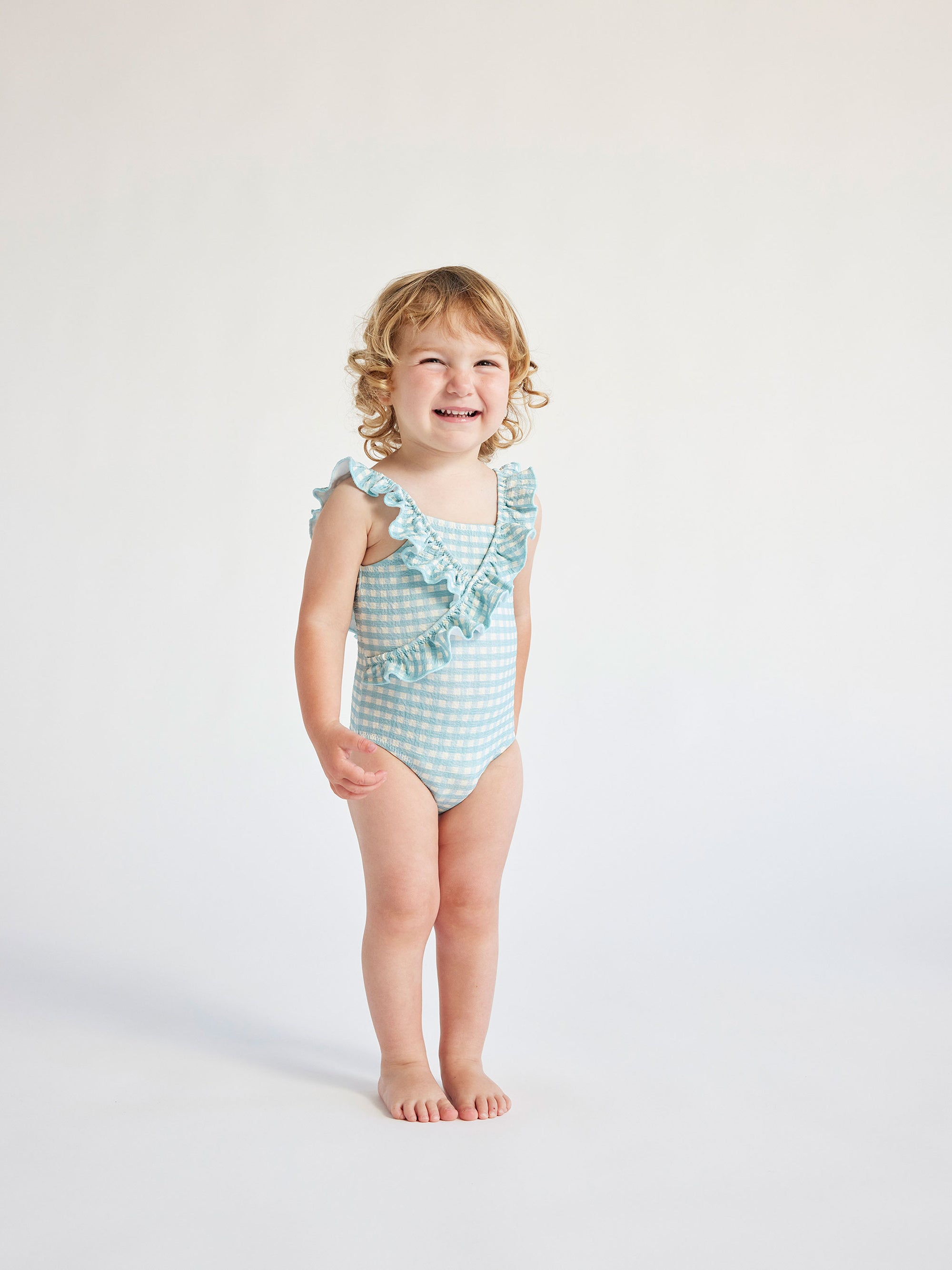 80% polyamide, 20% elastane aqua blue swimsuit. Designed with slim fit and ruffled detailing. Made in Spain.
