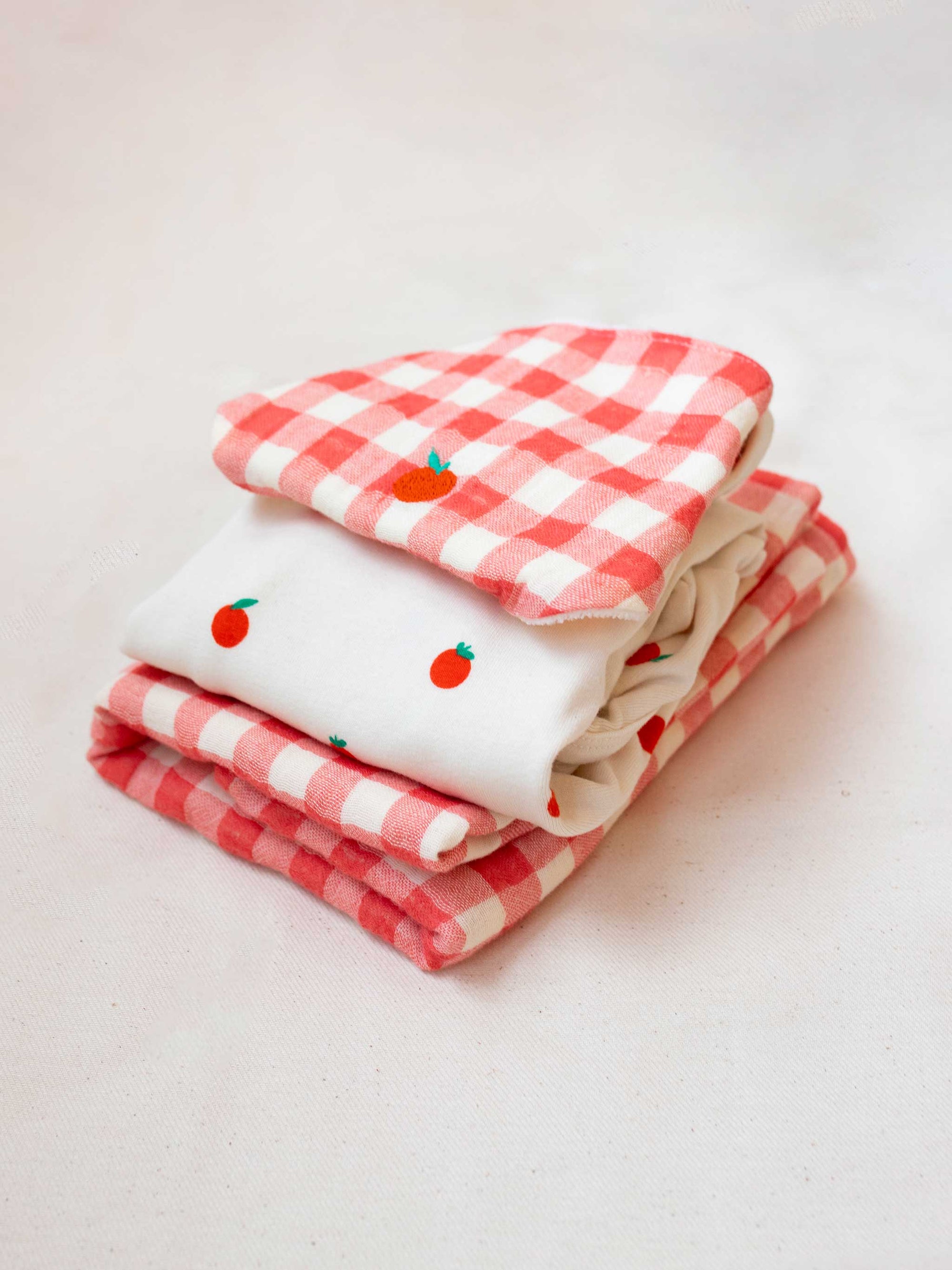 Baby gift packs featuring a unique selection of colours, prints, and fabrics exclusive to these sets. The perfect gift for new families! Made in Spain.