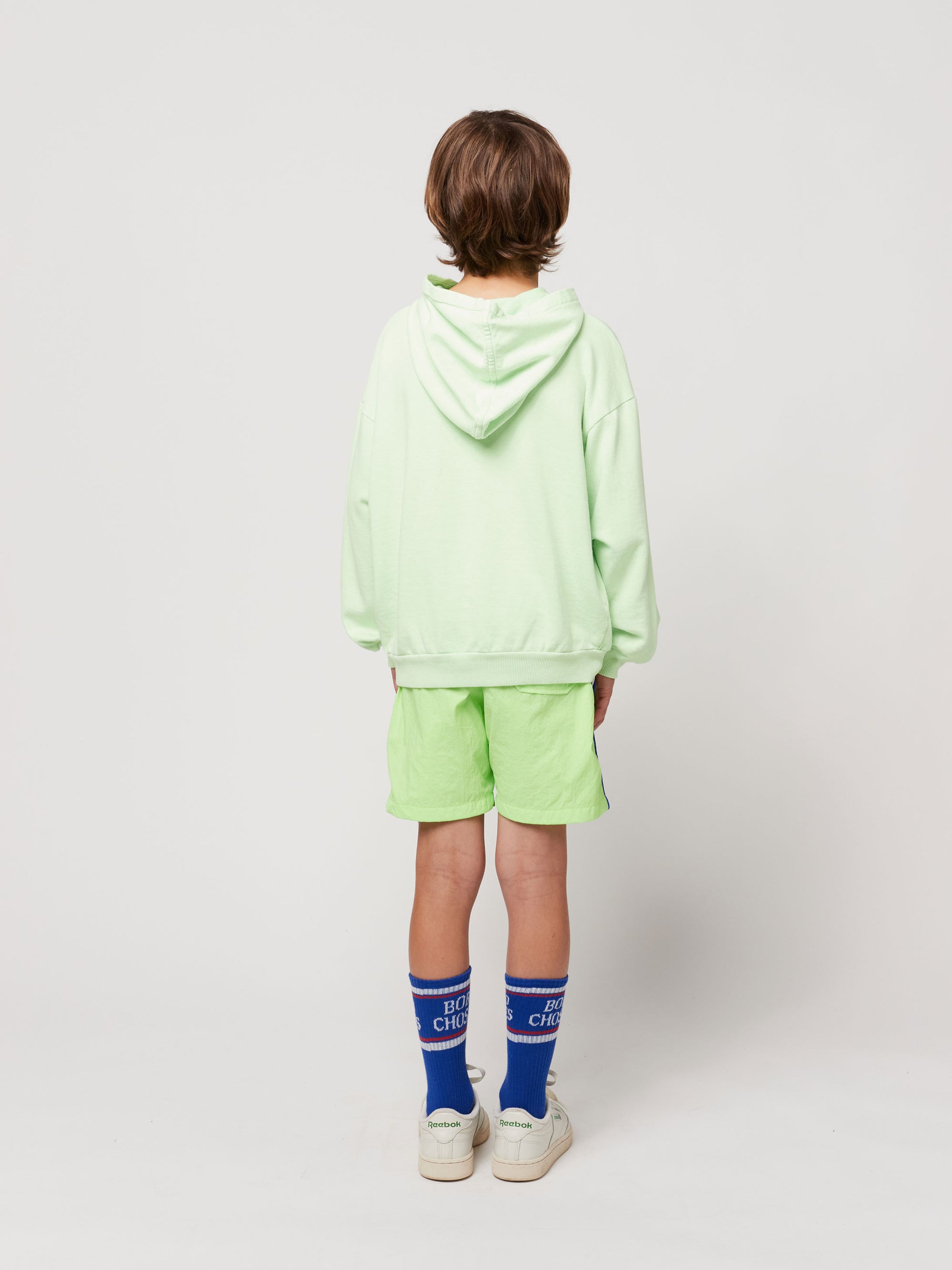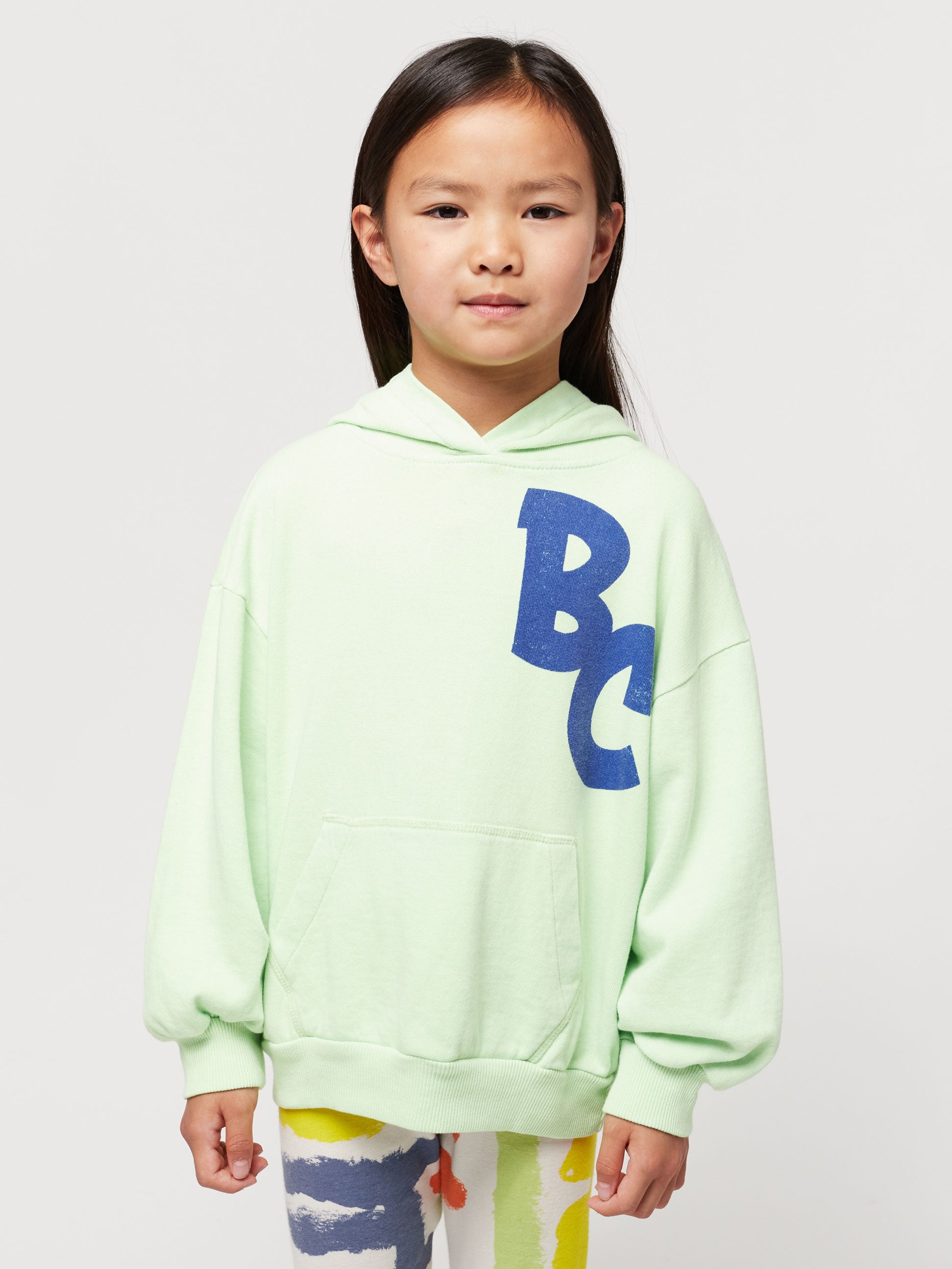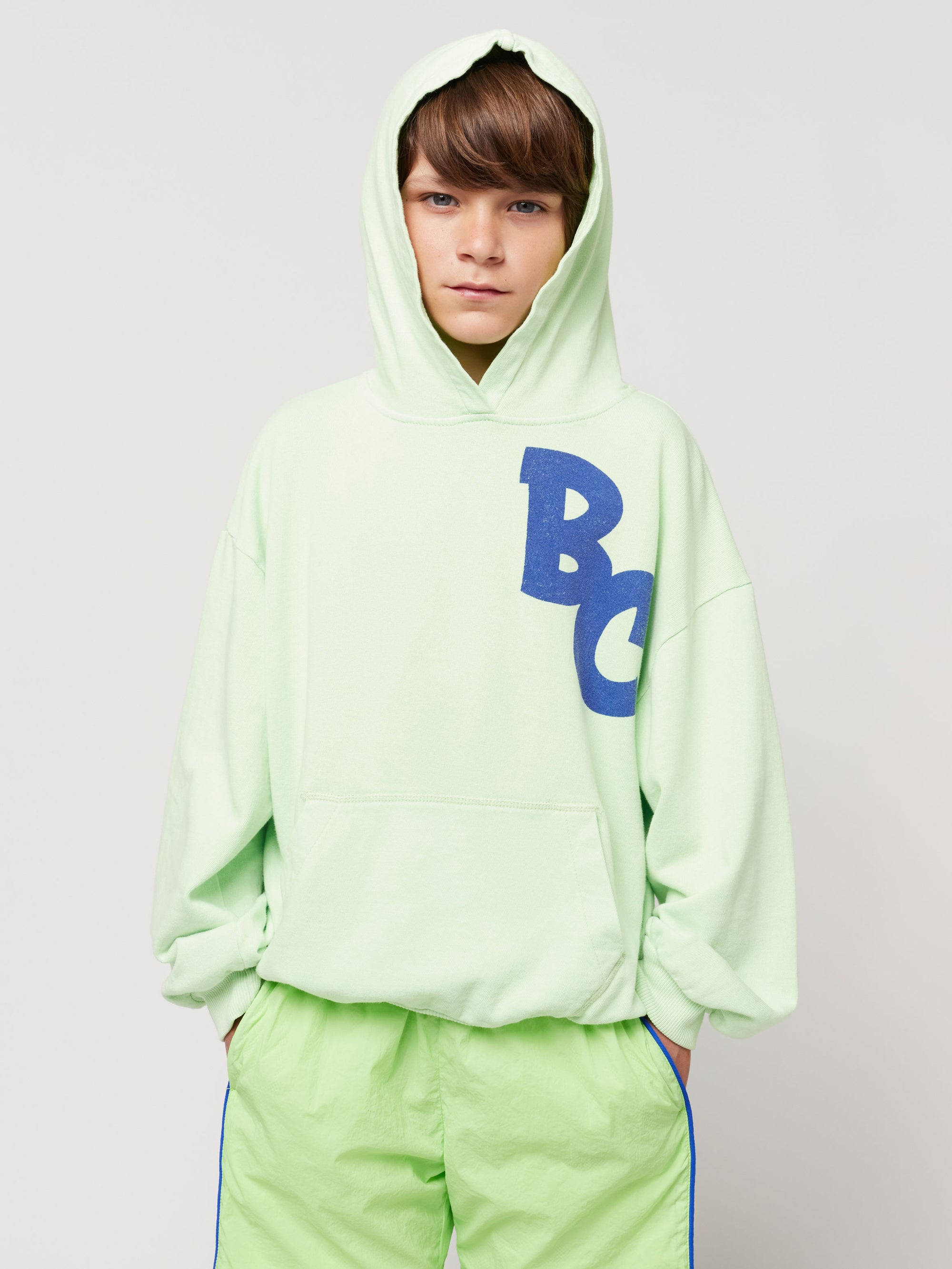 100% organic cotton jade green sweatshirt. Designed with hooded, long sleeves, ribbed cuffs, loose fit, ribbed bottom, kangaroo pocket and fleece. Made in Spain.