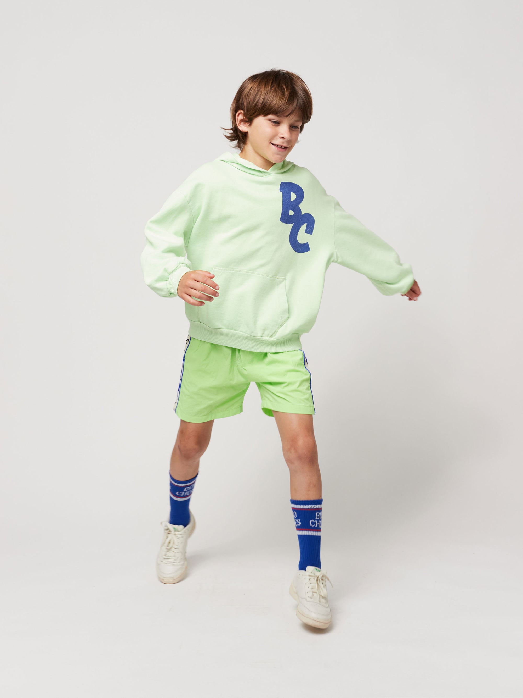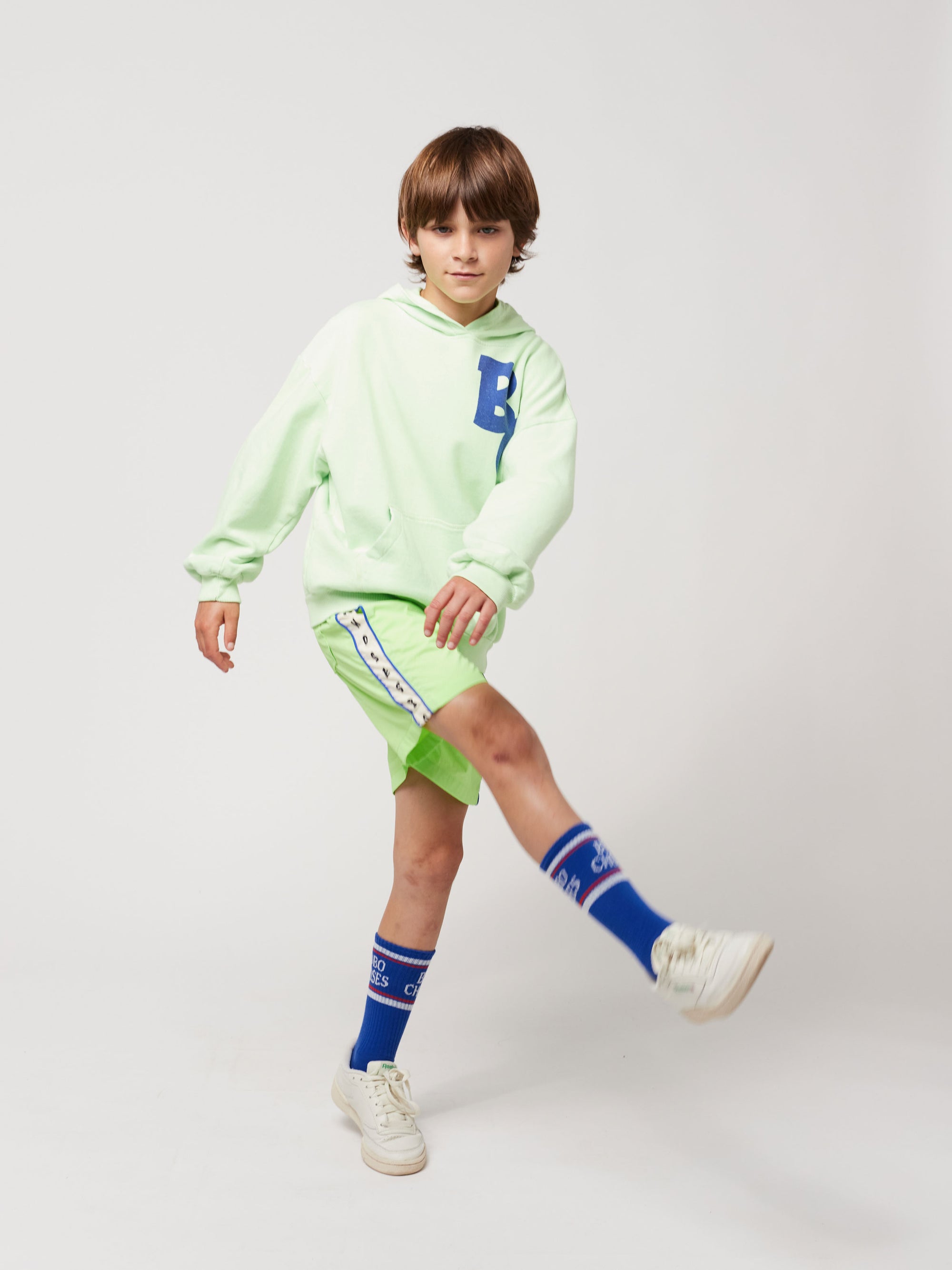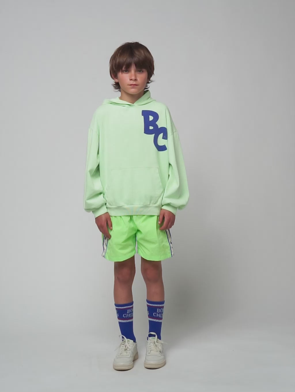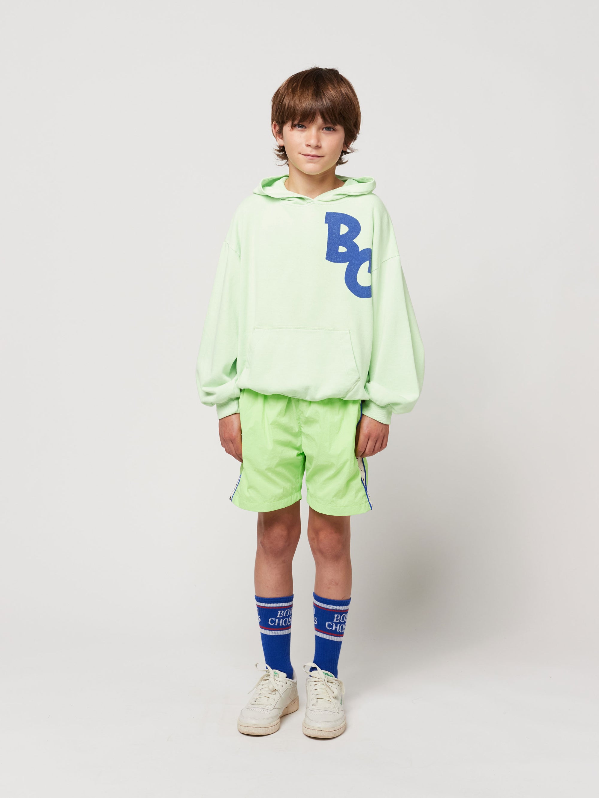 100% organic cotton jade green sweatshirt. Designed with hooded, long sleeves, ribbed cuffs, loose fit, ribbed bottom, kangaroo pocket and fleece. Made in Spain.