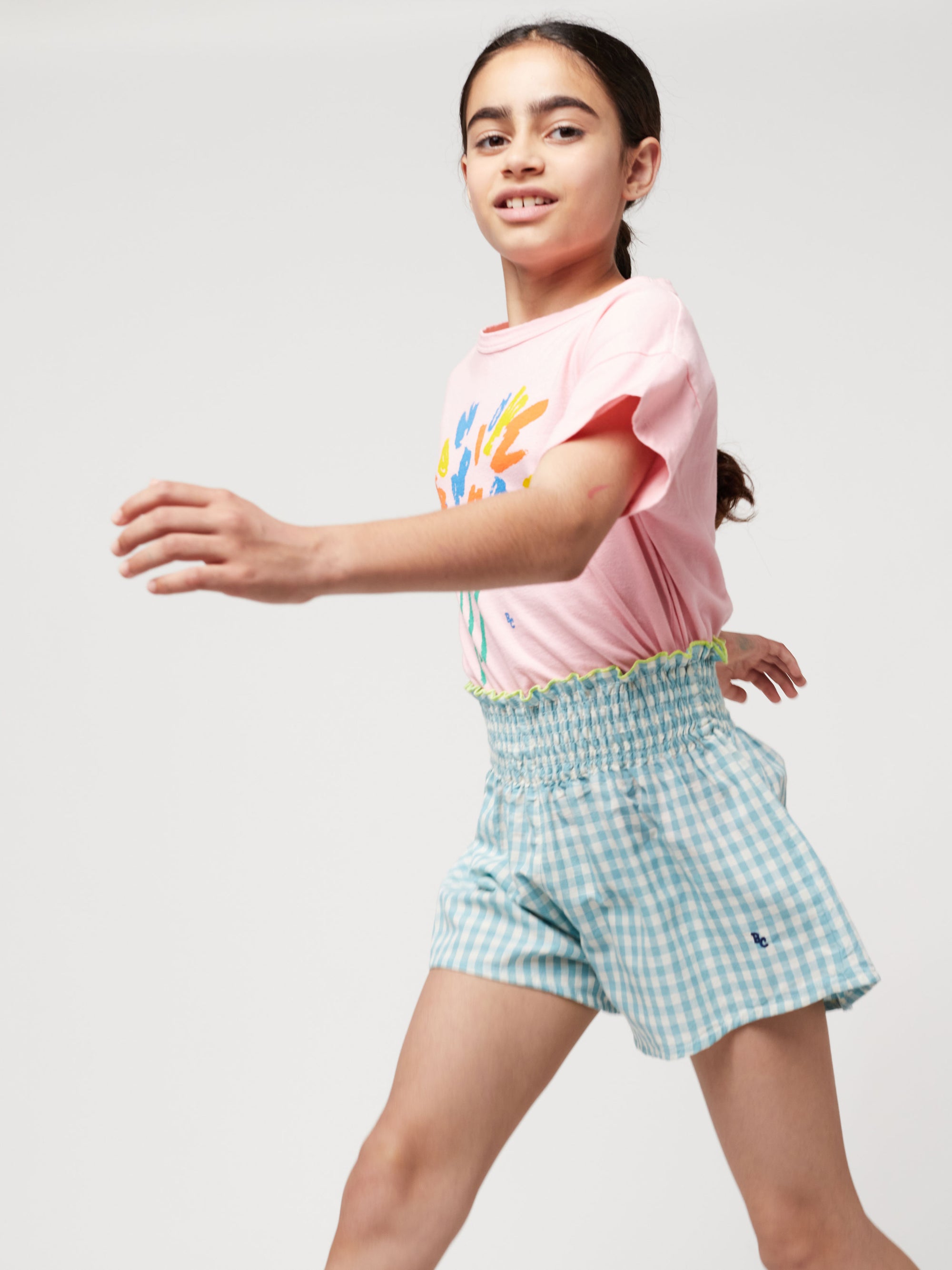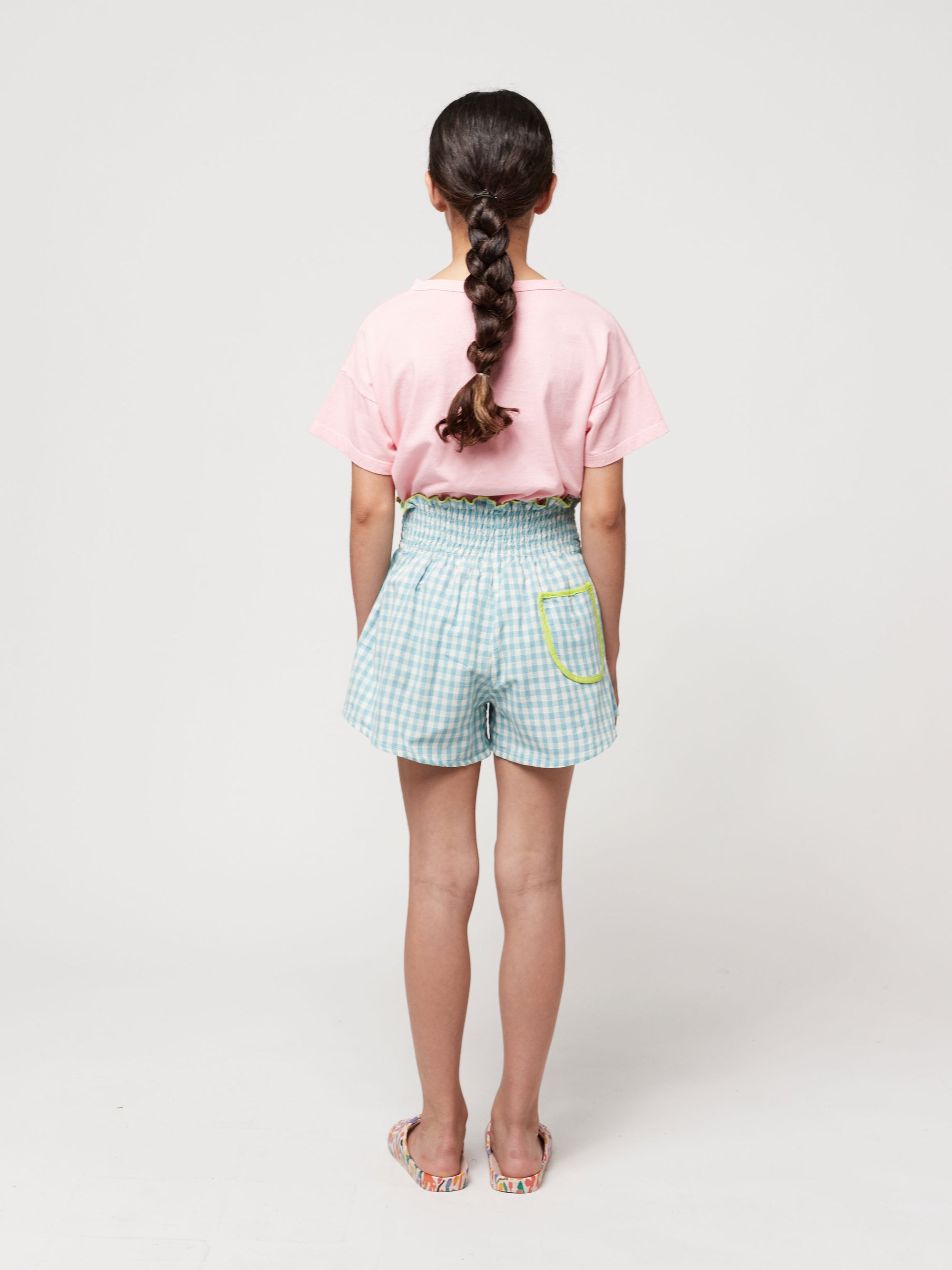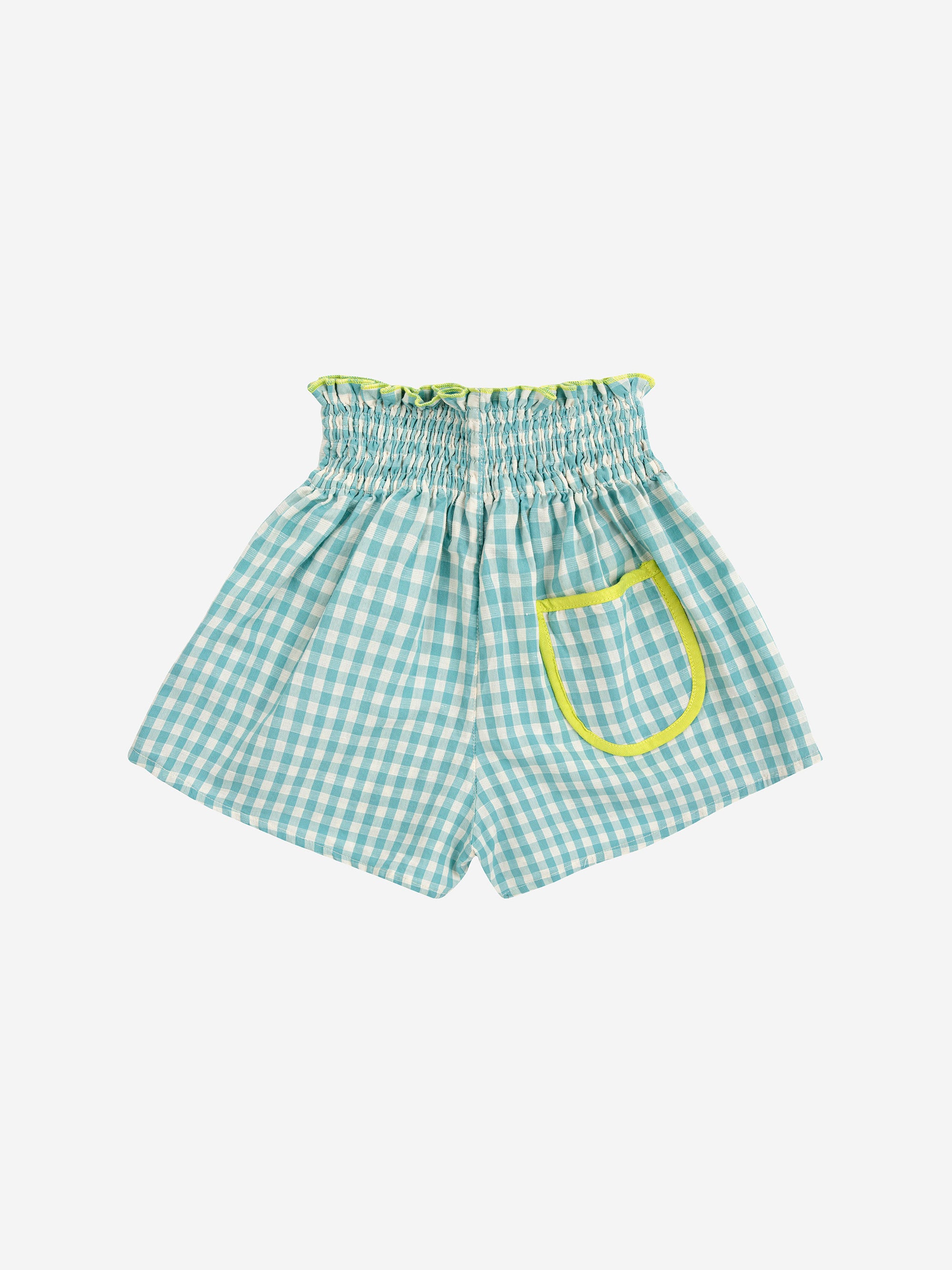 79% cotton, 21% linen light blue shorts. Designed with regular crotch, elasticated waistband, evasé fit, regular, short, patch pocket, seam pocket, linen blend and contrast topstitching. Made in Spain.