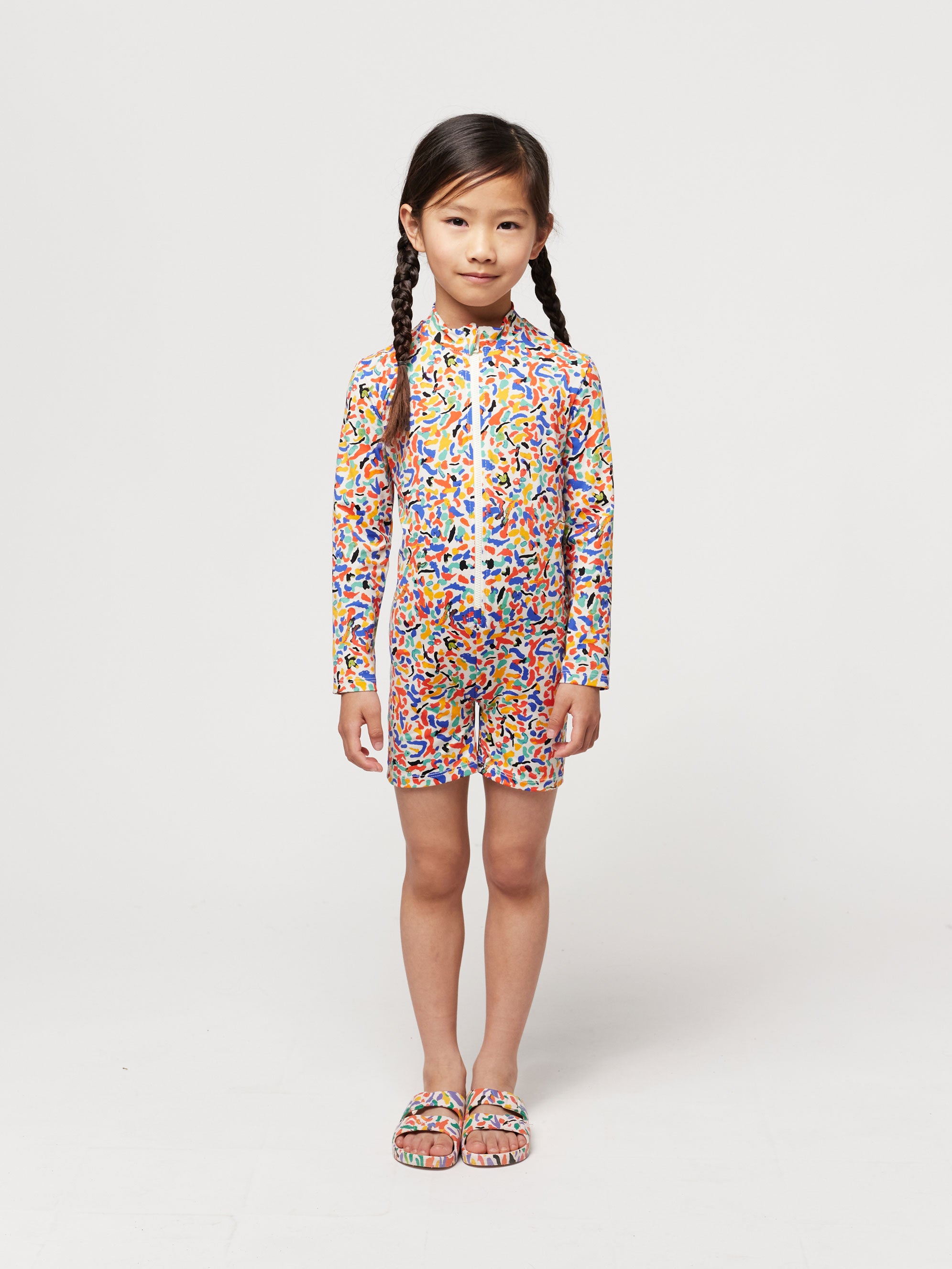 83% polyamide, 17% elastane multicolor swim overall. Designed with long sleeves, regular crotch, front zip fastening, slim fit, over knee length and high neck. Made in Spain.
