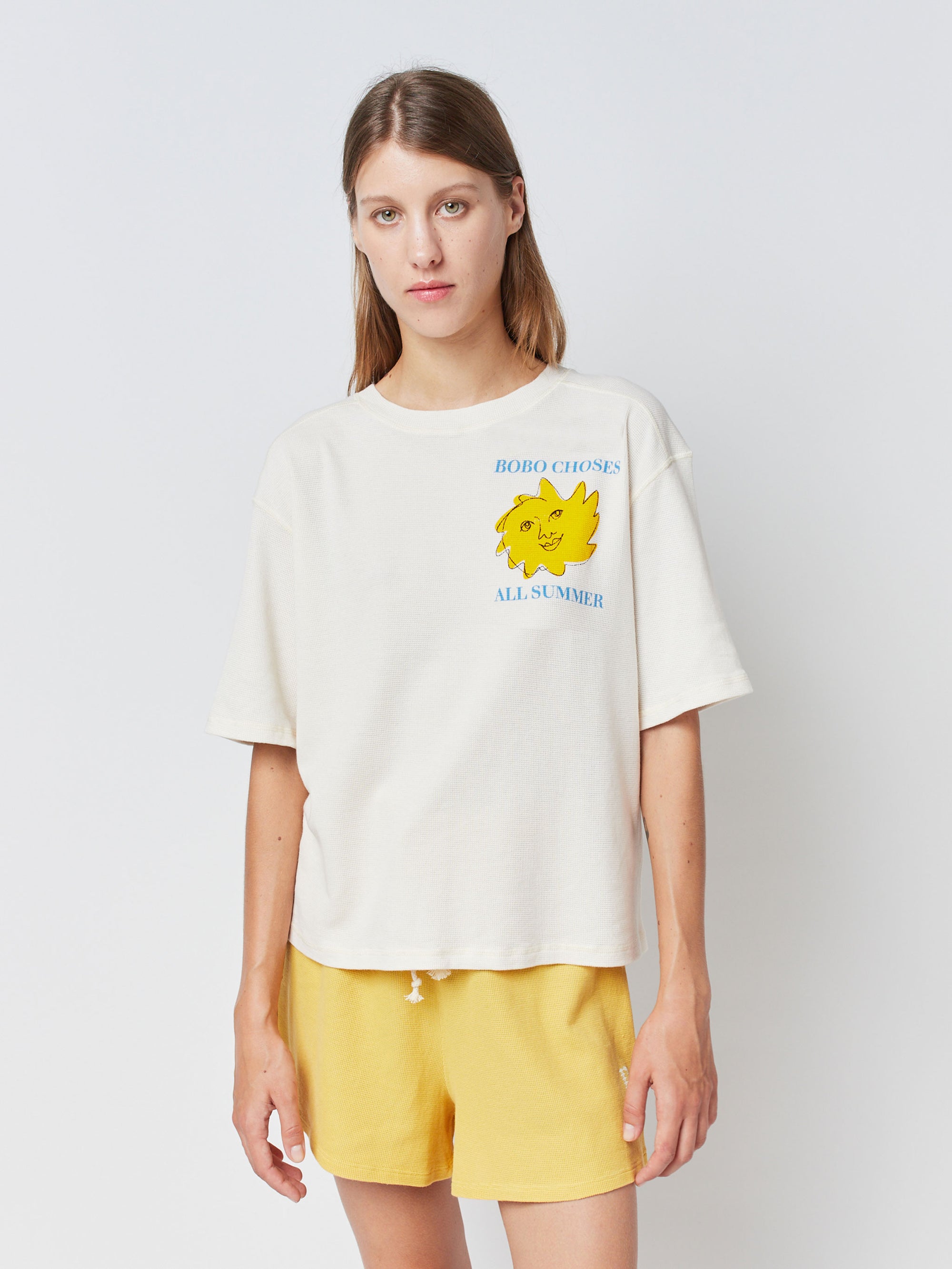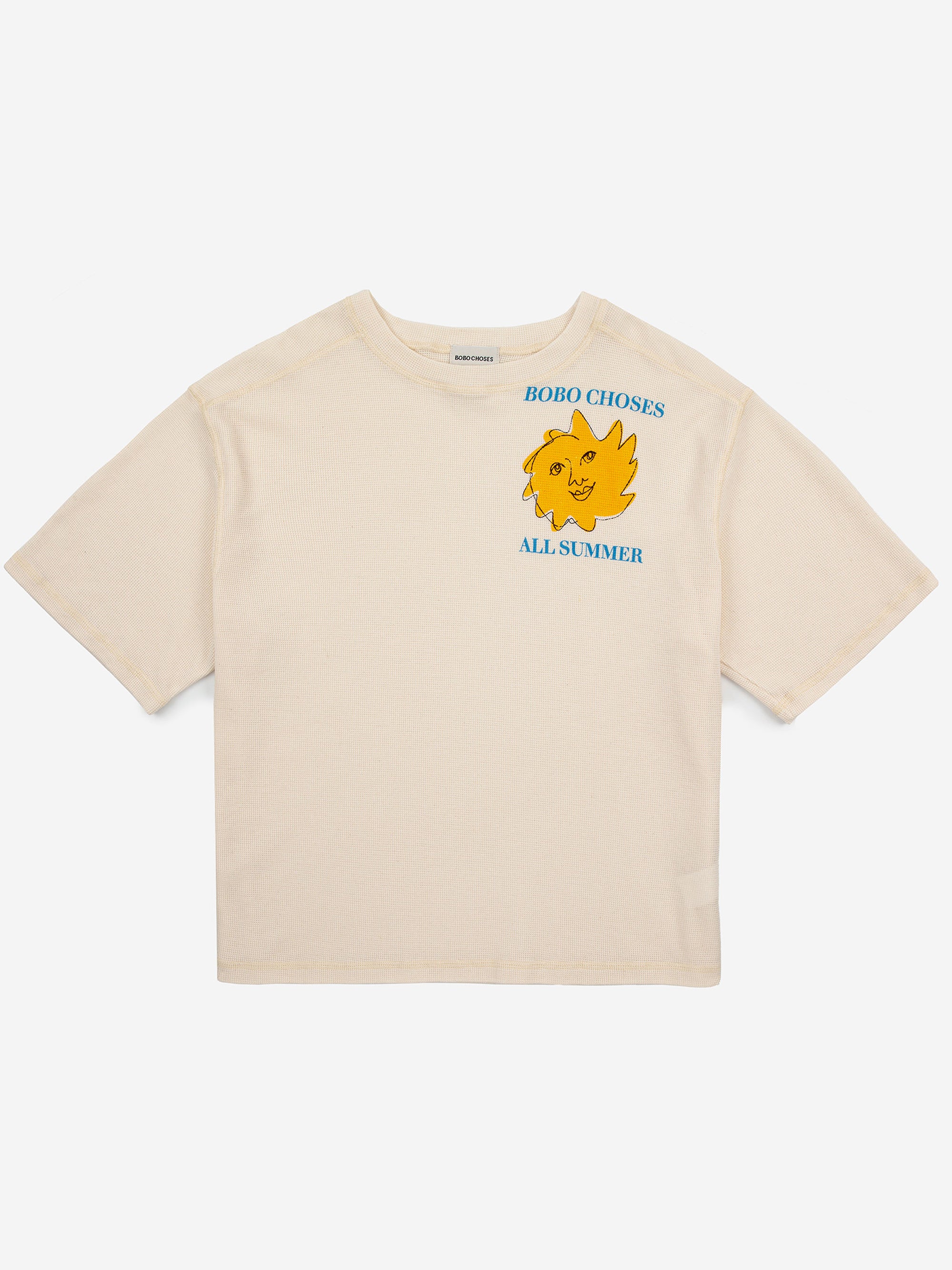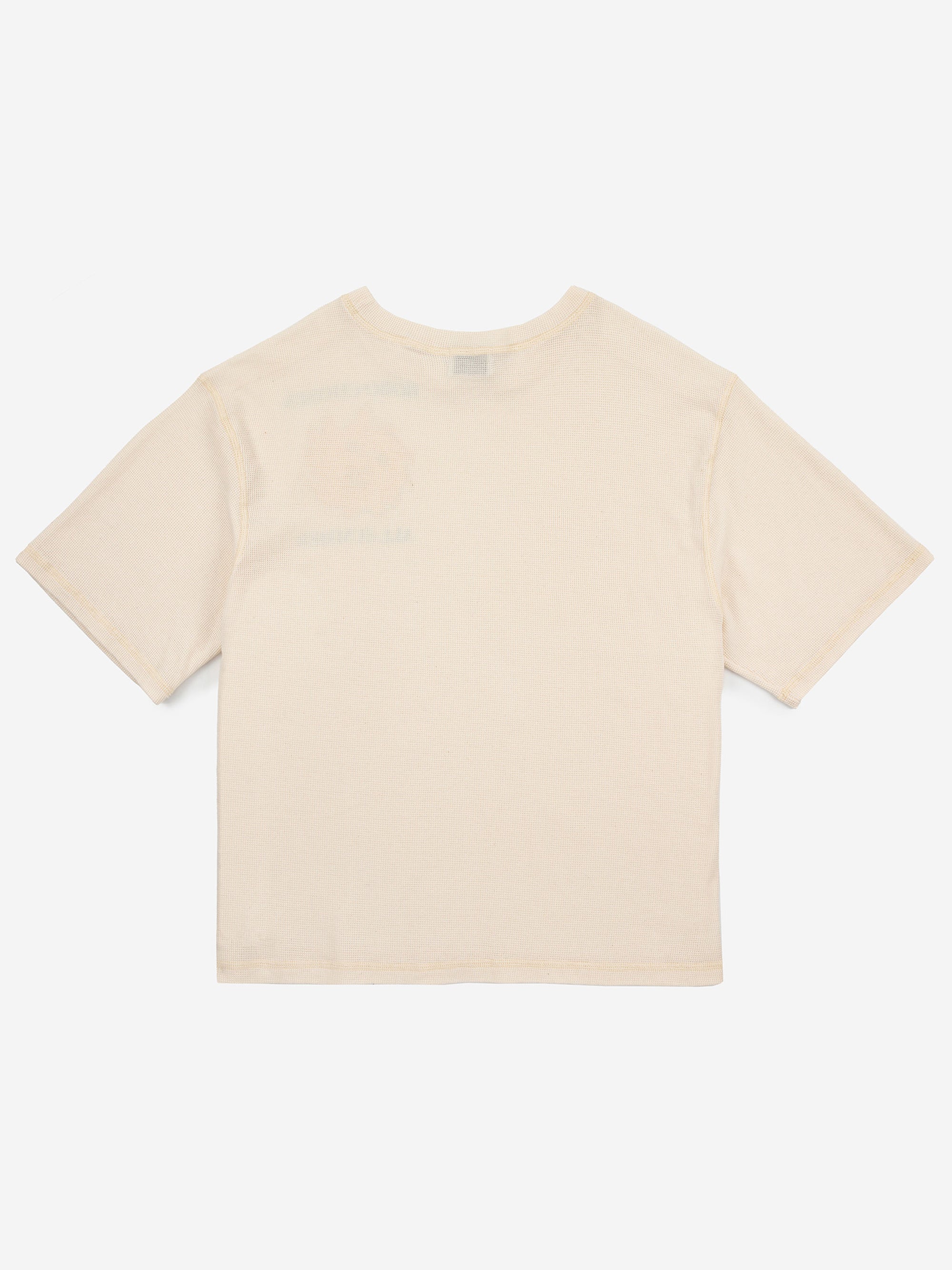 100% organic cotton offwhite short sleeve t-shirt. Designed with adjustable straps, elasticated waistband and ruffled detailing. Made in Spain