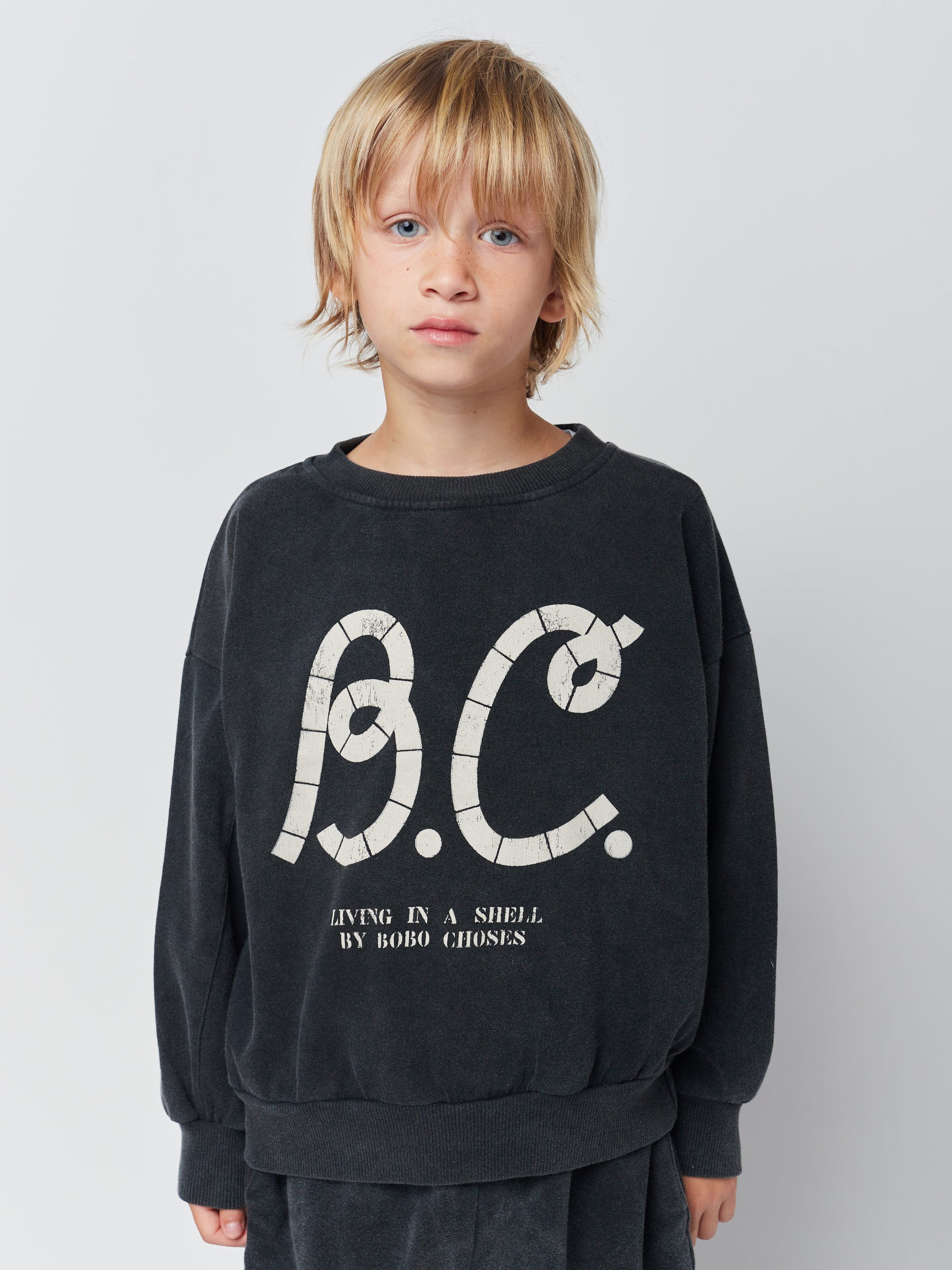 100% organic cotton dark grey round neck sweatshirt. Designed with long sleeves, ribbed cuffs, ribbed bottom, round neck and fleece. It has a loose fit. Made in Spain