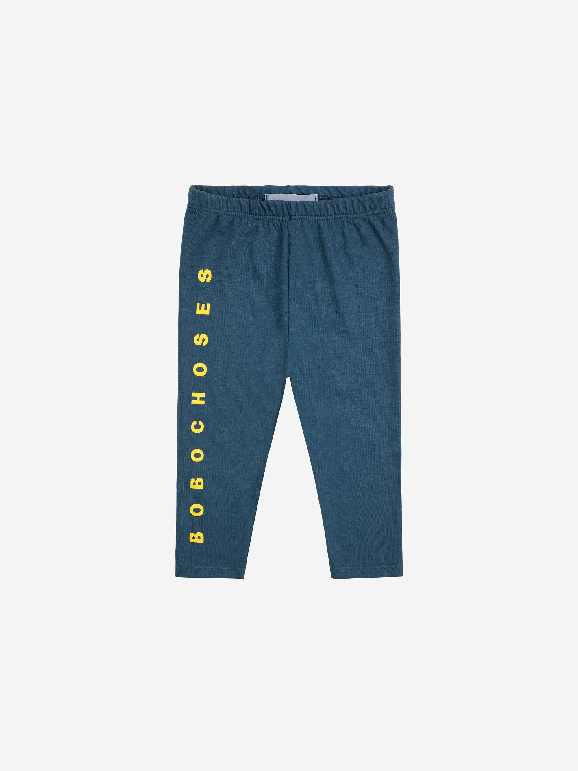 The ankle-length midnight blue leggings for babies feature a bright yellow Bobo Choses detail along the right leg. They are crafted from GOTS-certified organic cotton, seacell, and elastane for added flexibility. With a slim fit and an elasticated waistband, these leggings are designed to stay comfortably in place.