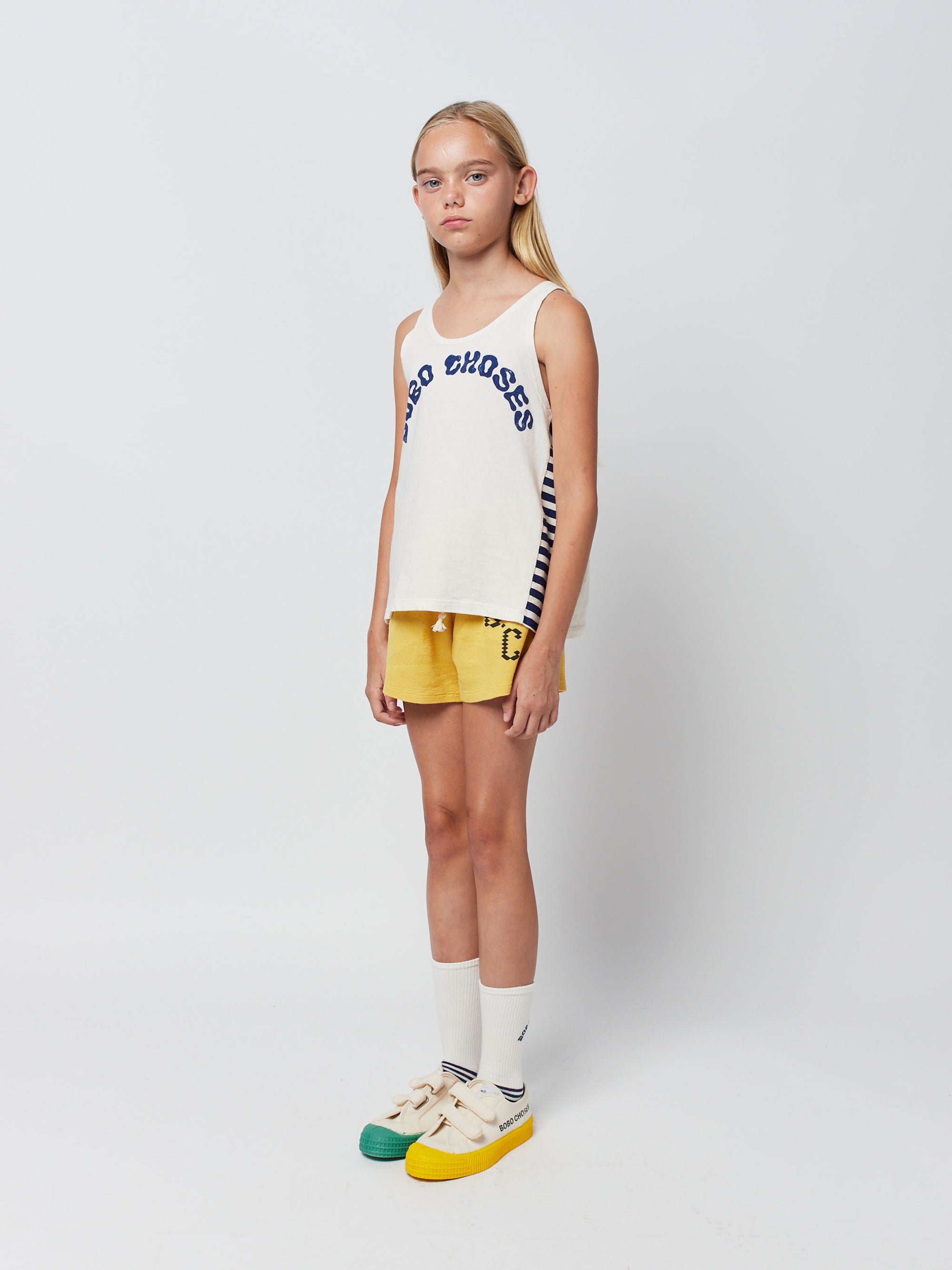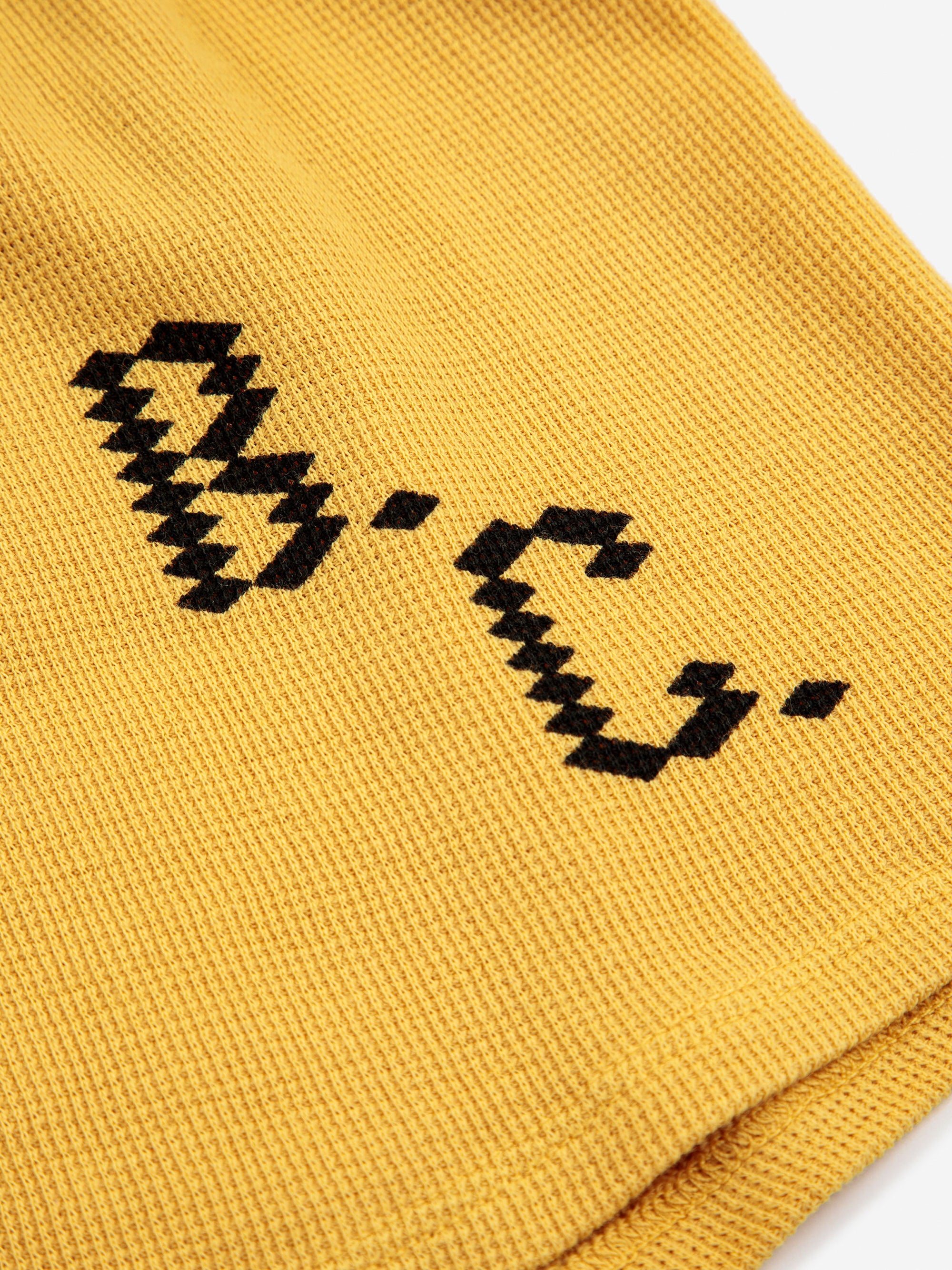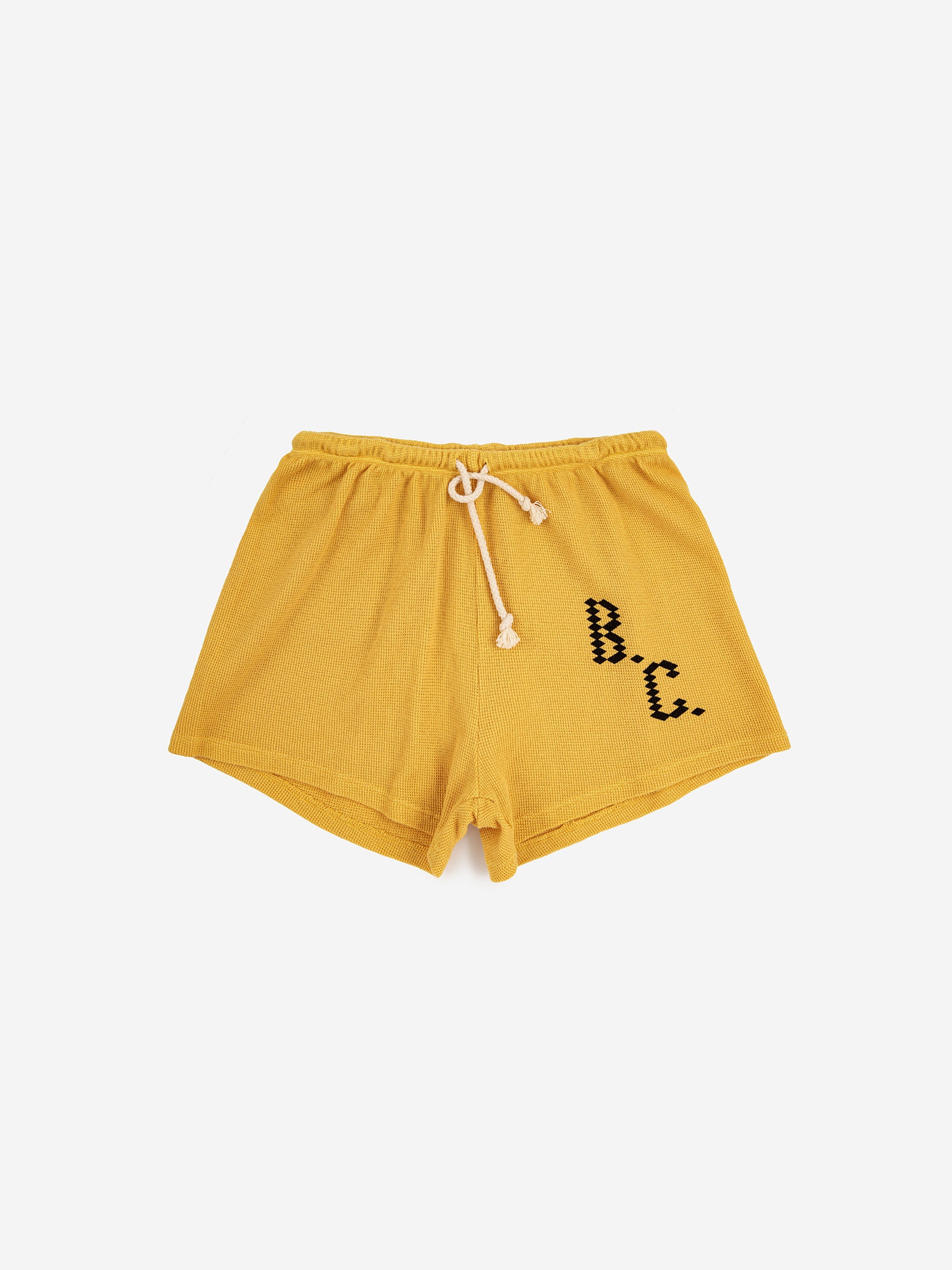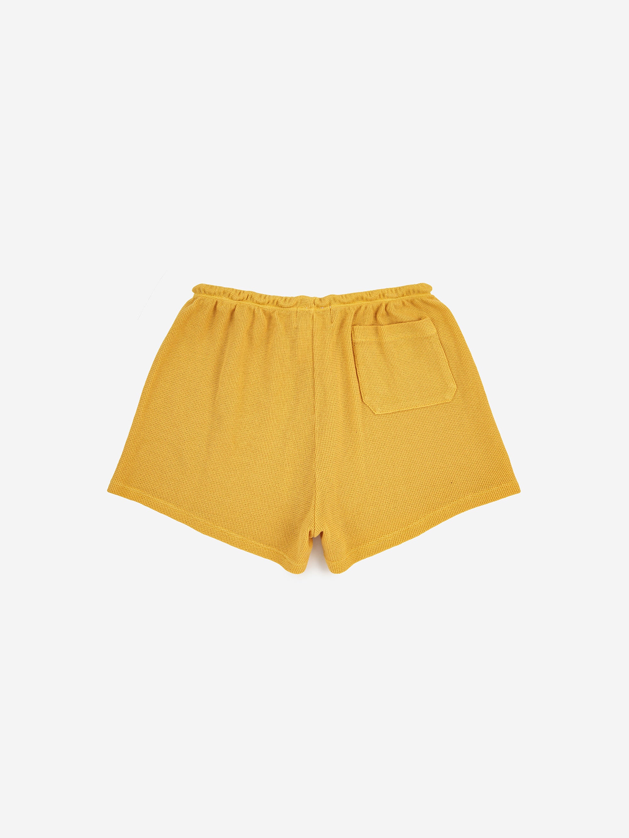 100% organic cotton yellow shorts. Designed with adjustable waistband, elasticated waistband and short. It has a slim fit. Made in Spain