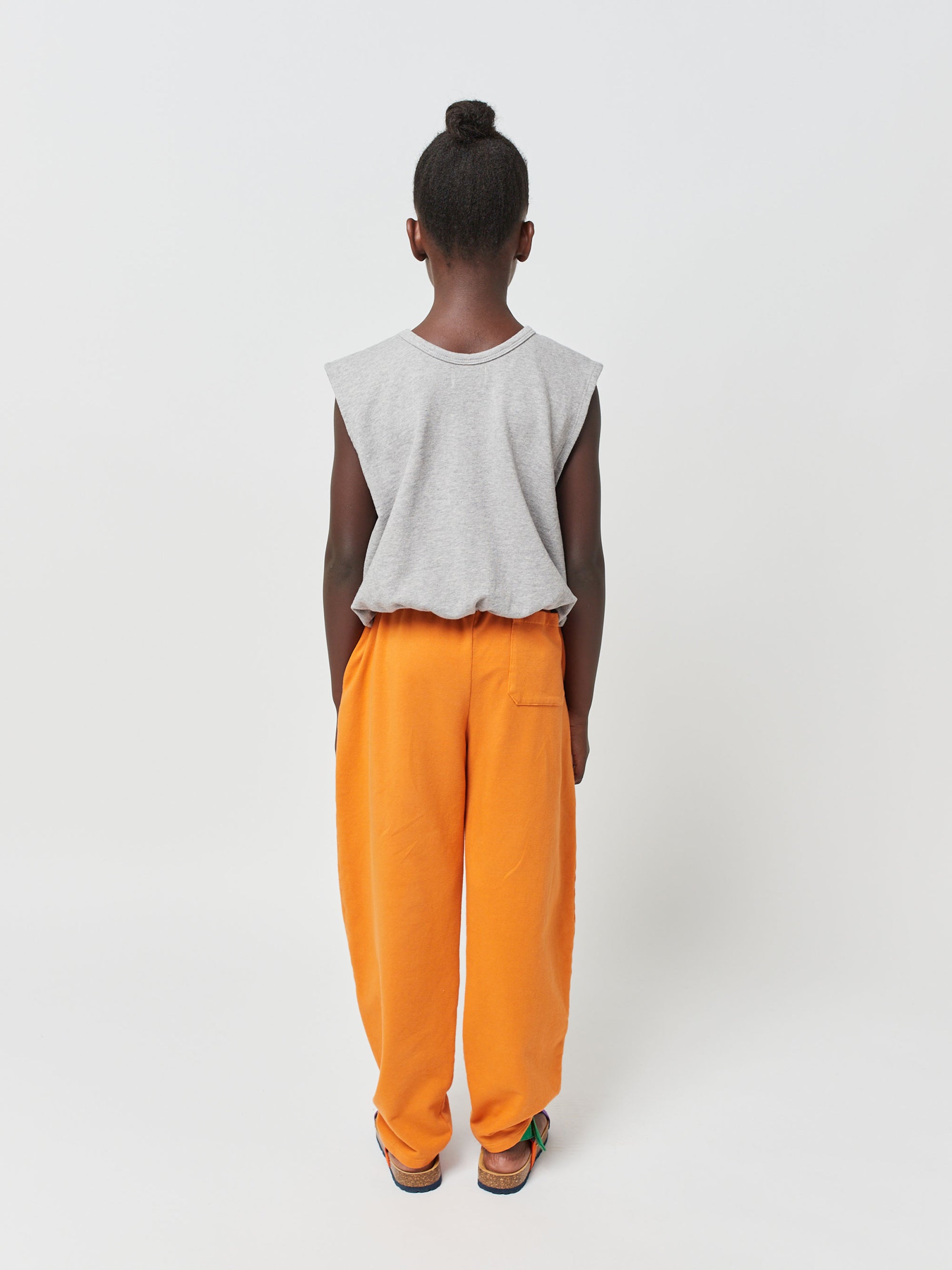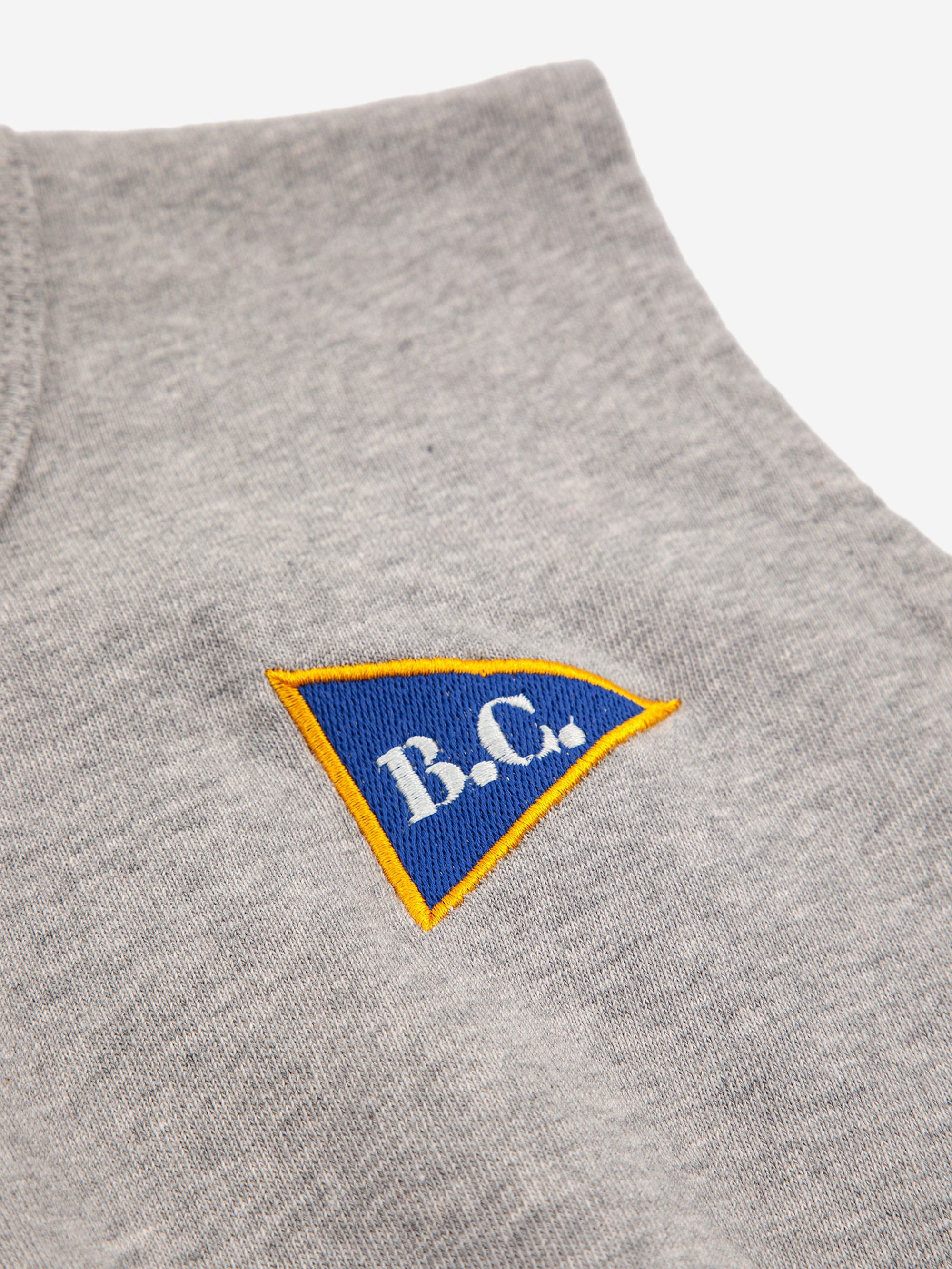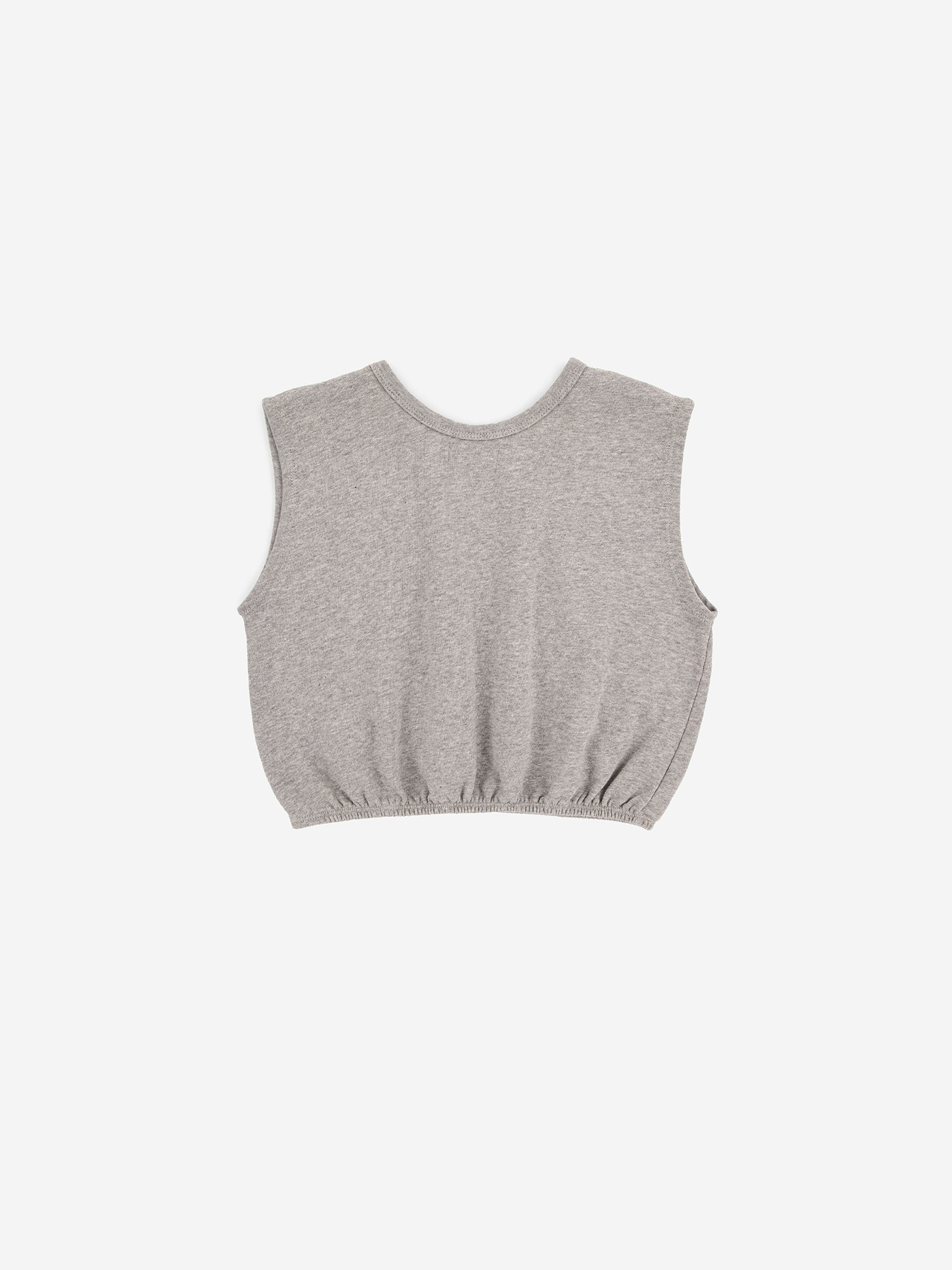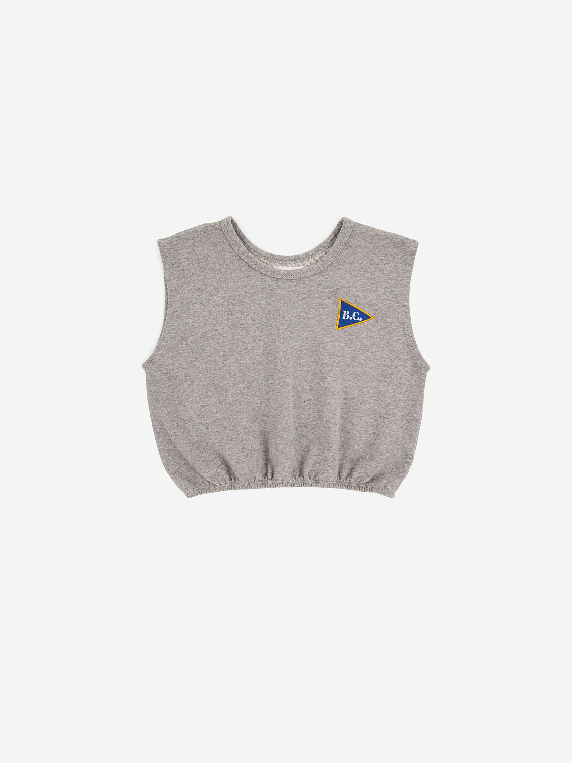 83% cotton 17% organic cotton heather grey sleeveless sweatshirt. Designed with sleeveless, elasticated bottom, round neck and cropped length. It has a loose fit. Made in Spain