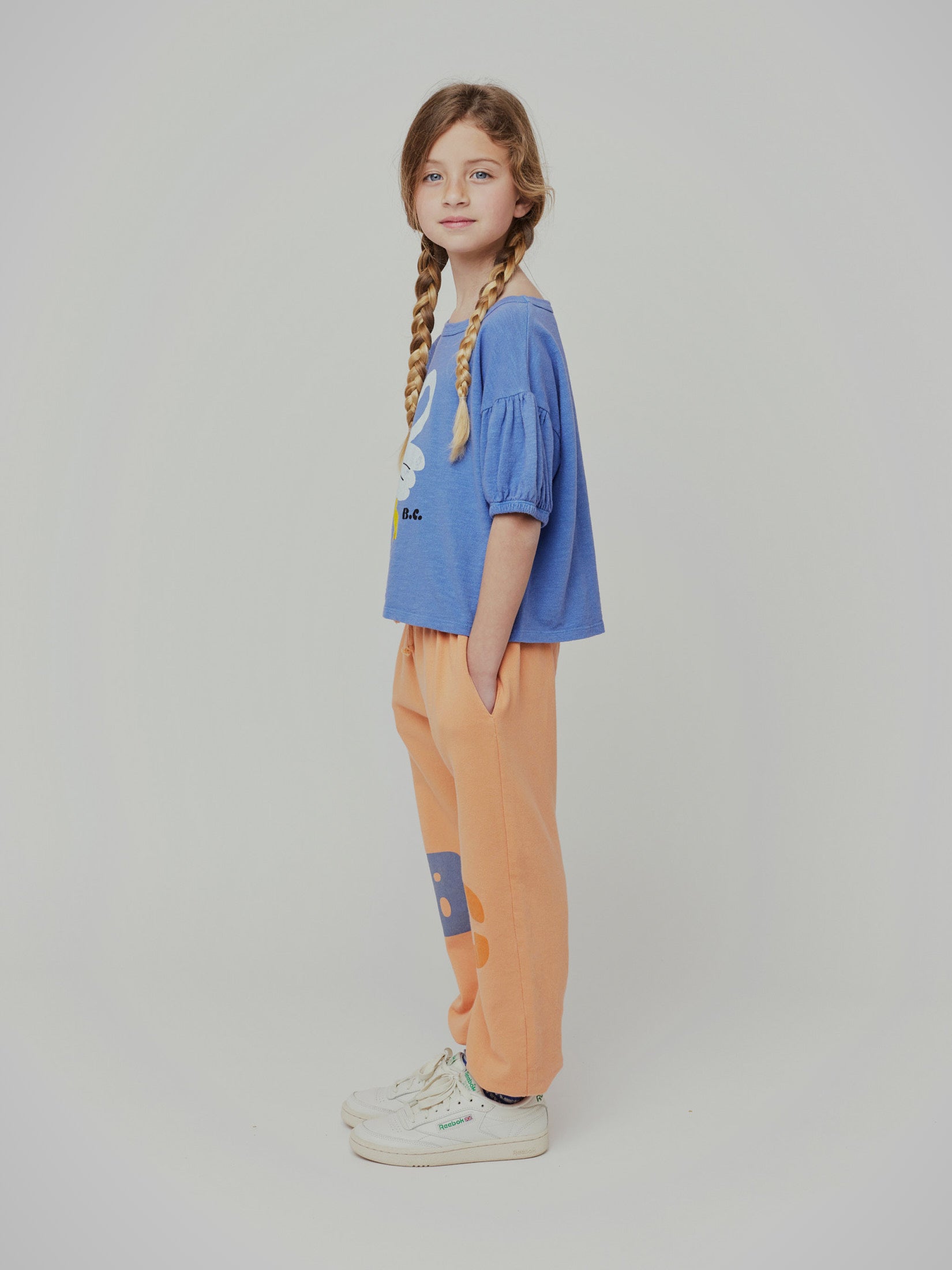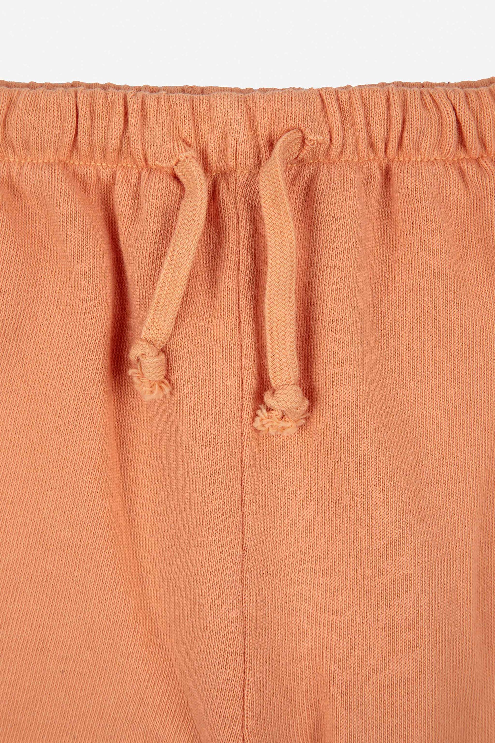 100% organic cotton peach jogging pants. Designed with elasticated bottom, elasticated waistband, regular, cord fastening and ankle length. It has a loose fit. Made in Spain