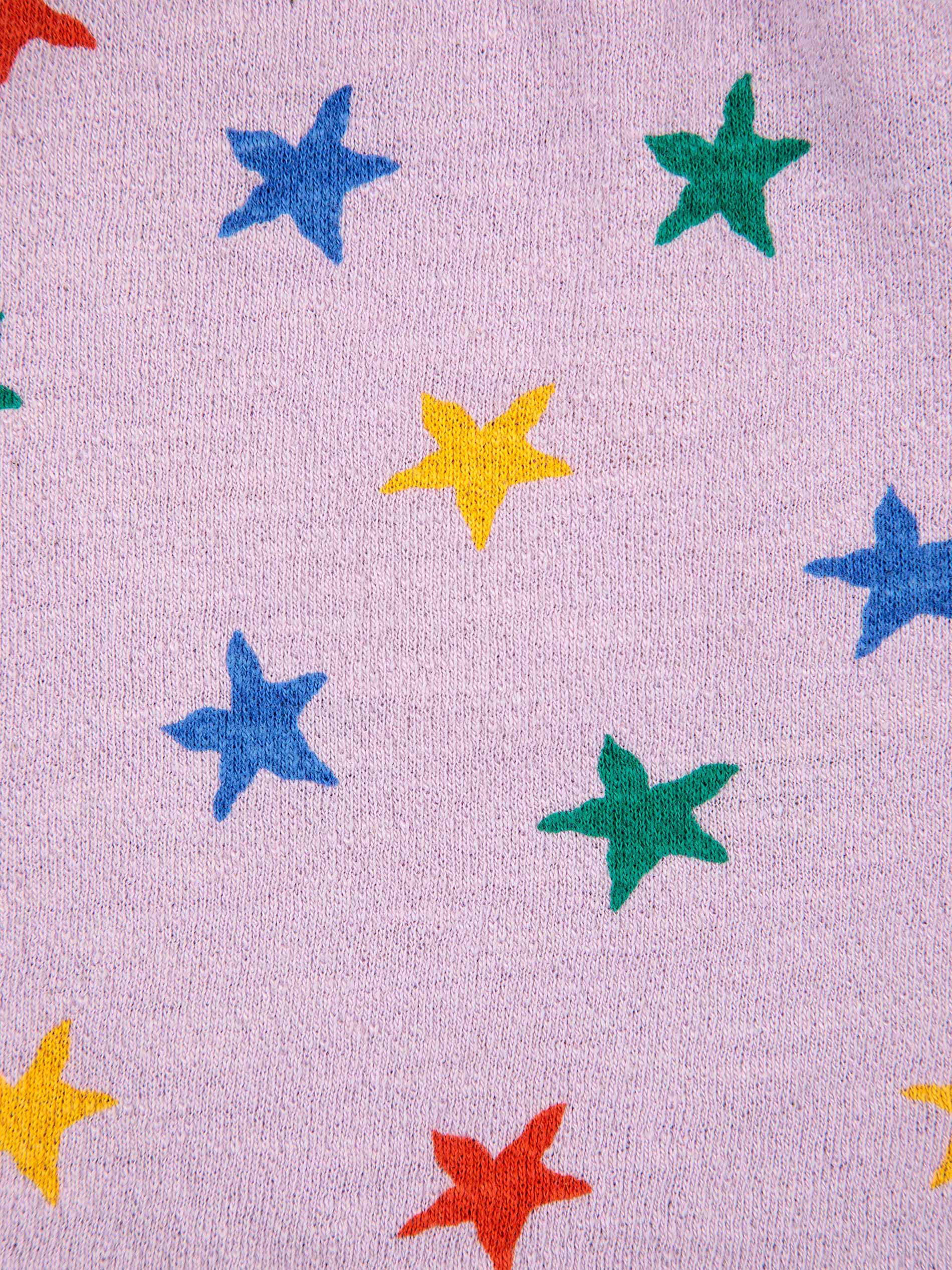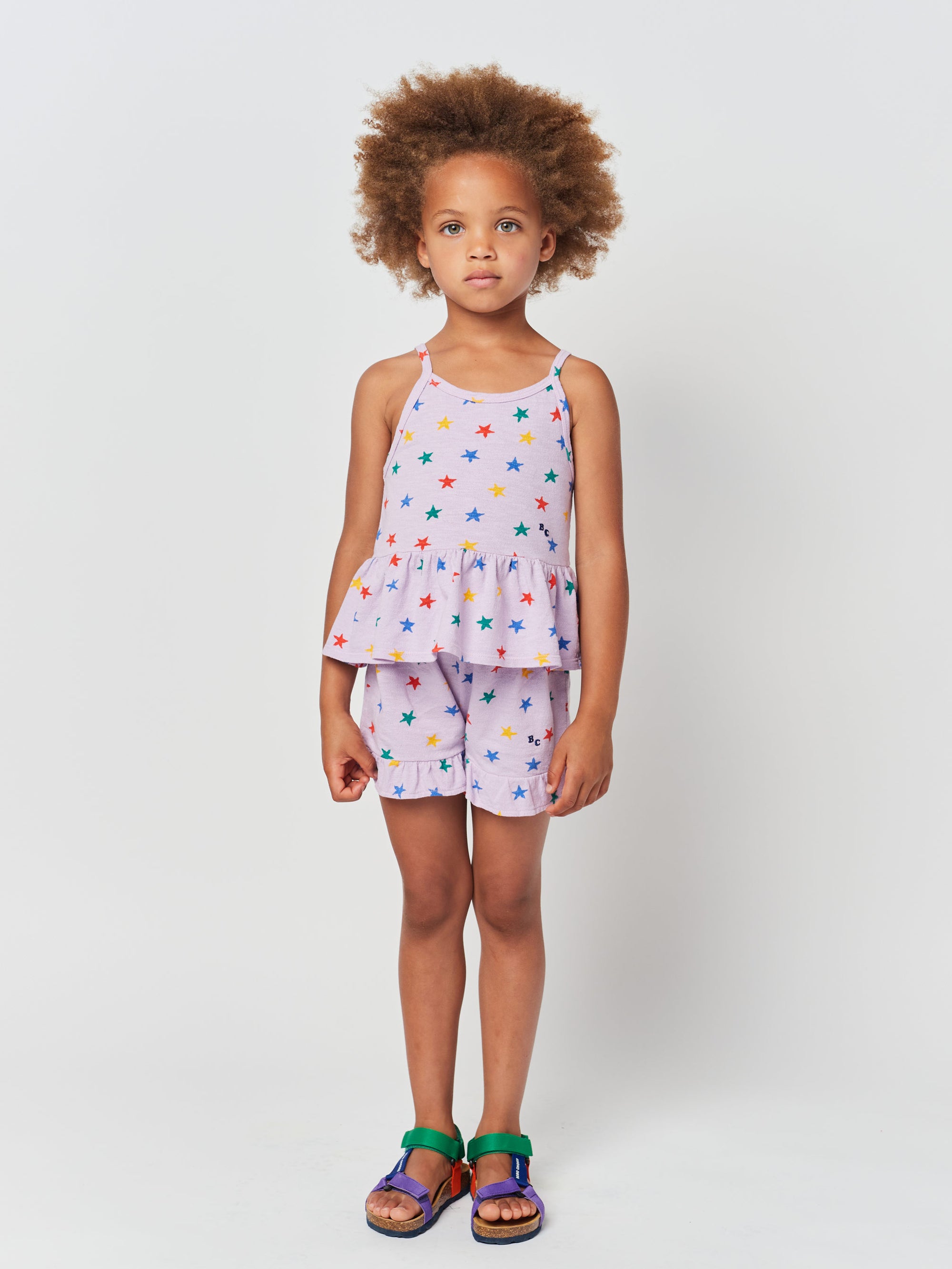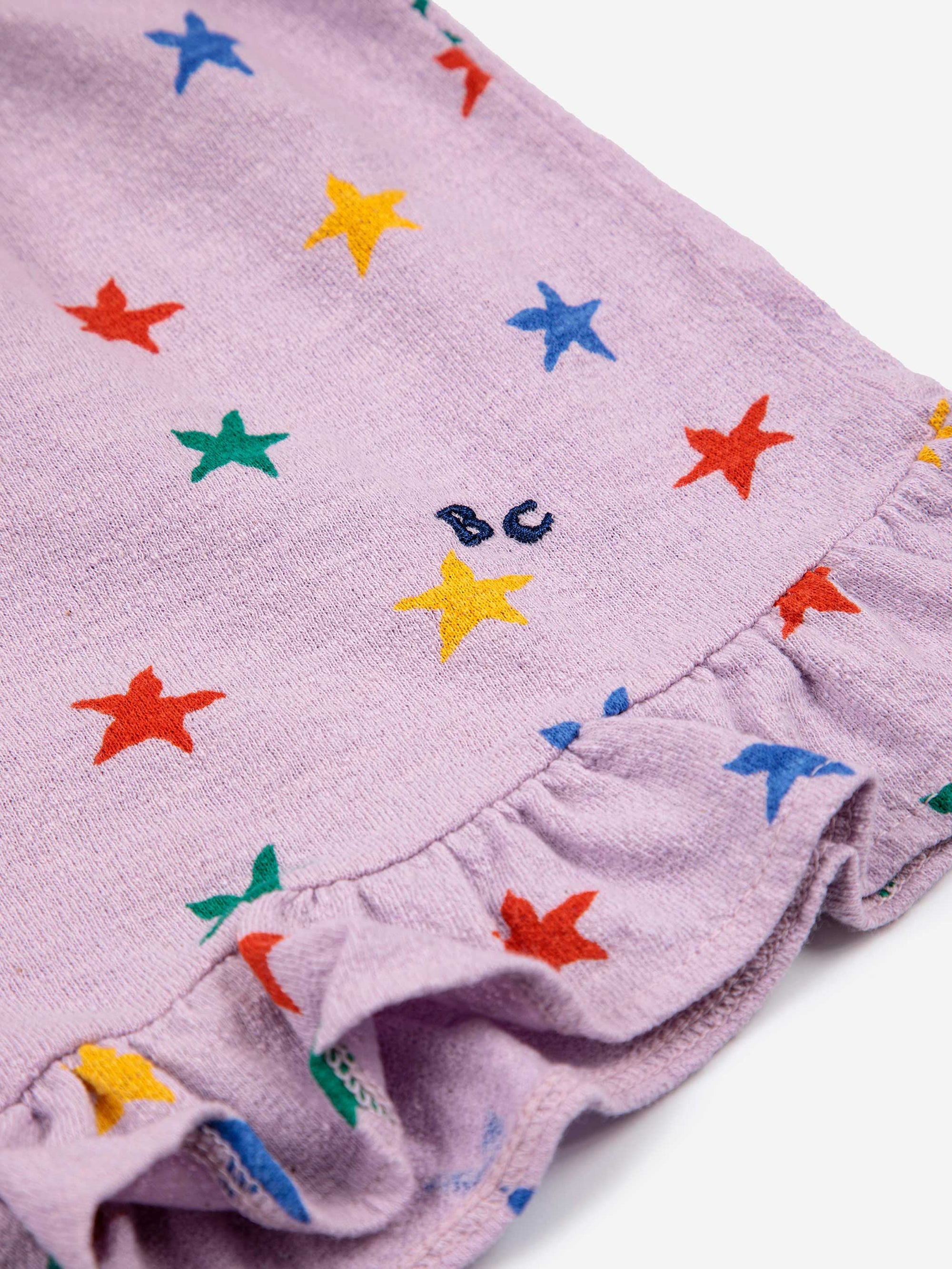 100% organic cotton lavender shorts. Designed with regular crotch, elasticated waistband, embroidery, short, rustic fabric and ruffle hem. It has a loose fit. Made in Spain