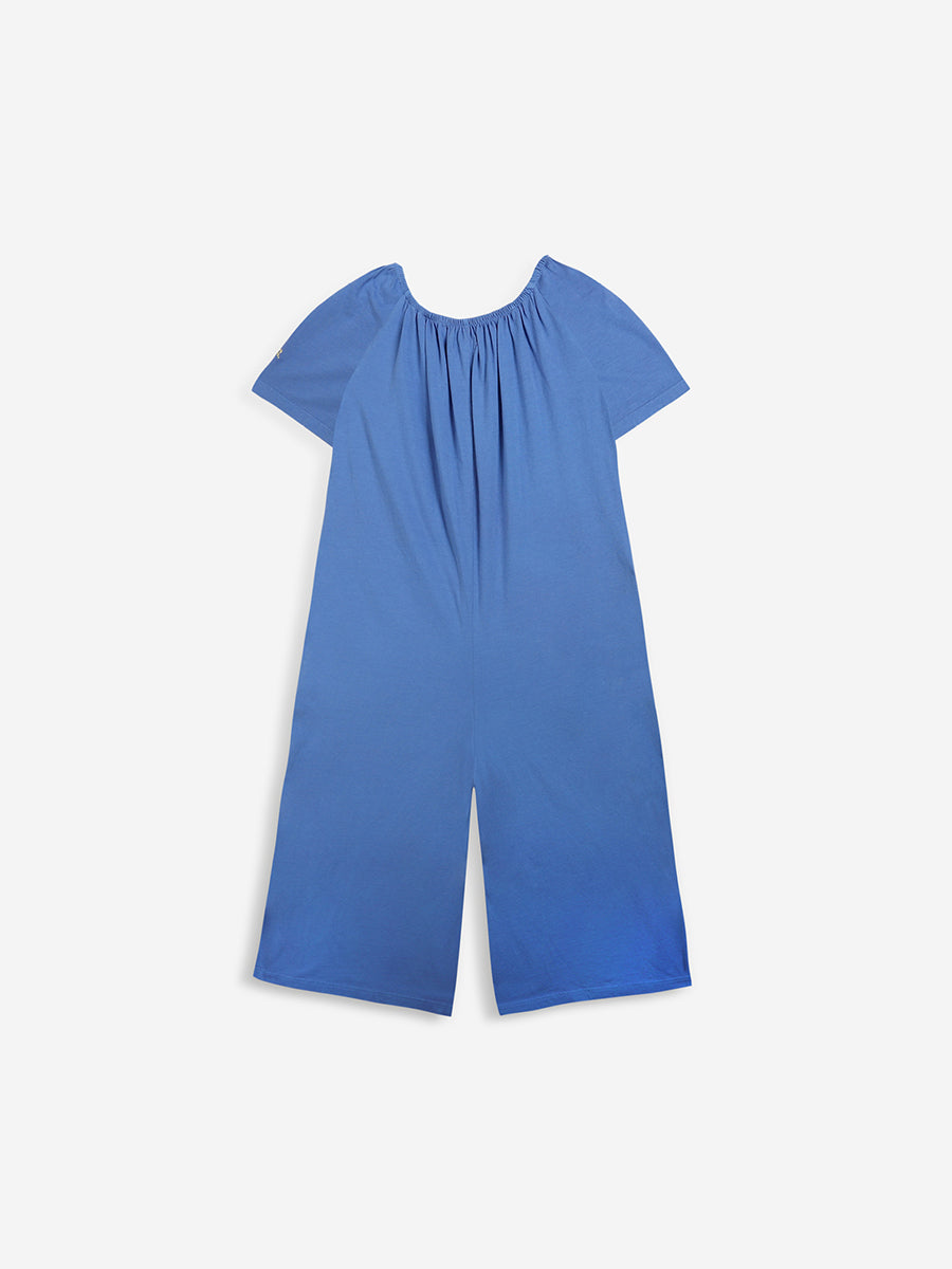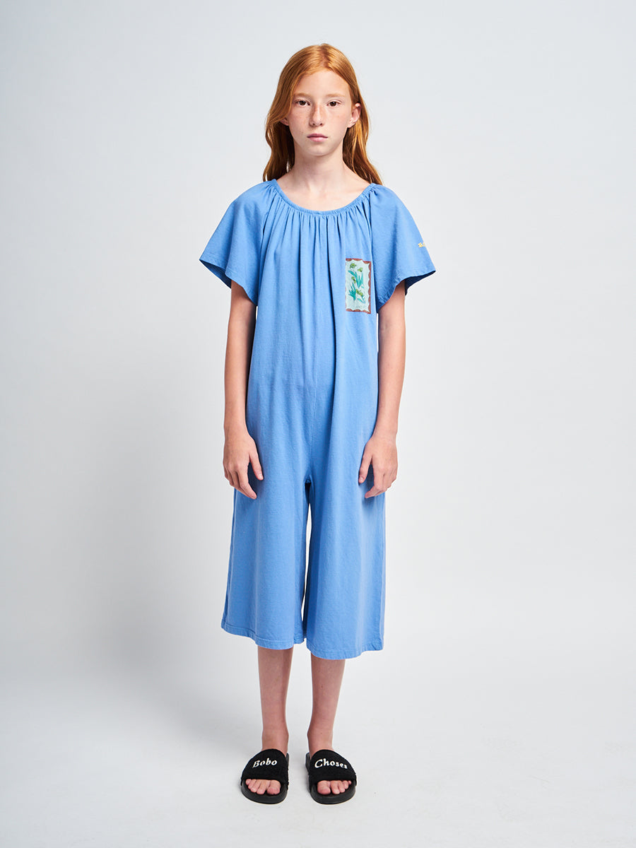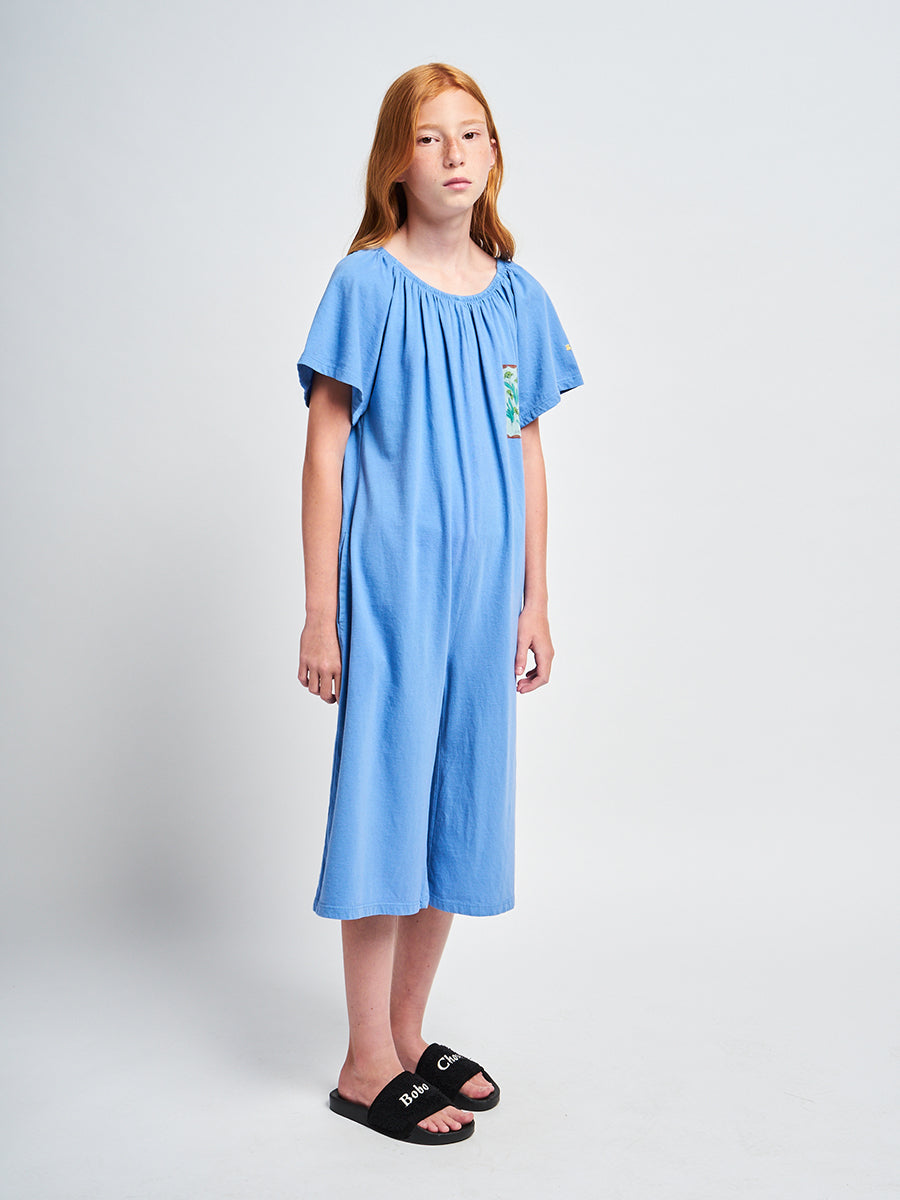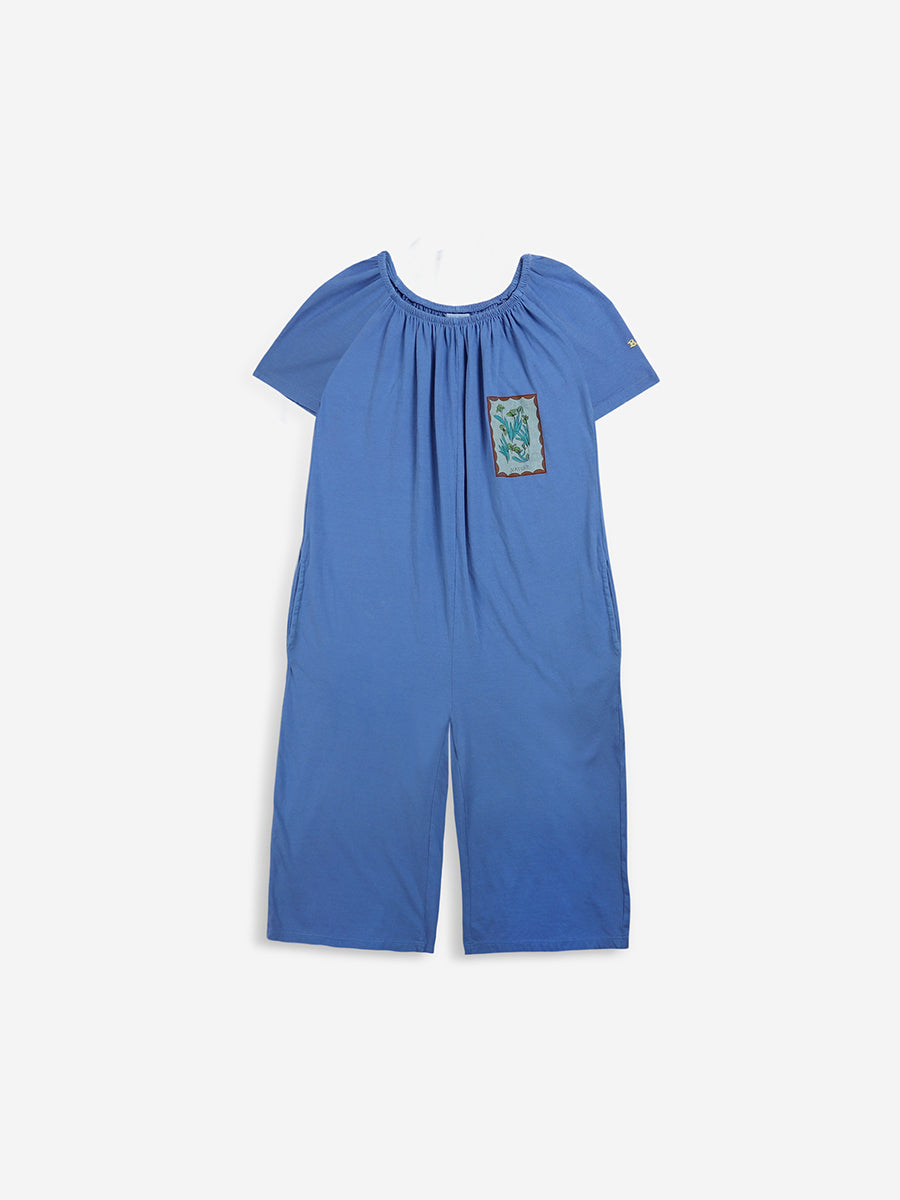 100% organic cotton. blue short sleeve overall. Designed with low crotch, embroidery, smocking stitching, midi length and off-the-shoulder. It has a evasé fit. Made in Spain This is an online exclusive item that belongs to our SS22 collection, I’m a Poet. It celebrates poetry and its’ attitude of constant surprise and wonder. All things before the poet’s eyes have the impact of what is seen for the first time. To look for beauty and emotion in the ordinary, the beautiful, and the not-so-beautiful is as much an act of rebellion as a vital necessity.