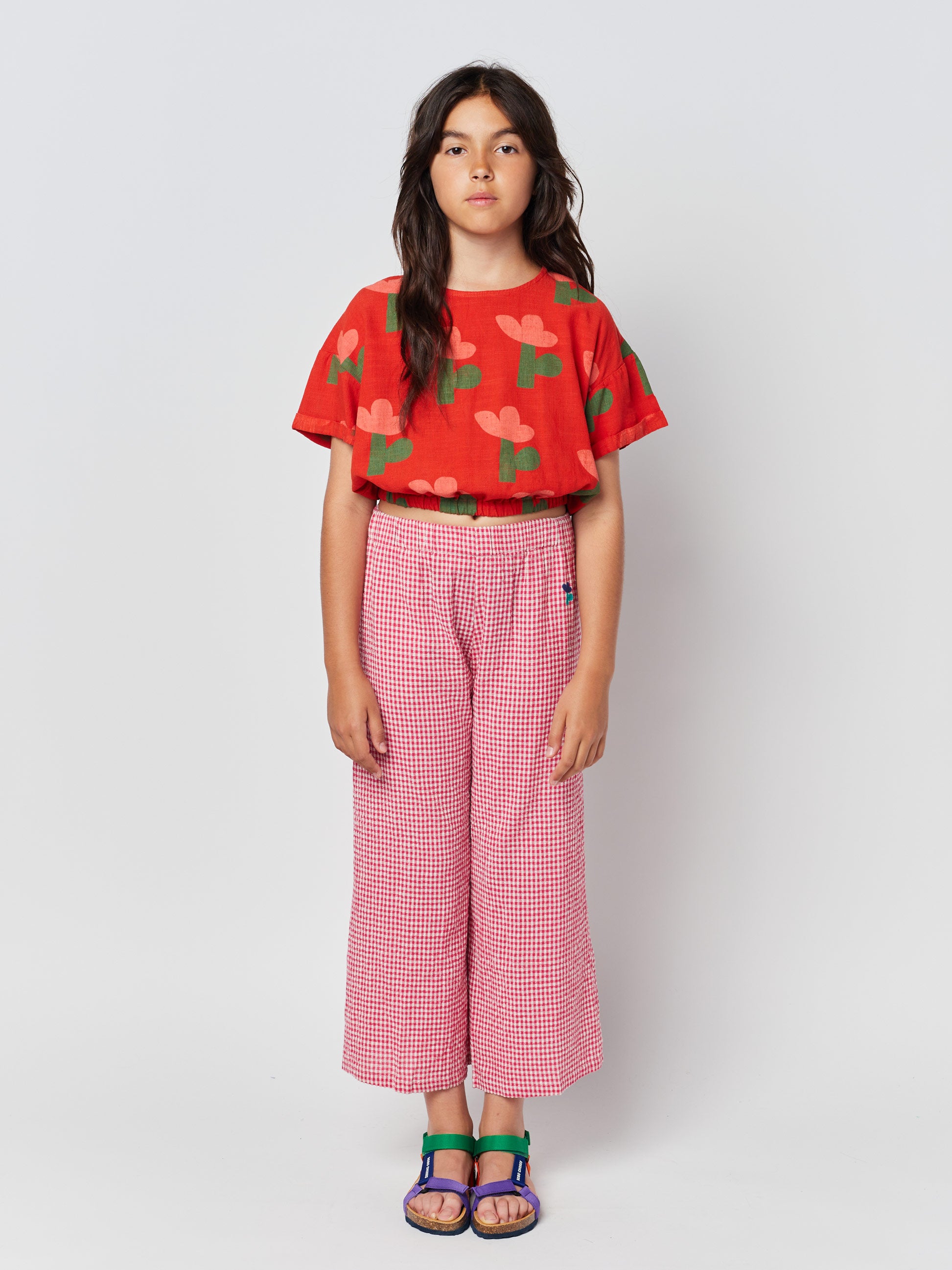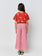 84% cotton 16% linen pink culotte pants. Designed with elasticated waistband. It has a flared fit. Made in India