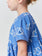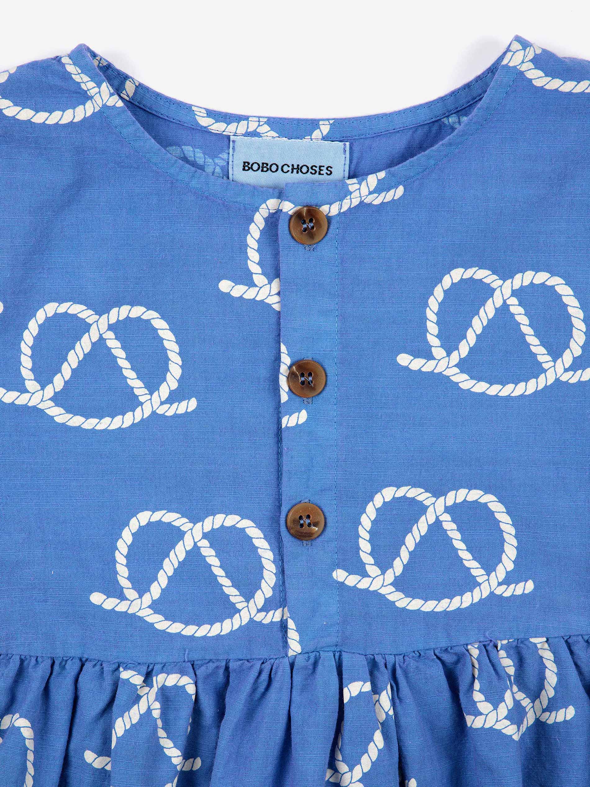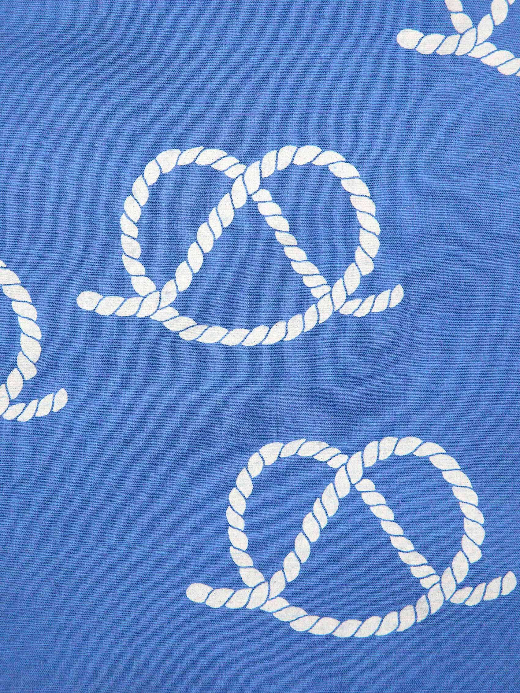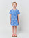 100% organic cotton blue short sleeve dress. Designed with front button fastening, embroidery and over knee length. It has a evasé fit. Made in Spain
